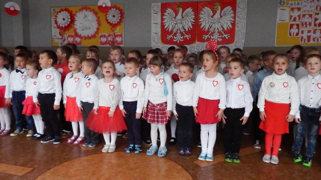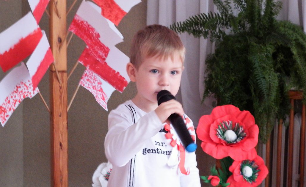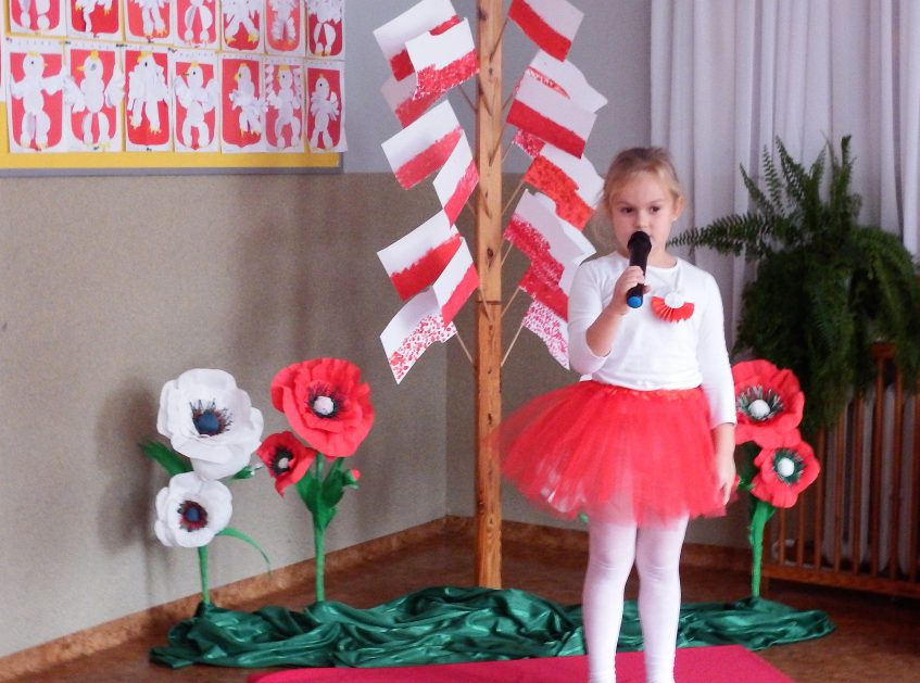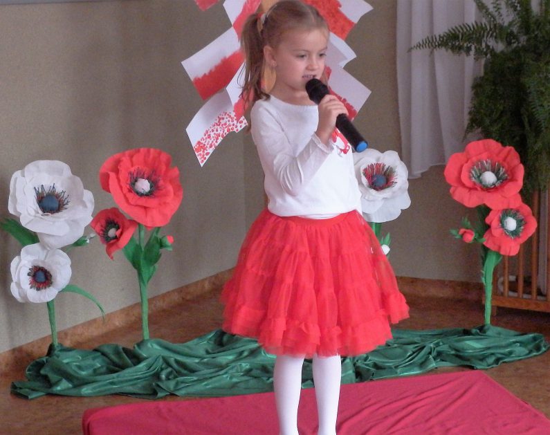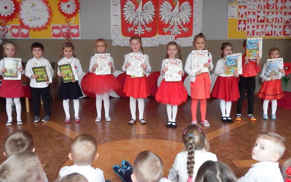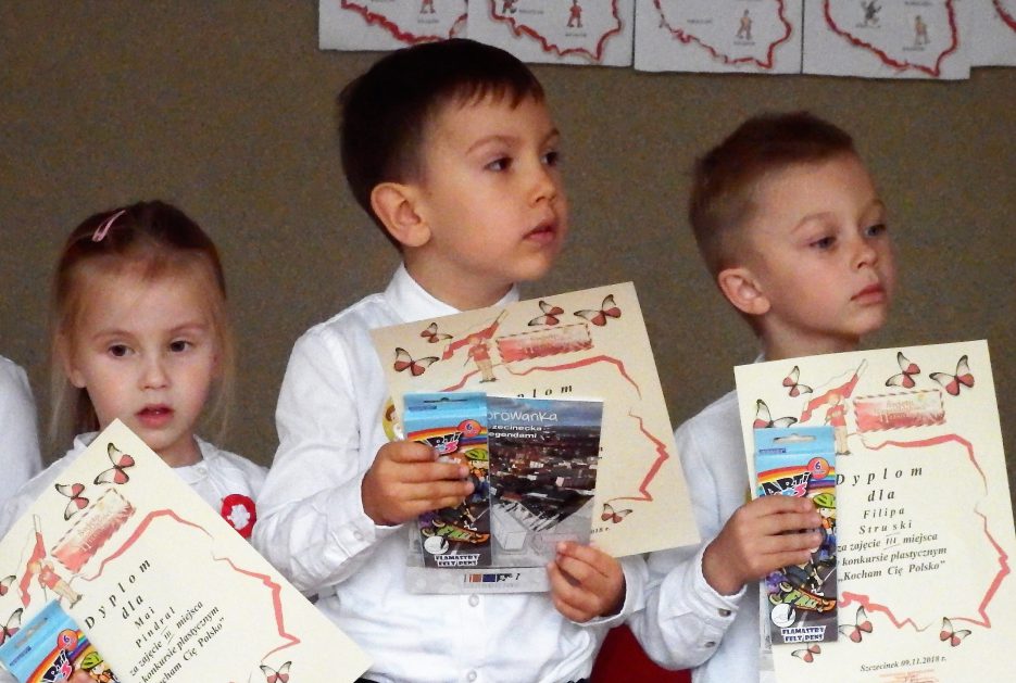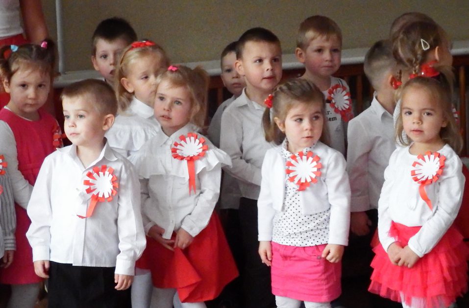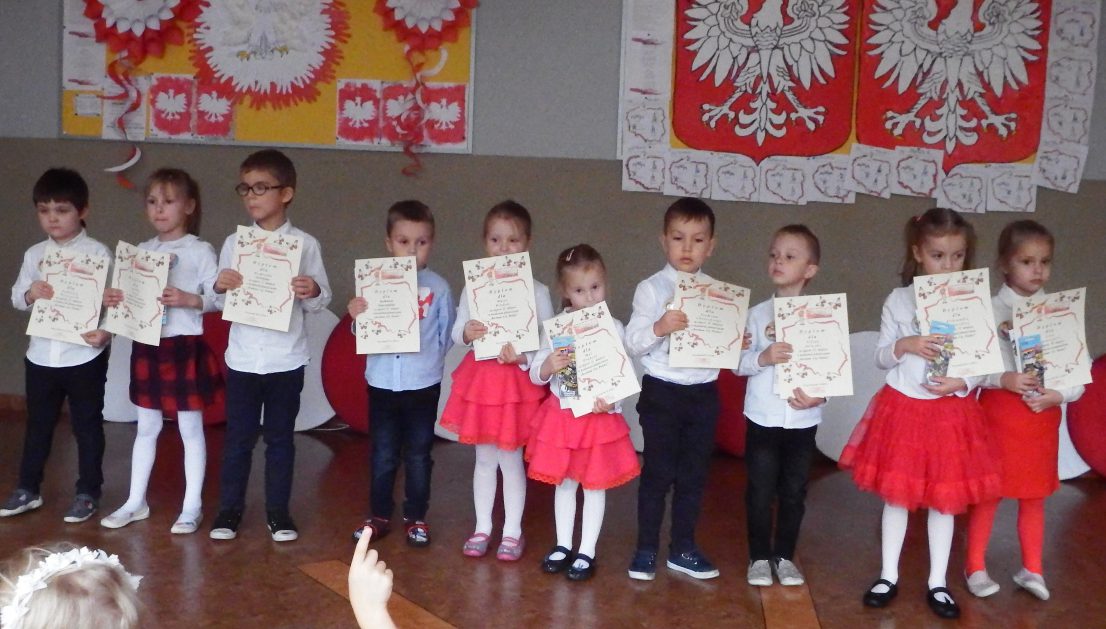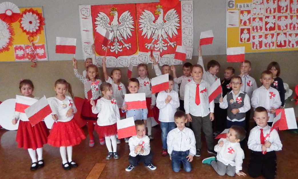 W naszym przedszkolu treści patriotyczne są bliskie dzieciom, każdy wie, że jest Polką i Polakiem, czego przykładem był przepiękny występ w Kinie „Wolność” na zakończenie roku. A w listopadzie rozpoczęliśmy działania dotyczące obchodów 100 – lecia Odzyskania przez Polskę Niepodległości. 9 listopada zaplanowane były konkursy: plastyczny i recytatorski pod hasłem „Kocham Cię Polsko”. Chętnych uczestników było dużo. Mimo trudnych treści dzieci poradziły sobie i pięknie recytowały wiersze o Polsce, a prace plastyczne dały dowód wiedzy i kreatywności dzieci. Podczas uroczystej akademii wszystkie przedszkolaki o godzinie 11: 11 odśpiewały hymn państwowy biorąc tym samym udział w akcji „Rekord dla Niepodległej” ogłoszonej przez Minister Edukacji Narodowej. Ten dzień był wyjątkowy i na pewno zapisał się w historii naszego przedszkola jako pamiątka dla przyszłych pokoleń.