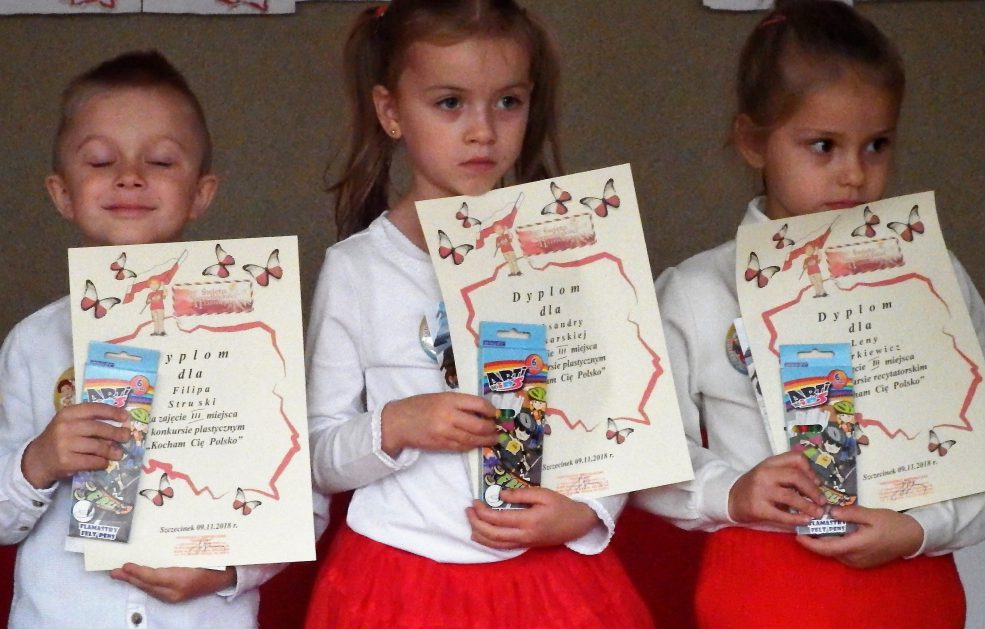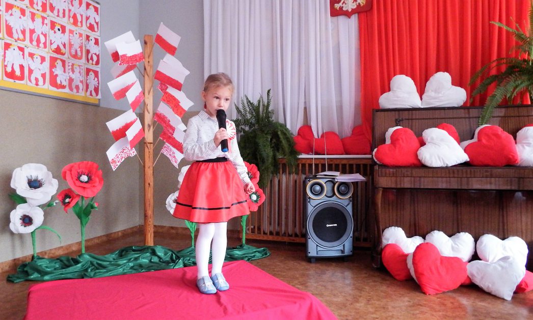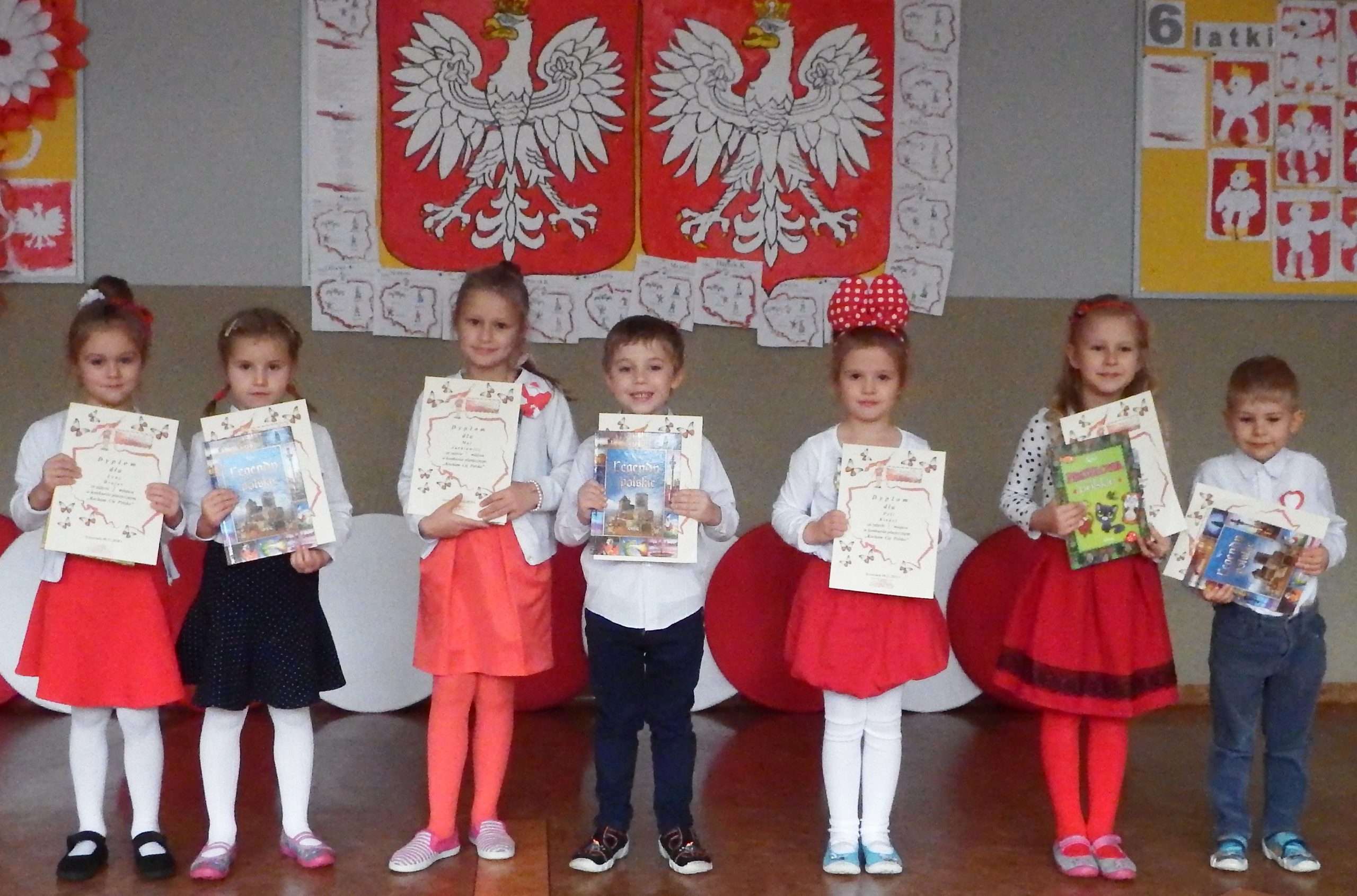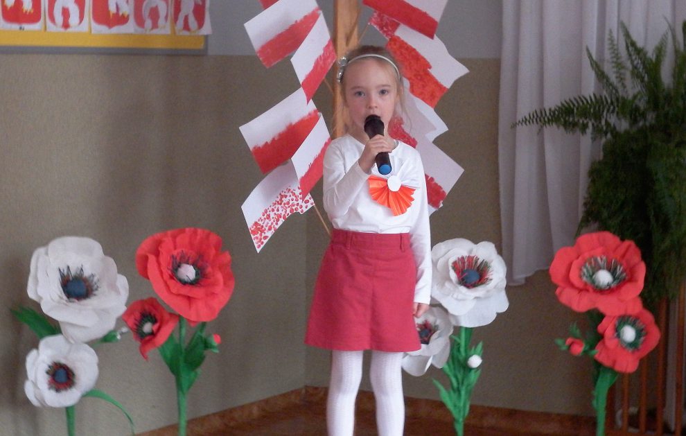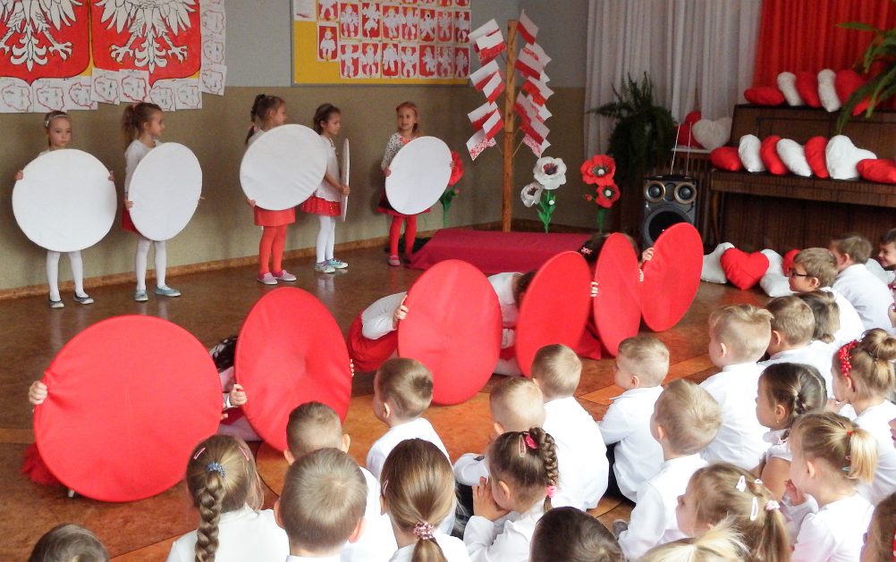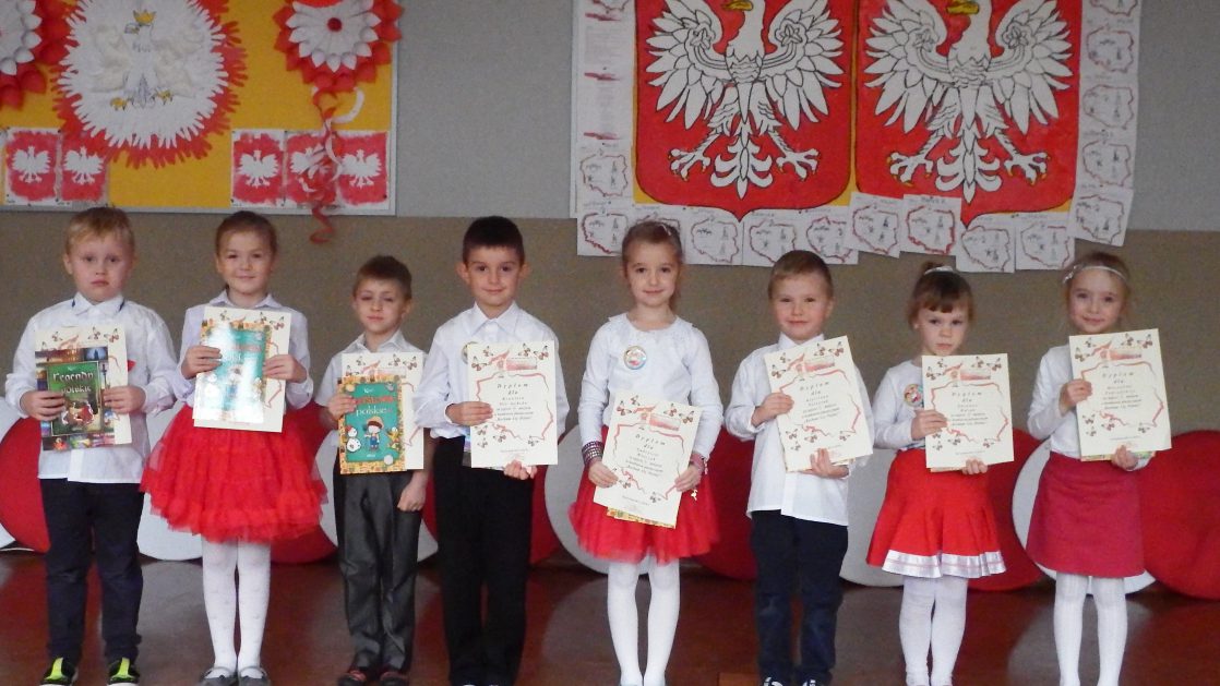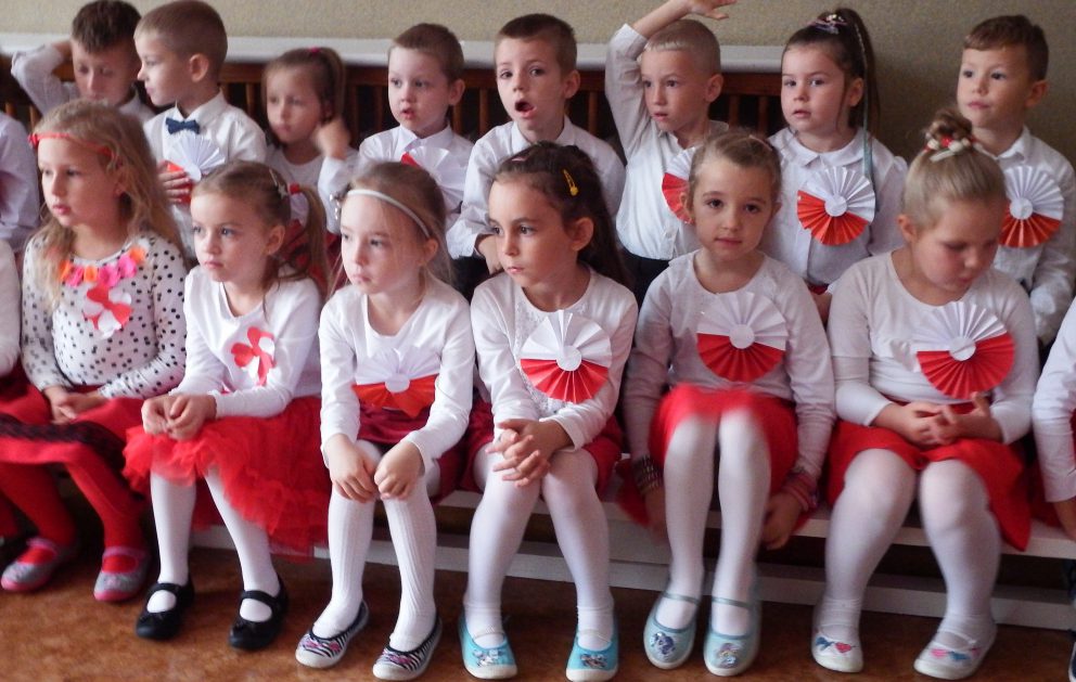 W naszym przedszkolu treści patriotyczne są bliskie dzieciom, każdy wie, że jest Polką i Polakiem, czego przykładem był przepiękny występ w Kinie „Wolność” na zakończenie roku. A w listopadzie rozpoczęliśmy działania dotyczące obchodów 100 – lecia Odzyskania przez Polskę Niepodległości. 9 listopada zaplanowane były konkursy: plastyczny i recytatorski pod hasłem „Kocham Cię Polsko”. Chętnych uczestników było dużo. Mimo trudnych treści dzieci poradziły sobie i pięknie recytowały wiersze o Polsce, a prace plastyczne dały dowód wiedzy i kreatywności dzieci. Podczas uroczystej akademii wszystkie przedszkolaki o godzinie 11: 11 odśpiewały hymn państwowy biorąc tym samym udział w akcji „Rekord dla Niepodległej” ogłoszonej przez Minister Edukacji Narodowej. Ten dzień był wyjątkowy i na pewno zapisał się w historii naszego przedszkola jako pamiątka dla przyszłych pokoleń.
