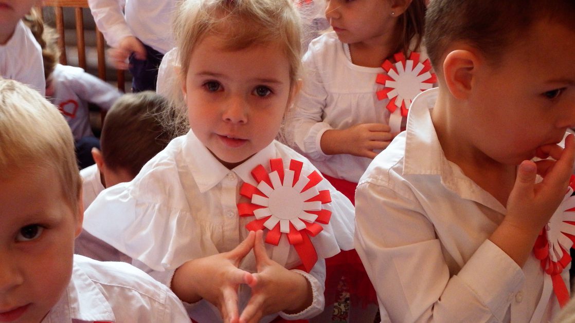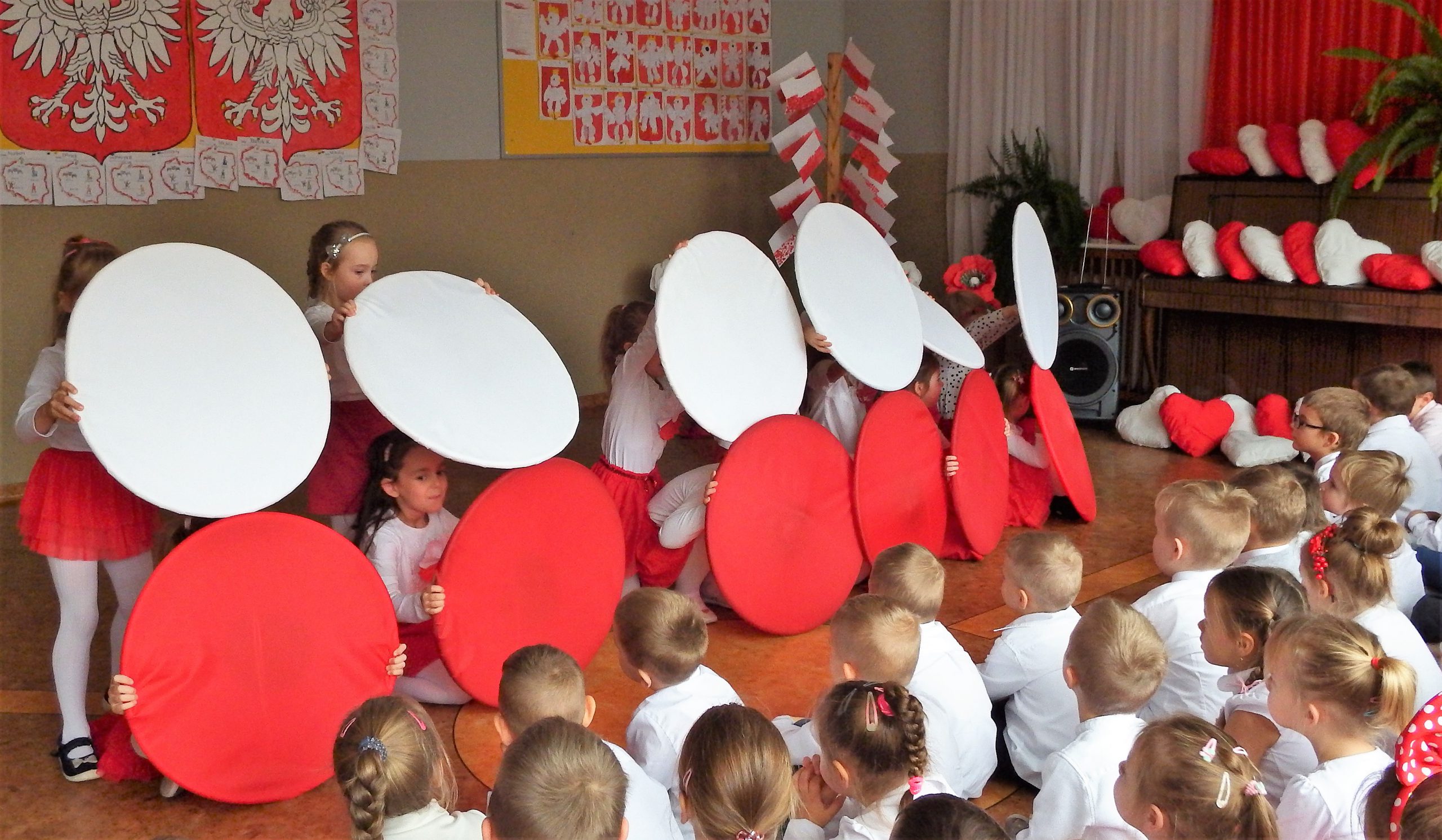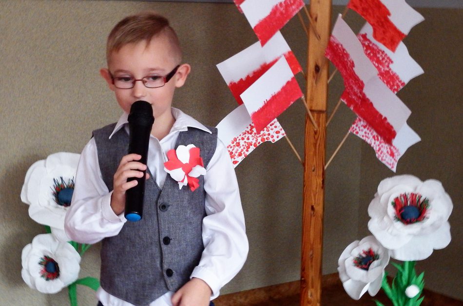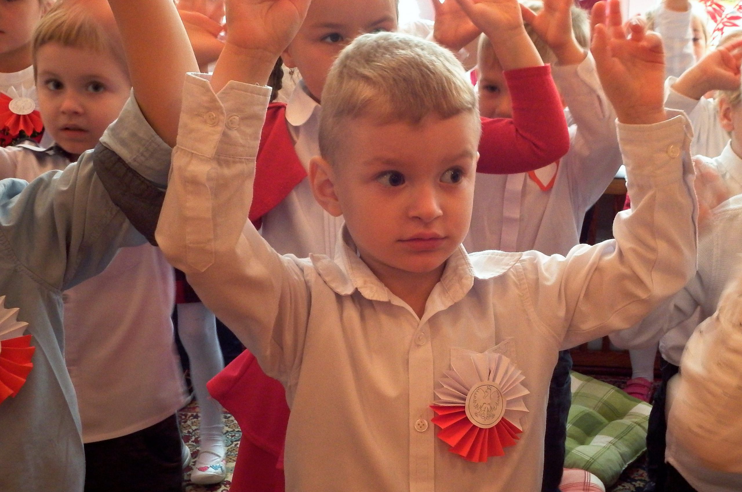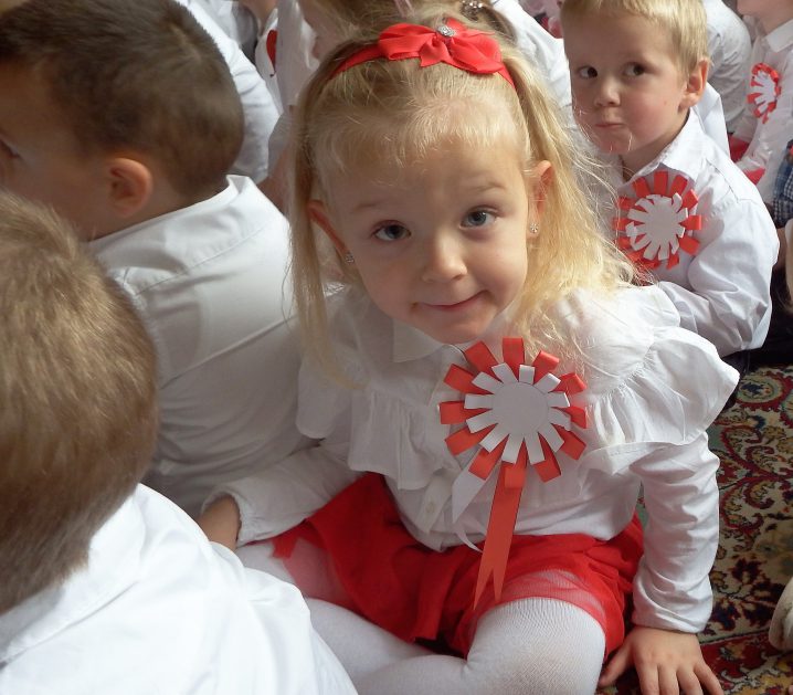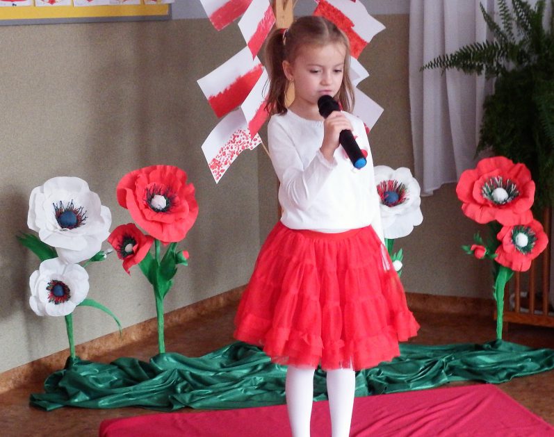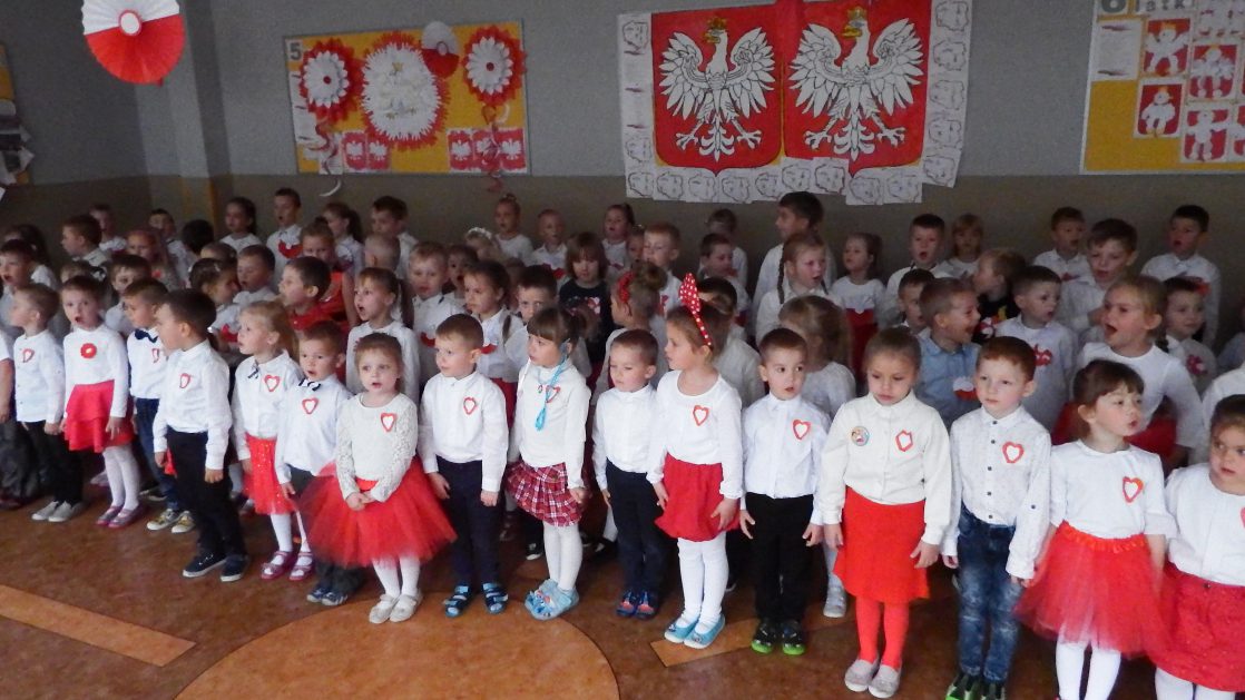 W naszym przedszkolu treści patriotyczne są bliskie dzieciom, każdy wie, że jest Polką i Polakiem, czego przykładem był przepiękny występ w Kinie „Wolność” na zakończenie roku. A w listopadzie rozpoczęliśmy działania dotyczące obchodów 100 – lecia Odzyskania przez Polskę Niepodległości. 9 listopada zaplanowane były konkursy: plastyczny i recytatorski pod hasłem „Kocham Cię Polsko”. Chętnych uczestników było dużo. Mimo trudnych treści dzieci poradziły sobie i pięknie recytowały wiersze o Polsce, a prace plastyczne dały dowód wiedzy i kreatywności dzieci. Podczas uroczystej akademii wszystkie przedszkolaki o godzinie 11: 11 odśpiewały hymn państwowy biorąc tym samym udział w akcji „Rekord dla Niepodległej” ogłoszonej przez Minister Edukacji Narodowej. Ten dzień był wyjątkowy i na pewno zapisał się w historii naszego przedszkola jako pamiątka dla przyszłych pokoleń.