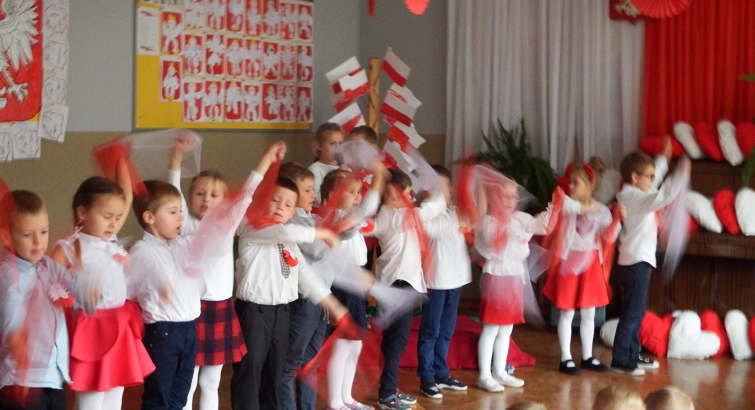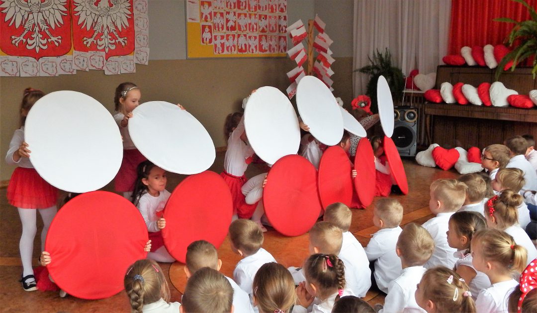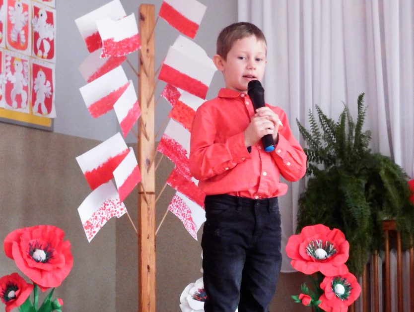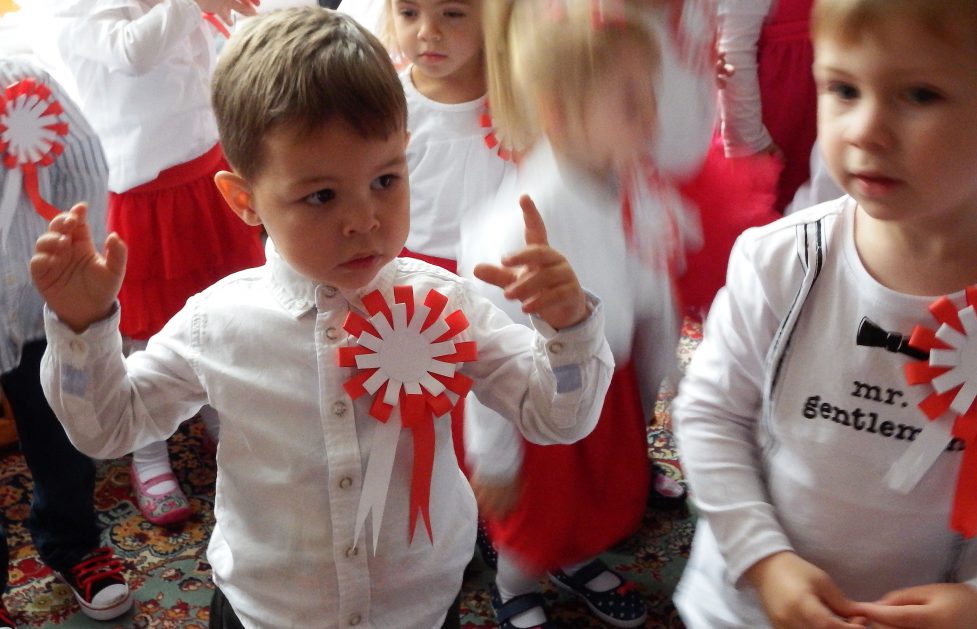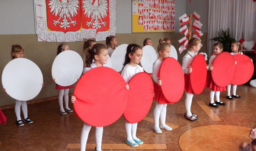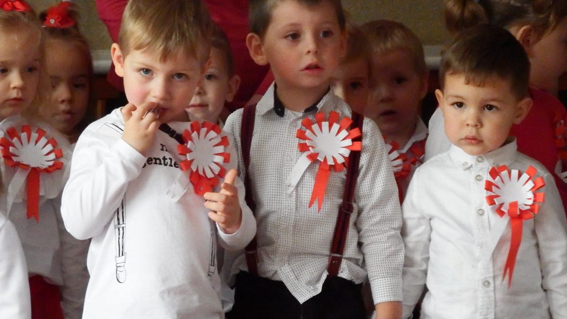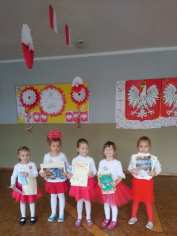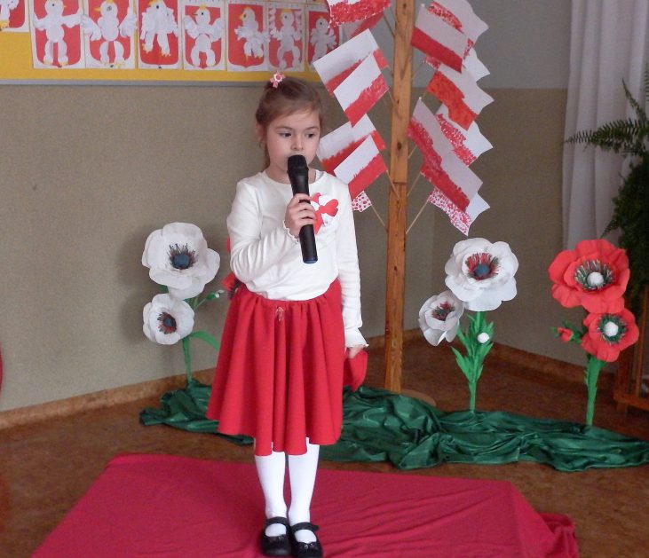 W naszym przedszkolu treści patriotyczne są bliskie dzieciom, każdy wie, że jest Polką i Polakiem, czego przykładem był przepiękny występ w Kinie „Wolność” na zakończenie roku. A w listopadzie rozpoczęliśmy działania dotyczące obchodów 100 – lecia Odzyskania przez Polskę Niepodległości. 9 listopada zaplanowane były konkursy: plastyczny i recytatorski pod hasłem „Kocham Cię Polsko”. Chętnych uczestników było dużo. Mimo trudnych treści dzieci poradziły sobie i pięknie recytowały wiersze o Polsce, a prace plastyczne dały dowód wiedzy i kreatywności dzieci. Podczas uroczystej akademii wszystkie przedszkolaki o godzinie 11: 11 odśpiewały hymn państwowy biorąc tym samym udział w akcji „Rekord dla Niepodległej” ogłoszonej przez Minister Edukacji Narodowej. Ten dzień był wyjątkowy i na pewno zapisał się w historii naszego przedszkola jako pamiątka dla przyszłych pokoleń.