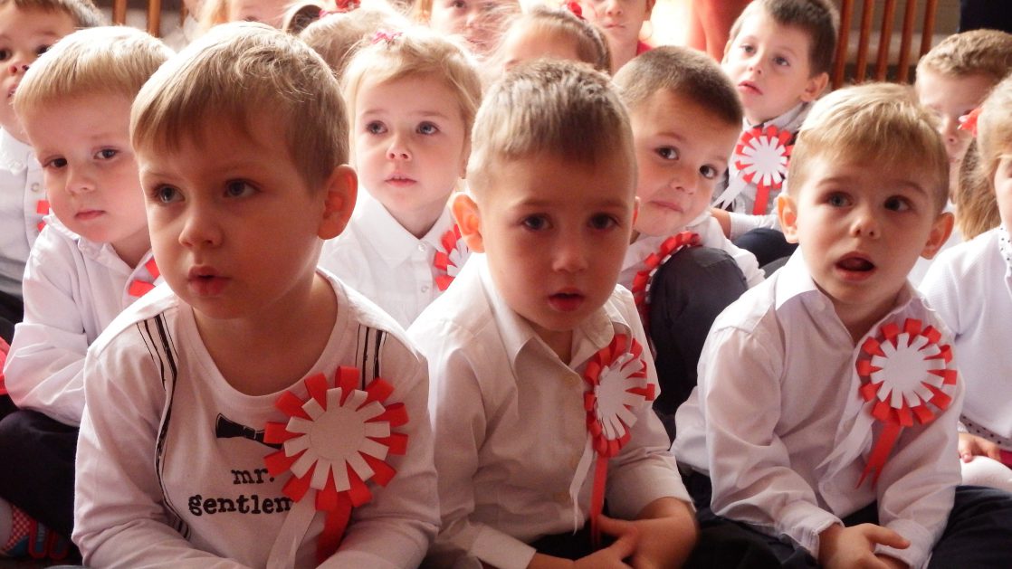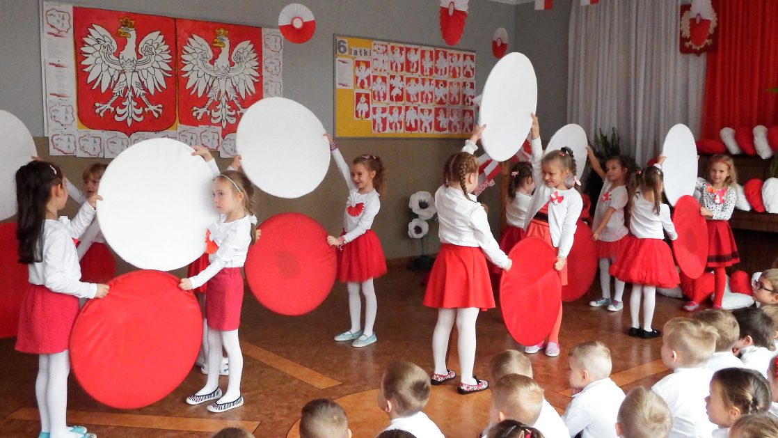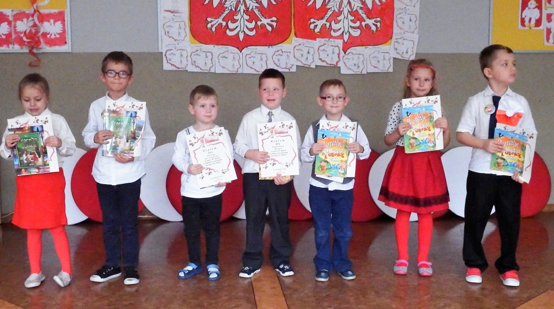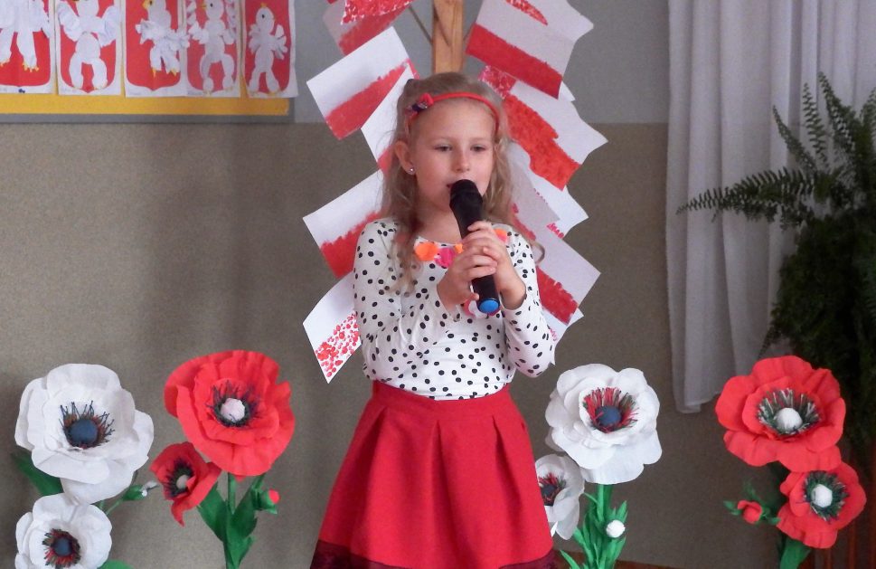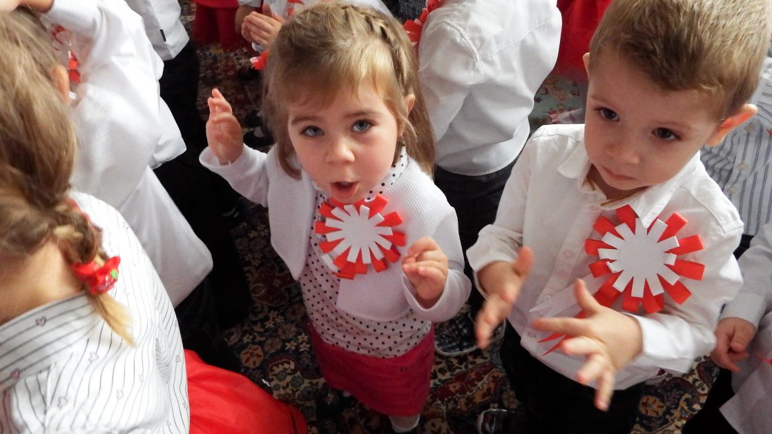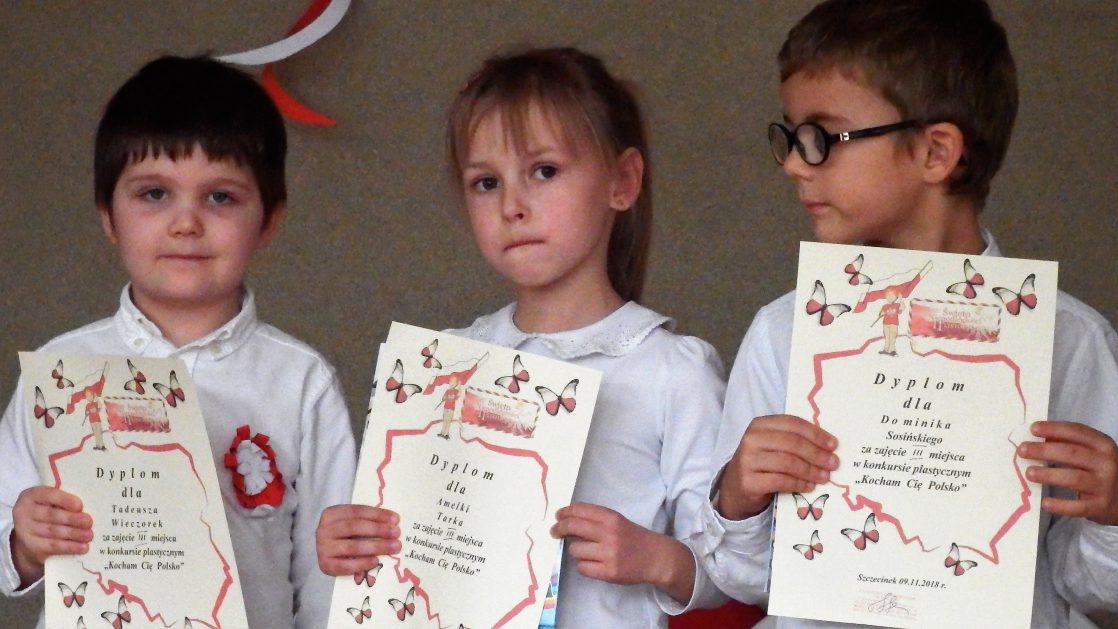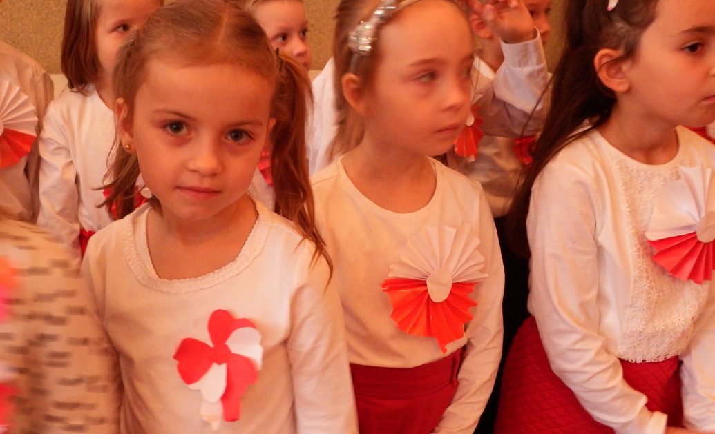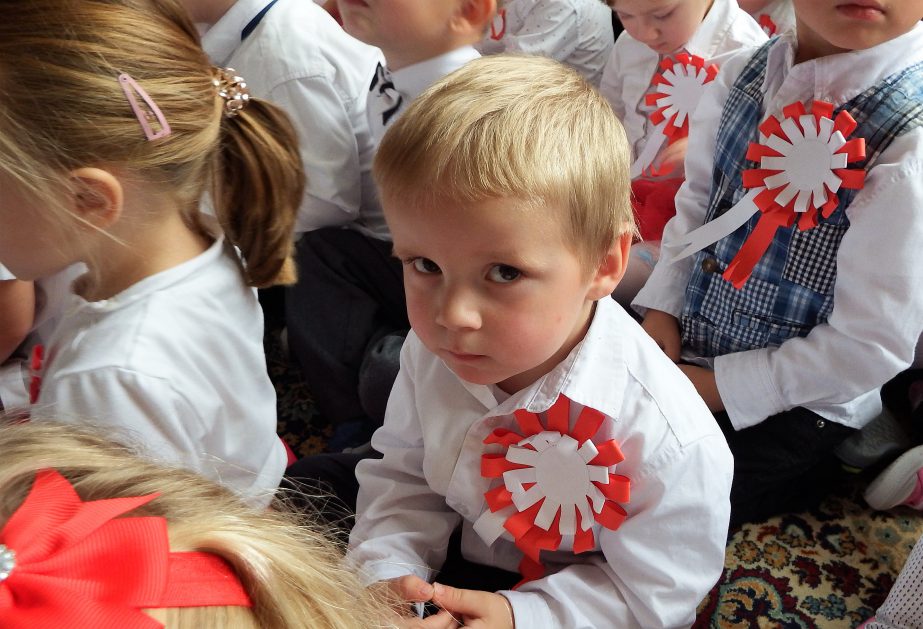 W naszym przedszkolu treści patriotyczne są bliskie dzieciom, każdy wie, że jest Polką i Polakiem, czego przykładem był przepiękny występ w Kinie „Wolność” na zakończenie roku. A w listopadzie rozpoczęliśmy działania dotyczące obchodów 100 – lecia Odzyskania przez Polskę Niepodległości. 9 listopada zaplanowane były konkursy: plastyczny i recytatorski pod hasłem „Kocham Cię Polsko”. Chętnych uczestników było dużo. Mimo trudnych treści dzieci poradziły sobie i pięknie recytowały wiersze o Polsce, a prace plastyczne dały dowód wiedzy i kreatywności dzieci. Podczas uroczystej akademii wszystkie przedszkolaki o godzinie 11: 11 odśpiewały hymn państwowy biorąc tym samym udział w akcji „Rekord dla Niepodległej” ogłoszonej przez Minister Edukacji Narodowej. Ten dzień był wyjątkowy i na pewno zapisał się w historii naszego przedszkola jako pamiątka dla przyszłych pokoleń.