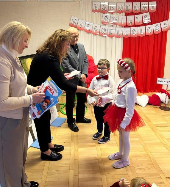 7 listopada odbyła się w naszym przedszkolu konkurs recytatorski „Przedszkolak – mały patriota”, konkurs skierowany był do dzieci starszych 5 i 6 latków. Celem konkursu było rozwijanie zdolności recytatorskich dzieci, upowszechnianie piękna mowy ojczystej poprzez polską poezję, propagowanie postawy patriotycznej. Budzenie świadomości narodowej, że jesteśmy Polakami, urodziliśmy się w Polsce, mówimy po polsku, naszą Ojczyzną jest Polska. Budowanie przywiązania do Ojczyzny i kształtowania dumy narodowej. Rozwijanie zainteresowania pięknem naszej Ojczyzny. Do komisji konkursowej oprócz Pani dyrektor i Pani Justyny został zaproszony Pan Hartmut Stefan Wollny – dziadek naszej czteroletniej Konstancji, człowiek o duszy artystycznej, pisarz i malarz, który przyniósł i zaprezentował dzieciom swoje prace malarskie. Na konkurs zgłosiło się 13 dzieci z grup 5 i 6 latków. Zanim rozpoczął się konkurs wystąpiły również 4 latki, które zaprezentowały wiersz W. Bełzy pt.: „Katechizm polskiego dziecka”. Następnie dzieci z poszczególnych grup zaprezentowały się deklamując wiersze na temat piękna naszej ojczyzny oraz symboli narodowych. Występy dzieci nagradzane były gromkimi brawami ze strony rówieśników. Uczestnicy zaprezentowali się świetnie i jury miało olbrzymi kłopot w ocenie, ale udało się wytypować laureatów. Wszystkim dzieciom przyznano nagrody i dyplomy.