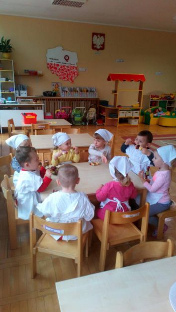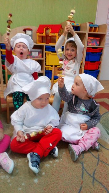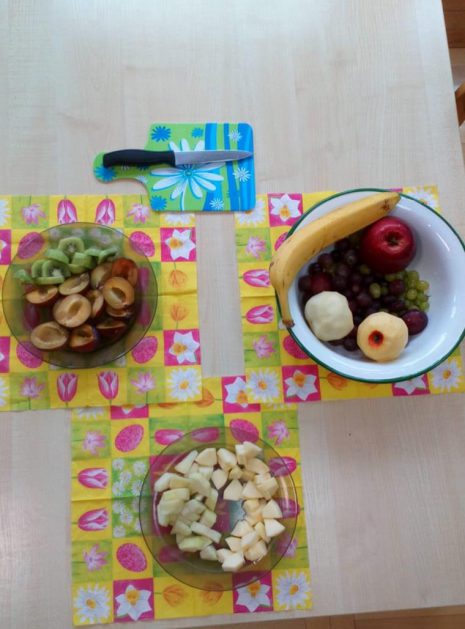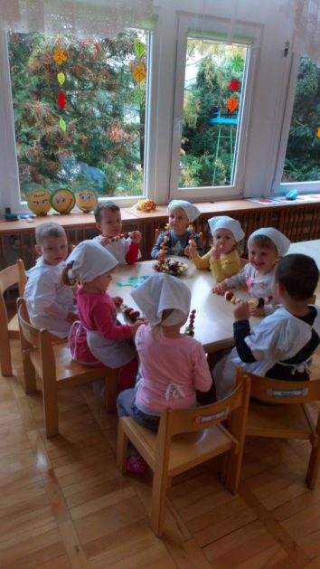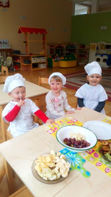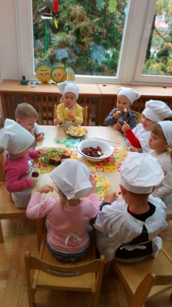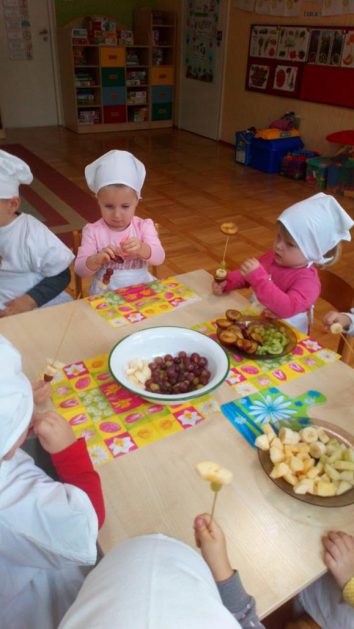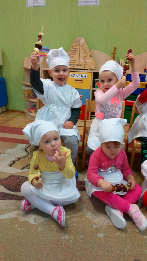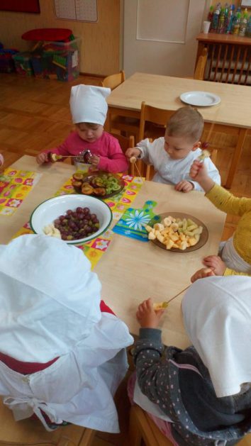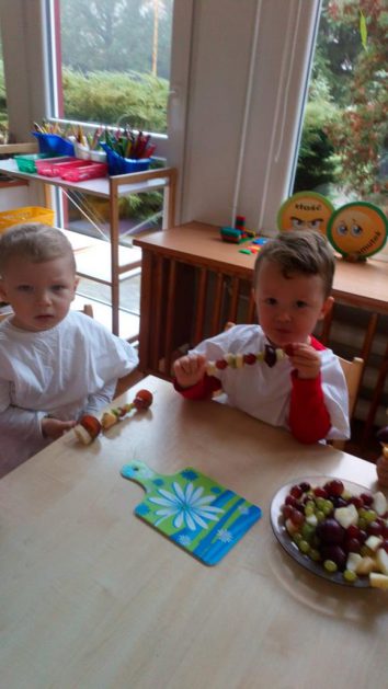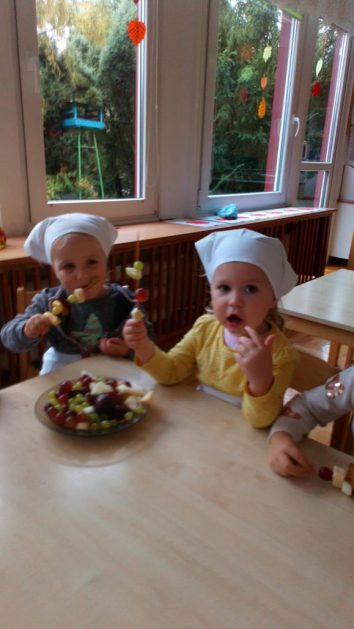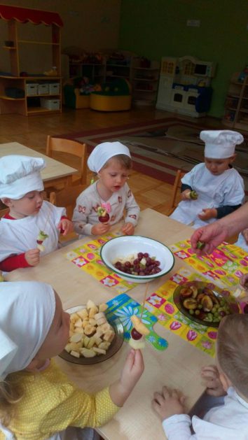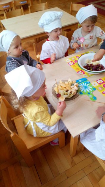 O tym jak ważne jest dla zdrowia spożywanie owoców, wiedzą już przedszkolaki z grupy 3 latków p. Edyty .Dzieci przyniosły na zajęcia rożne owoce w celu wykonania szaszłykowych smakołyków. Przed zrobieniem pyszności kulinarnych dzieci określały kształty , kolory, poznawały nazwy przyniesionych owoców. Przy dźwiękach piosenki „Witaminki” umyte i pokrojone owoce nadziewały na patyczki. Po skończonej pracy nastąpiła degustacja kolorowych szaszłyków, mniam!!!