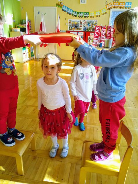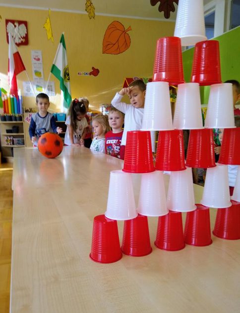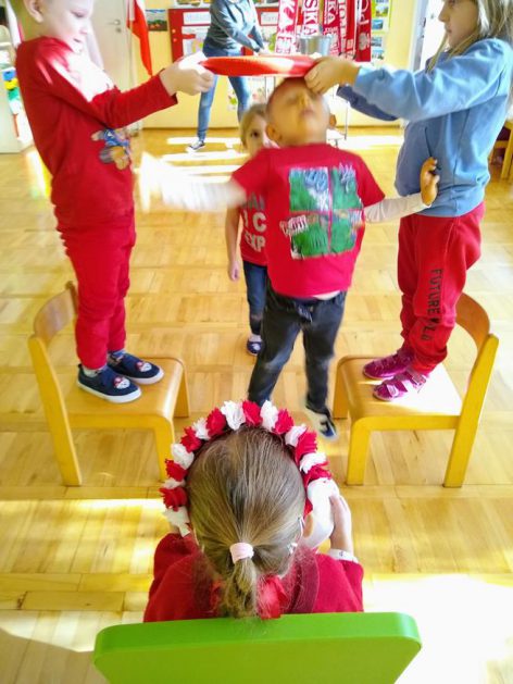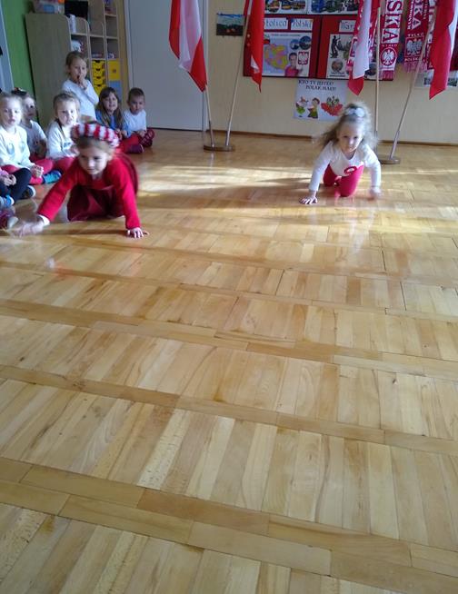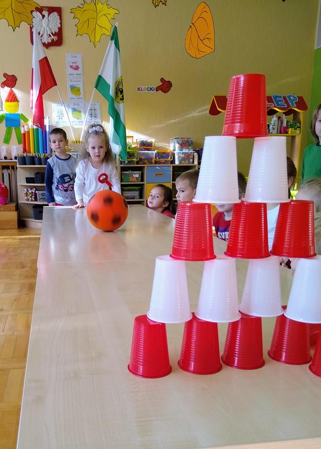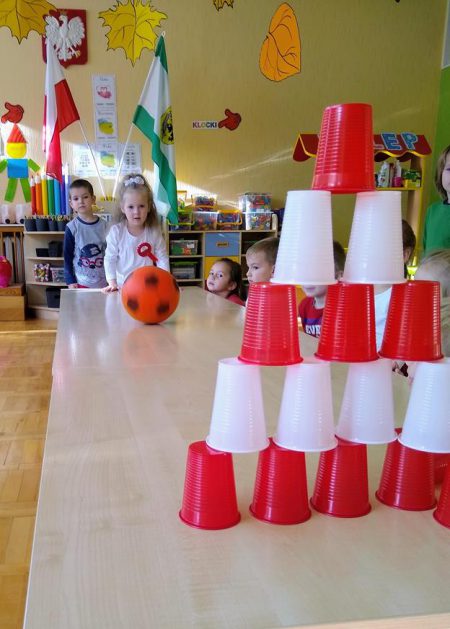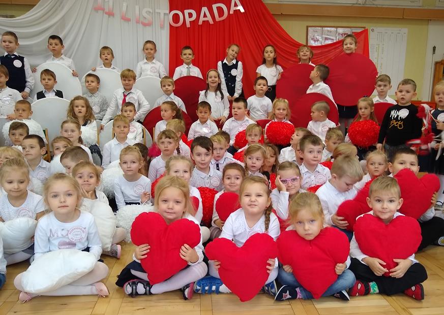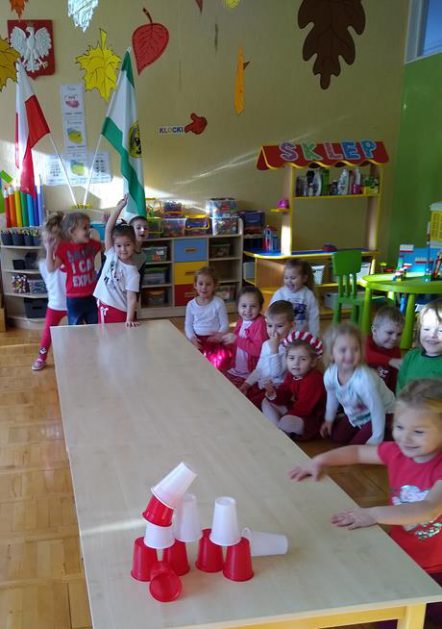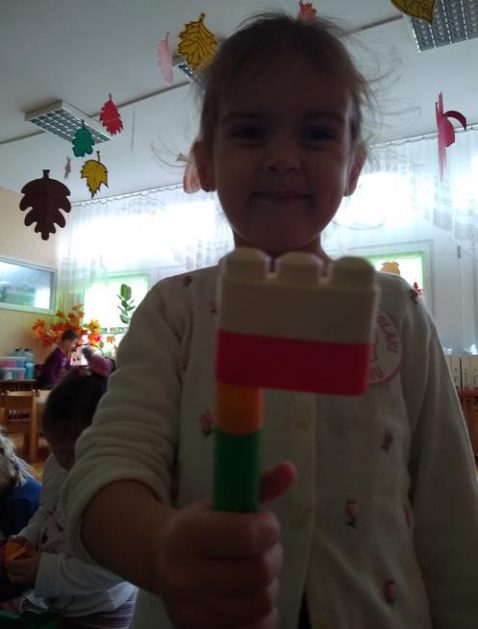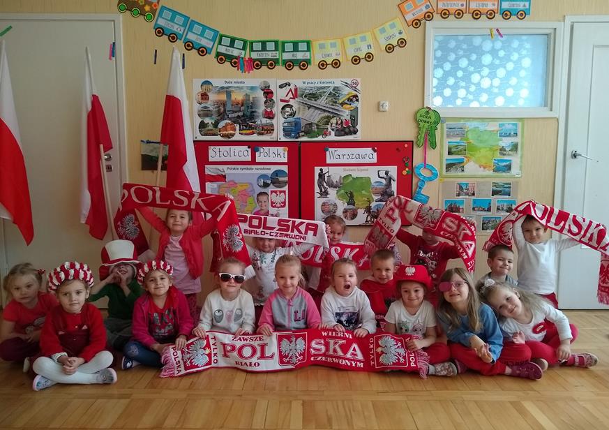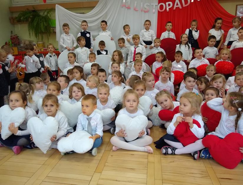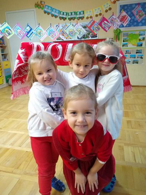 W ramach projektu „Piękna nasza Polska cała” 10 listopada w grupie 4 latków odbyły się zawody sportowe, pod hasłem: „Polska! Biało – Czerwoni! Stroje dzieci i rekwizyty nawiązywały do barw narodowych. Na początku wszyscy uczestnicy złożyli uroczystą przysięgę, że będą się świetnie bawić i rywalizować fair play . Były rożne konkurencje, m.in.: „Bieg piesków”, „Porządki”, „Jesienny wiatr”, „Kręgle”. Realizacja projektu odbywała się na wiele różnych sposobów: udział w uroczystej akademii z okazji święta 11listopada dla upamiętnienia odzyskania niepodległości przez Polskę w 1918, czy utrwalanie wiadomości poprzez dowolne czynności zabawowe dzieci – budowanie flagi Polski z rożnych klocków.
