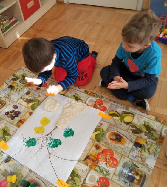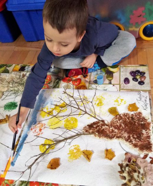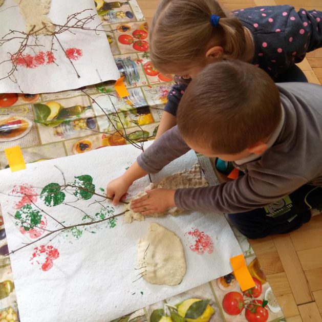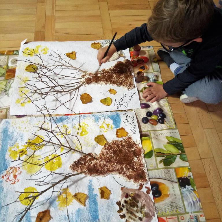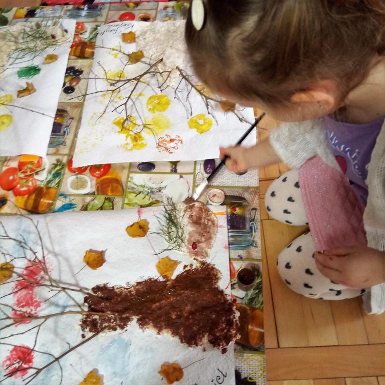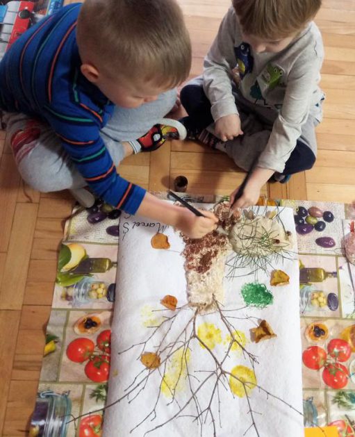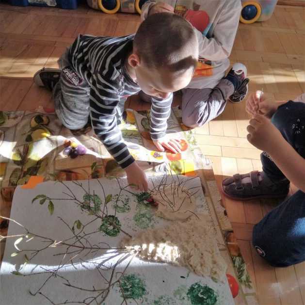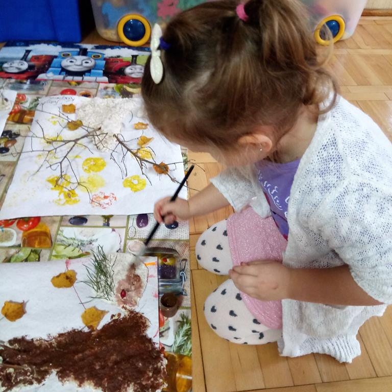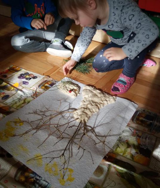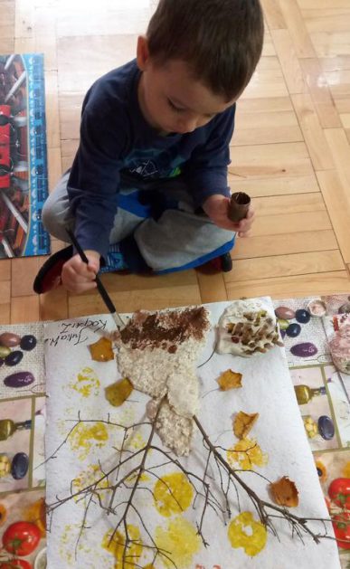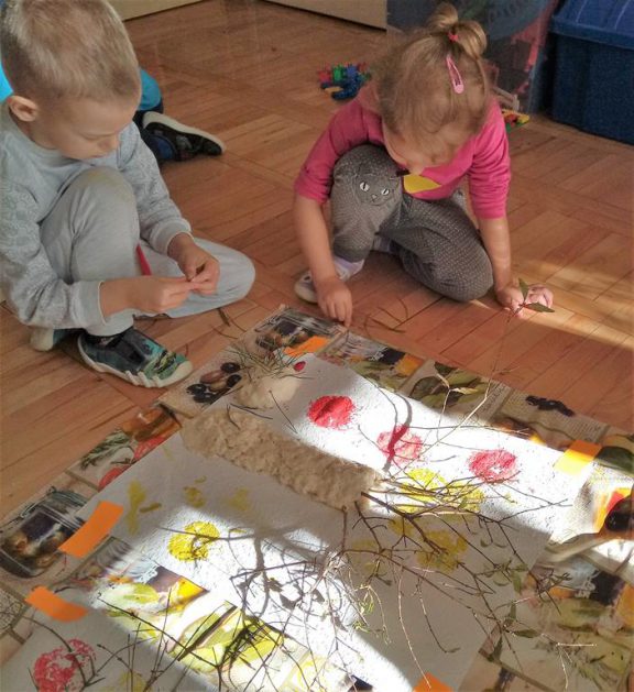 4 latki rozwijały zmysł dotyku i rozpoznawały różne elementy przyrody: szyszki, gałązki sosnowe, nasiona dyni, skrzydlaki, ponieważ aktywne obcowanie z przyrodą pełni ważną rolę w kształtowaniu elementarnych pojęć dziecka o świecie, rozwija ciekawości, dostarcza głębokich przeżyć, więc dzieci wyraziły swoje emocje w pracach plastycznych. Zgodnie współdziałając w małych zespołach stworzyły piękne przestrzenne obrazy.