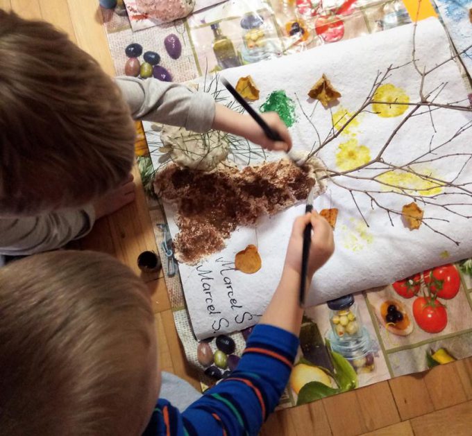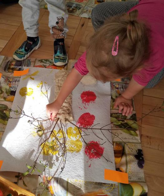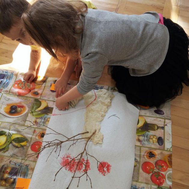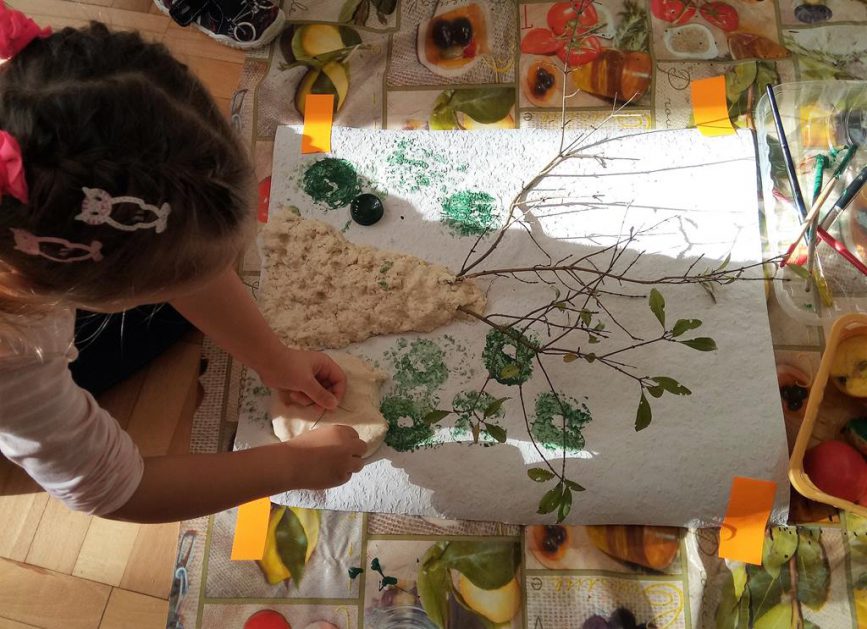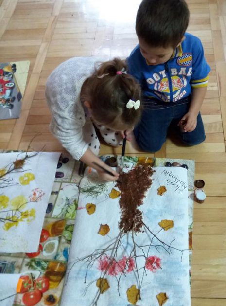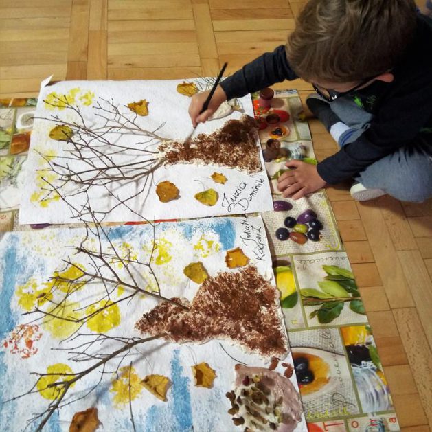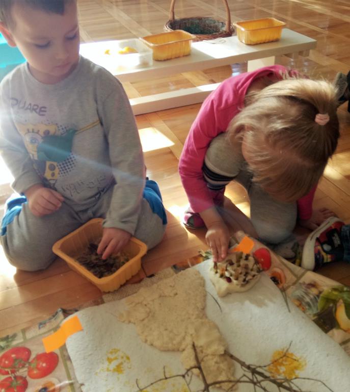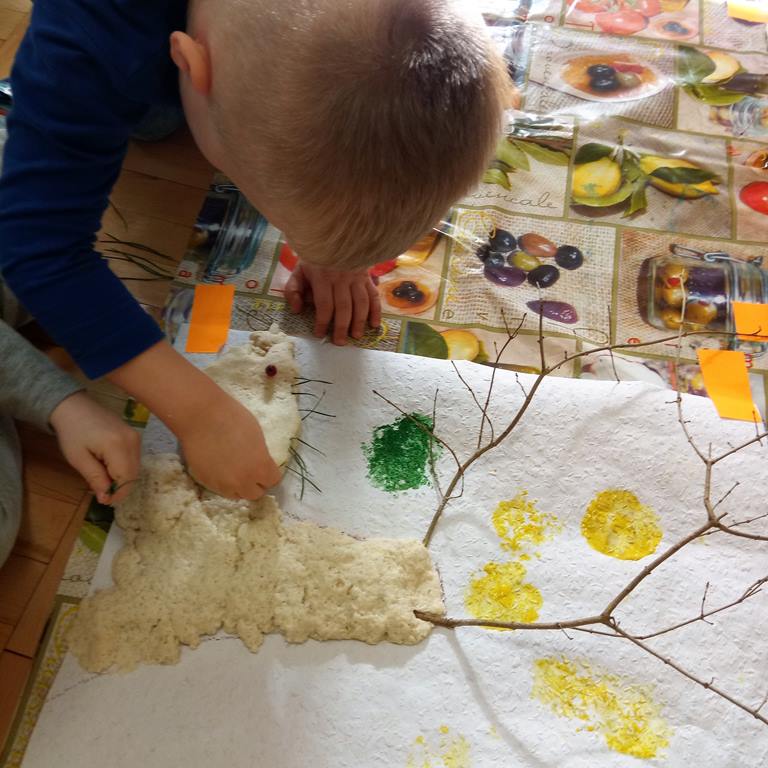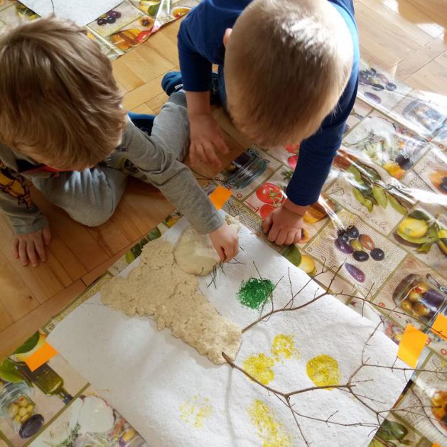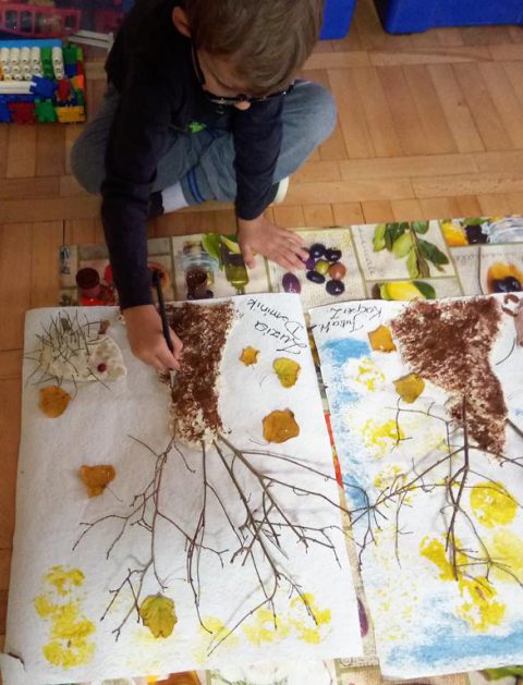 4 latki rozwijały zmysł dotyku i rozpoznawały różne elementy przyrody: szyszki, gałązki sosnowe, nasiona dyni, skrzydlaki, ponieważ aktywne obcowanie z przyrodą pełni ważną rolę w kształtowaniu elementarnych pojęć dziecka o świecie, rozwija ciekawości, dostarcza głębokich przeżyć, więc dzieci wyraziły swoje emocje w pracach plastycznych. Zgodnie współdziałając w małych zespołach stworzyły piękne przestrzenne obrazy.