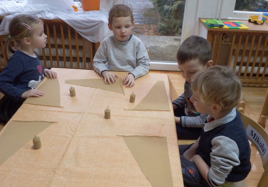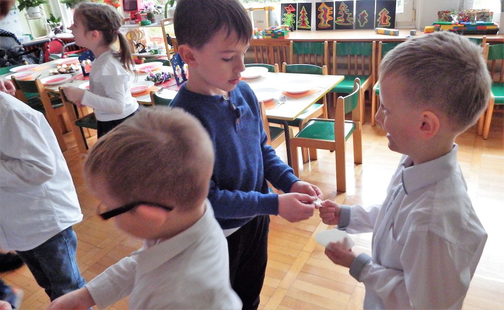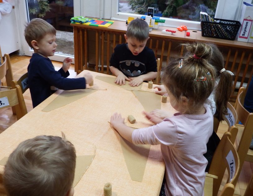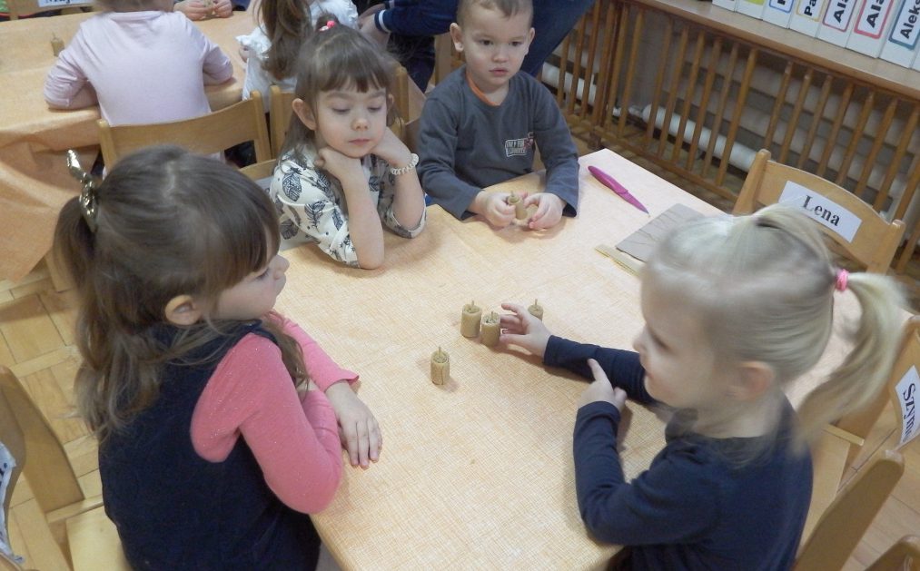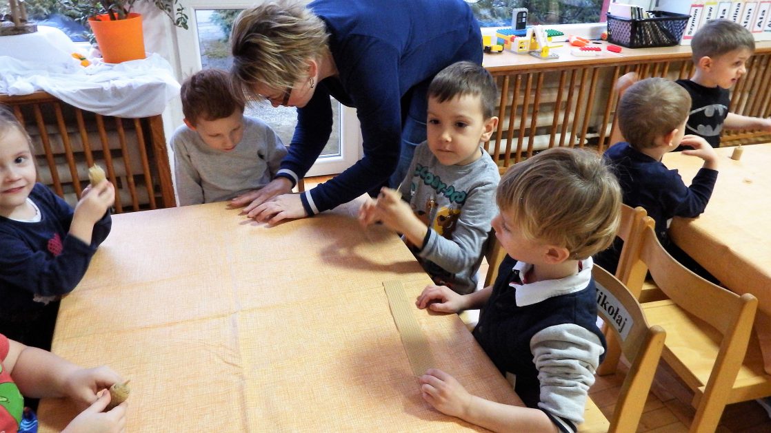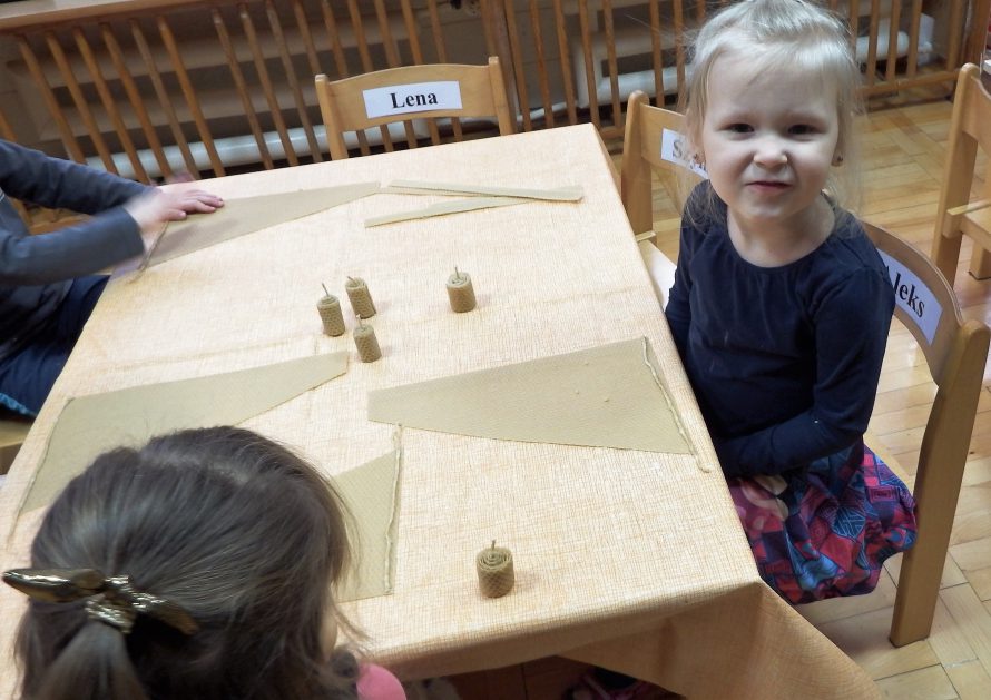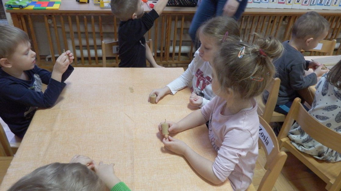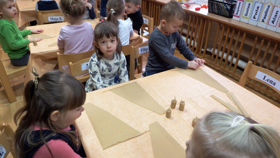 Niedługo Babcię i Dziadka zaprosimy dlatego prezenty dla nich zrobimy. Mama Nadii u nas gościła i jak zrobić świeczki z węzy nauczyła. Ciekawe rzeczy nam opowiedziała, wszystkie składniki pokazała. Krok po kroku każdy z nas zwinął świeczkę pierwszy raz. Wszystkie buzie były uśmiechnięte, że takie ładne wyszły nam prezenty.