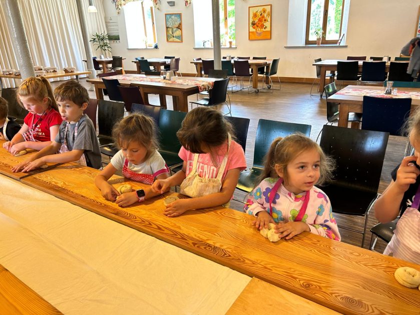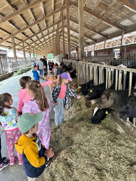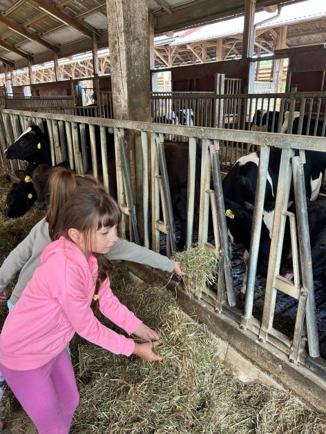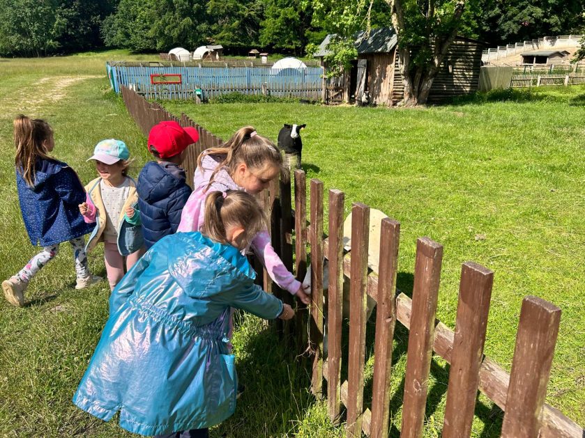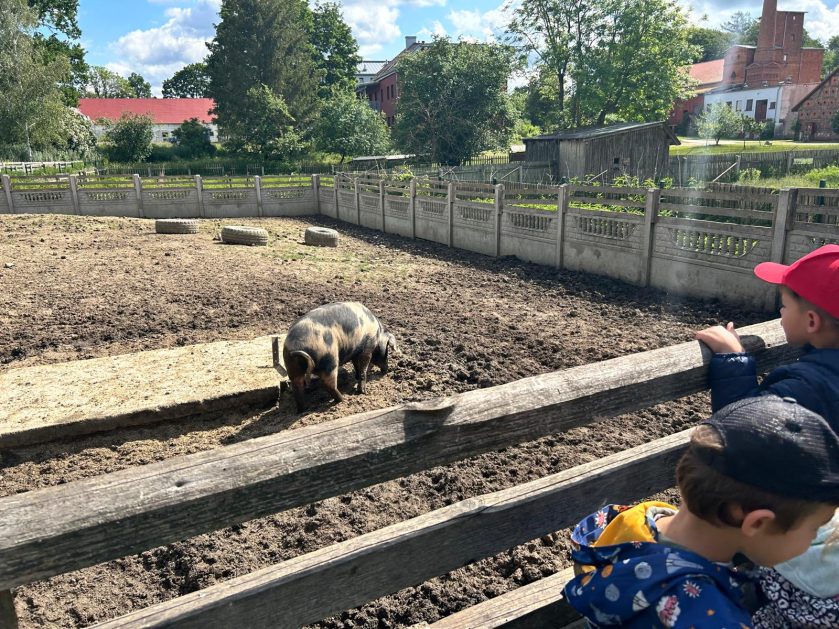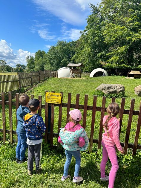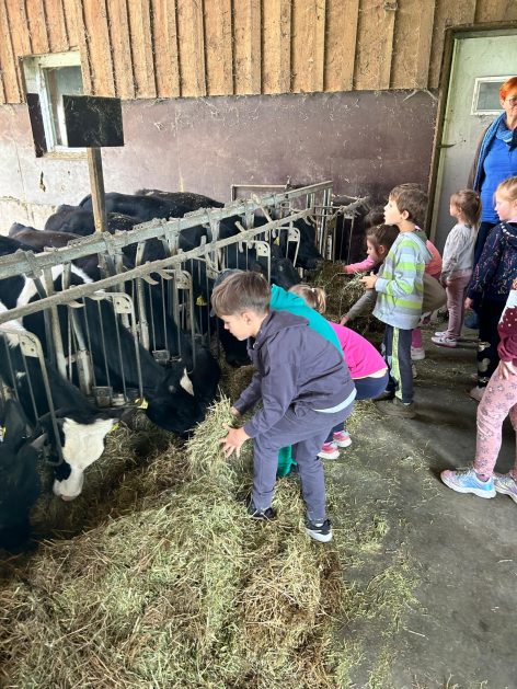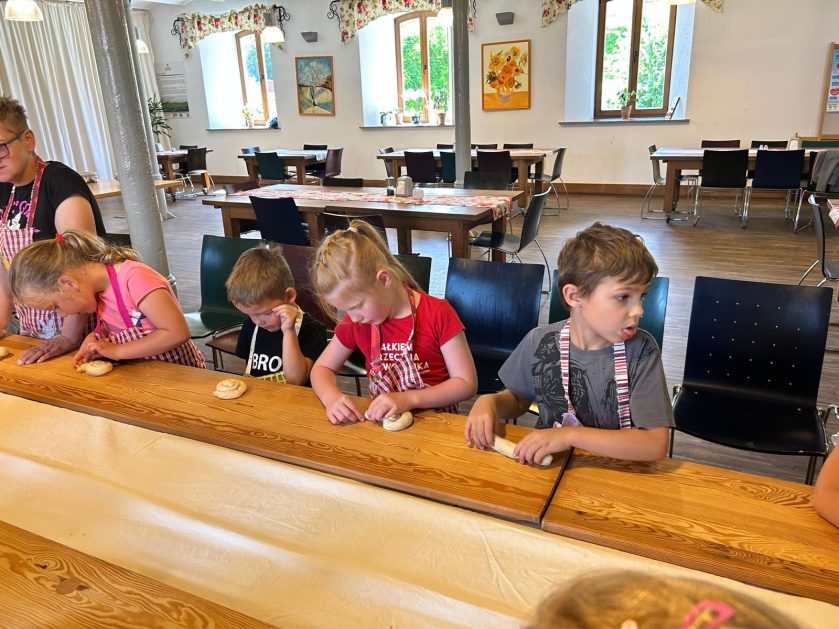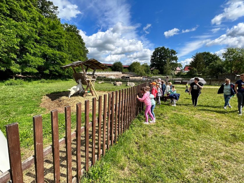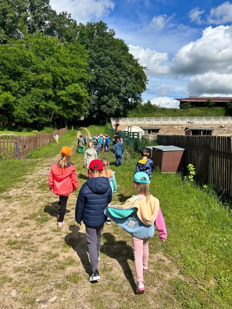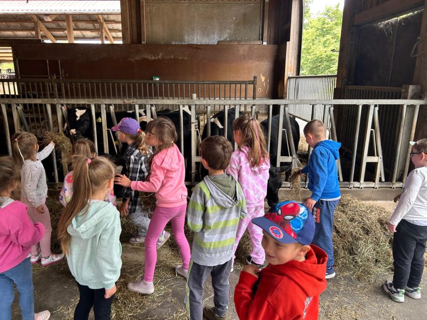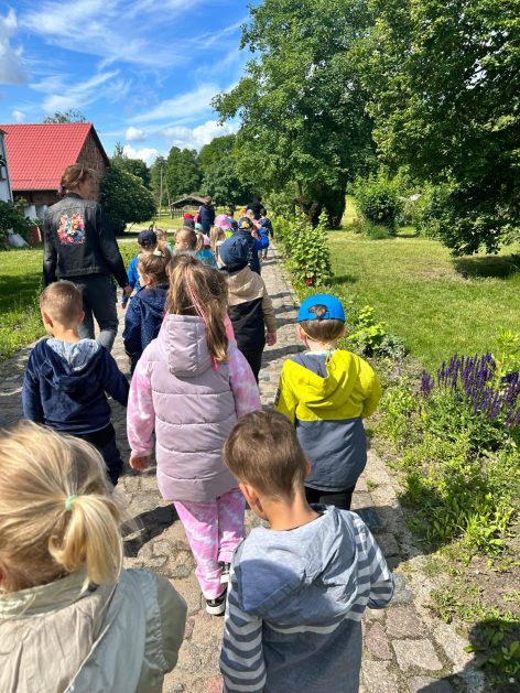 13 czerwca 5 latki odwiedziły gospodarstwo ekologiczne w Juchowie,  prowadzone w harmonii ze środowiskiem naturalnym oraz w trosce o zachowanie pięknego krajobrazu. Celem wycieczki było zapoznanie dzieci z gospodarstwem ekologicznym, z pojęciem ekologia, poszerzenie wiedzy na temat produktów ekologicznych, zapoznanie z pracą w gospodarstwie, a także budowanie wrażliwości na piękno przyrody. Gospodarze opowiedzieli czym charakteryzuje się gospodarstwo ekologiczne i oprowadzili po swoich włościach, gdzie dzieci mogły zobaczyć produkcję produktów mlecznych, obejrzały nowoczesne sprzęty rolnicze jak i oczywiście zobaczyły zwierzęta hodowlane. Smacznym punktem spotkania było pieczenie bułeczek i skosztowanie ich z kubeczkiem mleka.