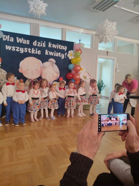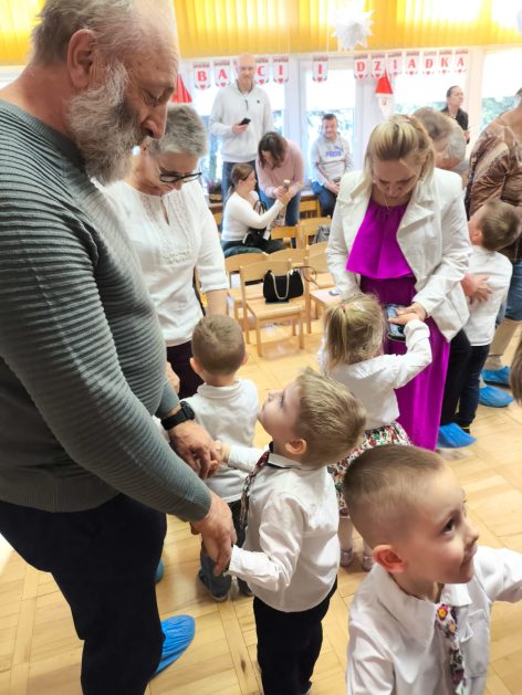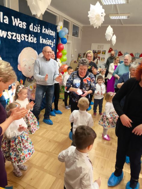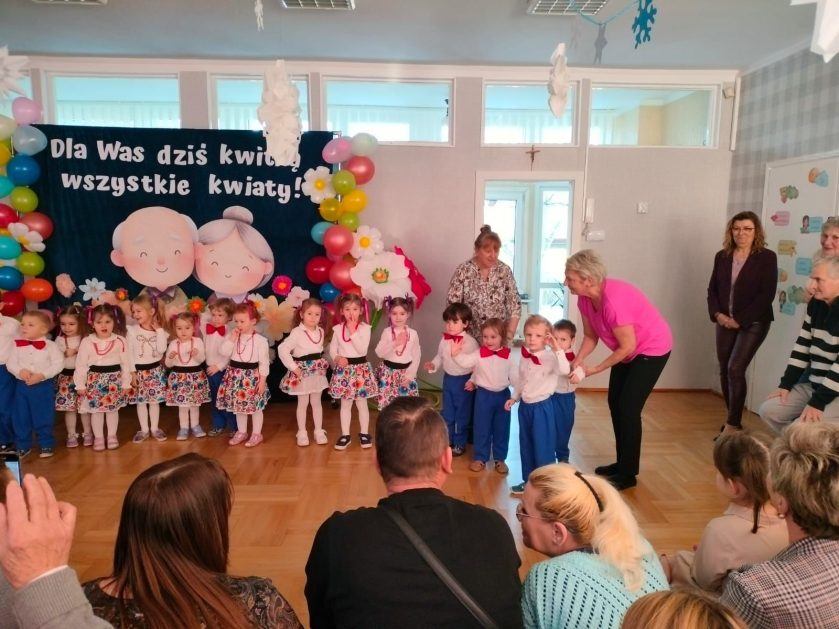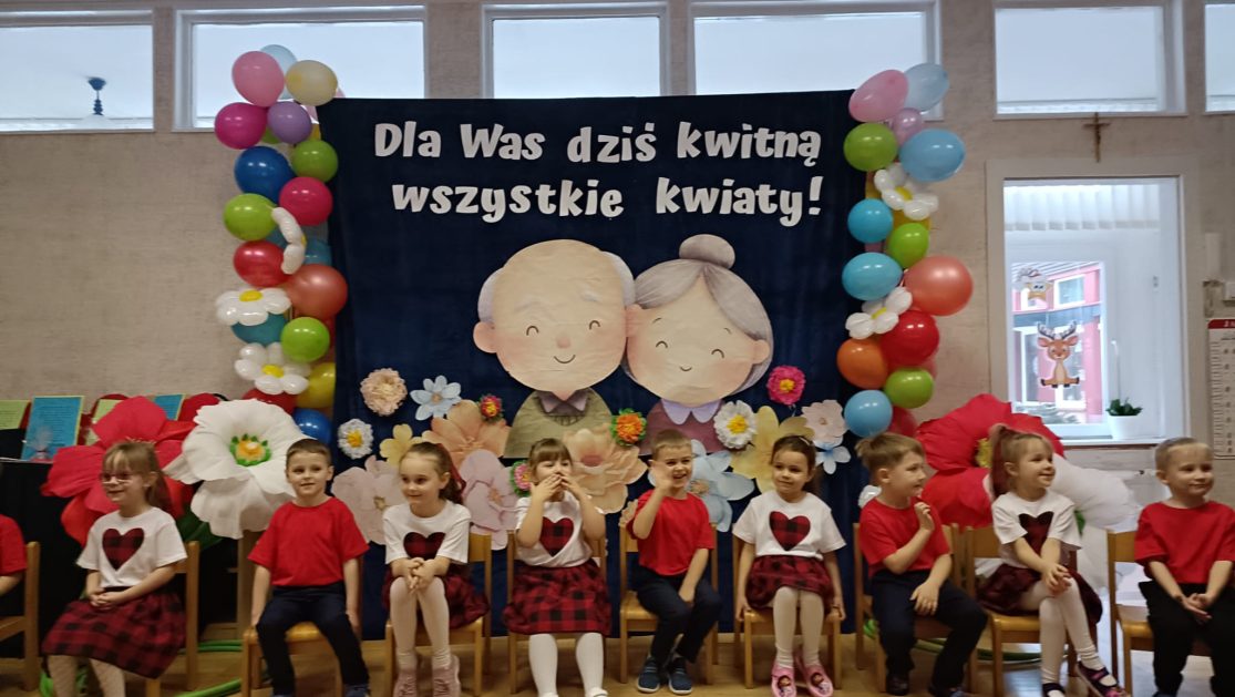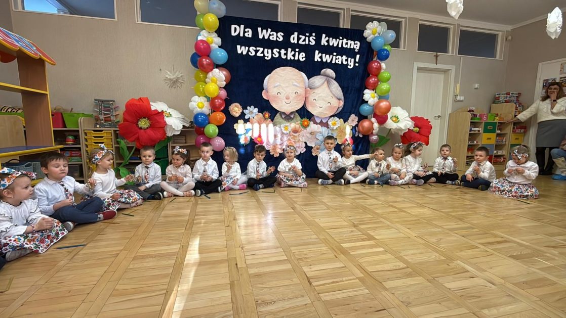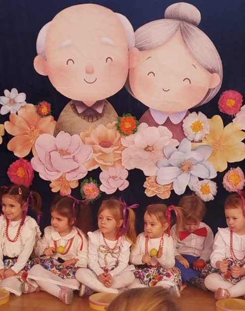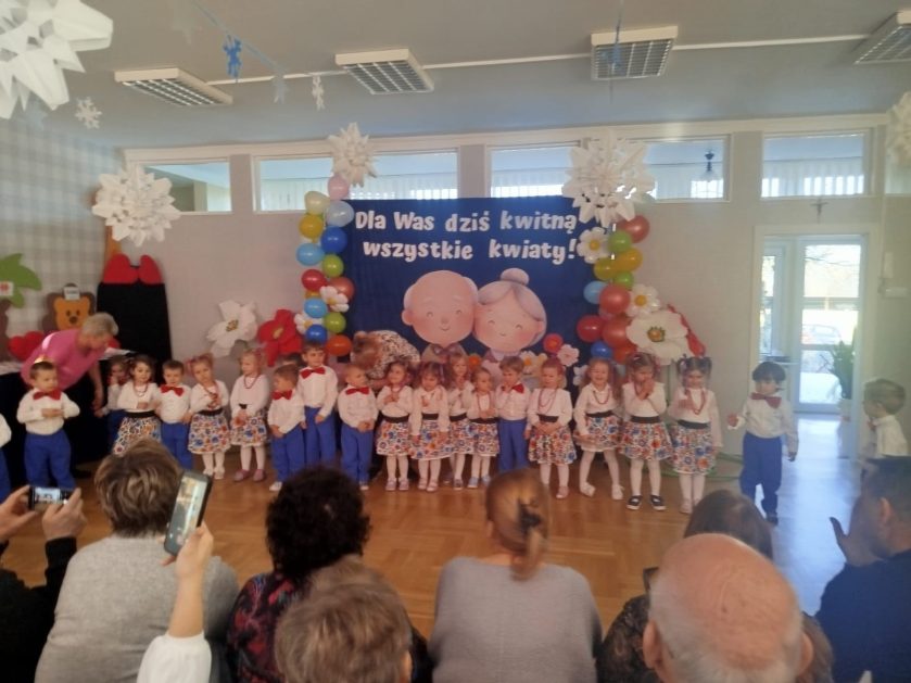 Nastał styczeń zimowy, który chłodem mrozi, ale też rozgrzewa serduszka każdego dziecka, bo… to czas świętowania szczególnego dnia dla wszystkich dzieci. Dzień Babci i Dziadka to dla przedszkolaków nie lada gradka, ponieważ w przedszkolu witają swoją babcię i dziadka. Dziadkowie to wielki skarb dla wnuków, są dopełnieniem rodzicielskiej miłości, czynią dzieciństwo szczęśliwym i udanym. Wnuczęta są dla nich radością życia. W podzięce za ich wielkie serce dzieci przygotowały programy artystyczne. W pięknych scenografiach oraz wyjątkowej atmosferze wnuczęta wspaniale wystąpiły przed bliskimi. Były wzruszające wiersze i piosenki, wesołe tańce, muzyczne inscenizacje i oczywiście głośne 100 lat! Goście ze wzruszeniem patrzyli na swoje pociechy i brawami dziękowali za występy. Rozpromienione twarze bliskich ukazały, jak ważne są chwile spędzone z wnuczętami.