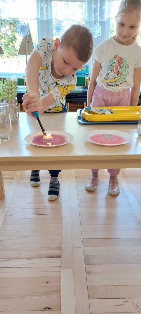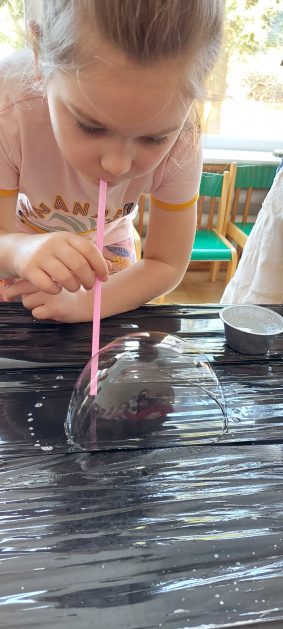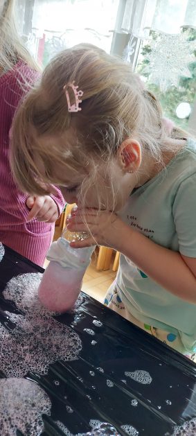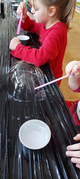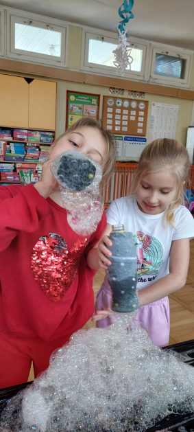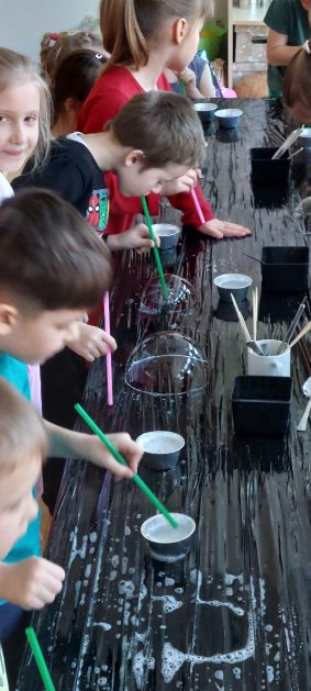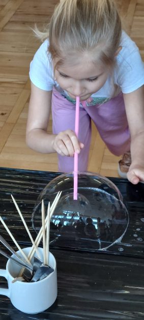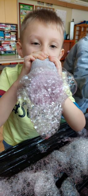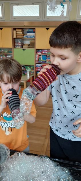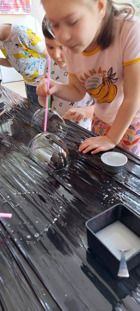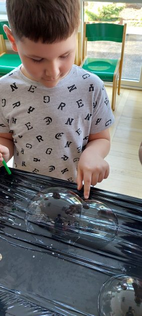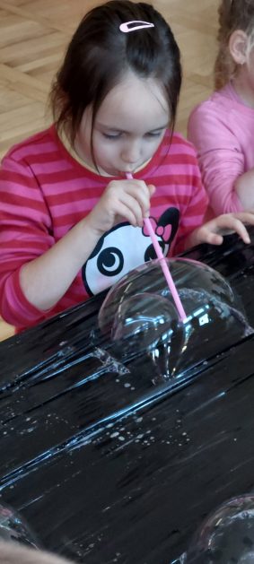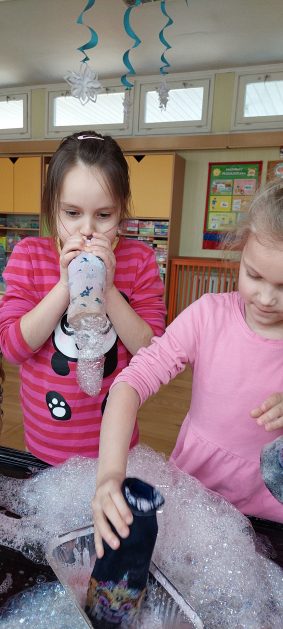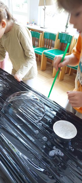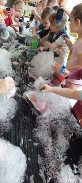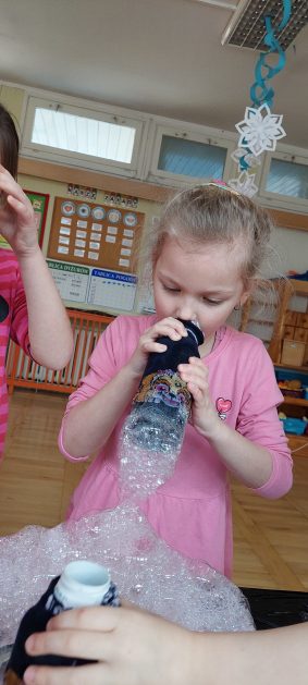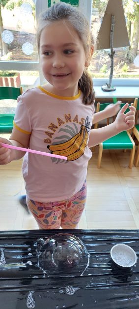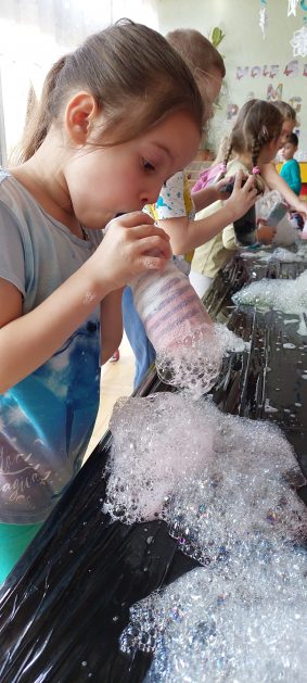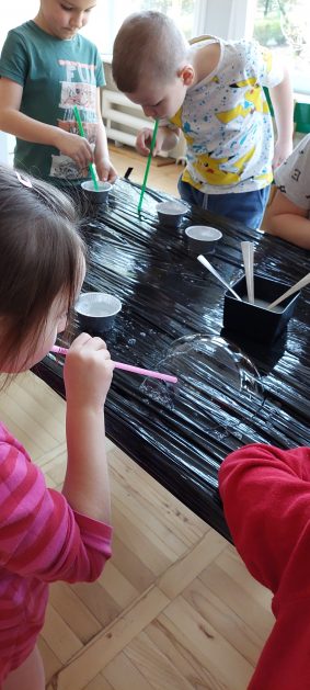 „Badam doświadczam, eksperymentuję” 6 latki samodzielnie wykonują różne doświadczenia i eksperymenty, starając się zrozumieć otaczające je zjawiska. Zabawy badawcze mają zachęcić dzieci do niecodziennej formy zdobywania wiedzy. Co to jest tlen? Czy można go zobaczyć? „Wulkan w przedszkolu” – czy to możliwe? Jak powstaje bańka mydlana? Co jest potrzebne by powstały bańki mydlane ? Czy można zamknąć bańkę w bańce? Fantastyczna zabawa pobudzająca wszystkie zmysły.