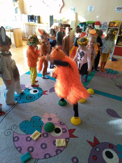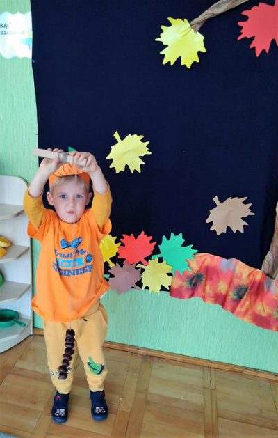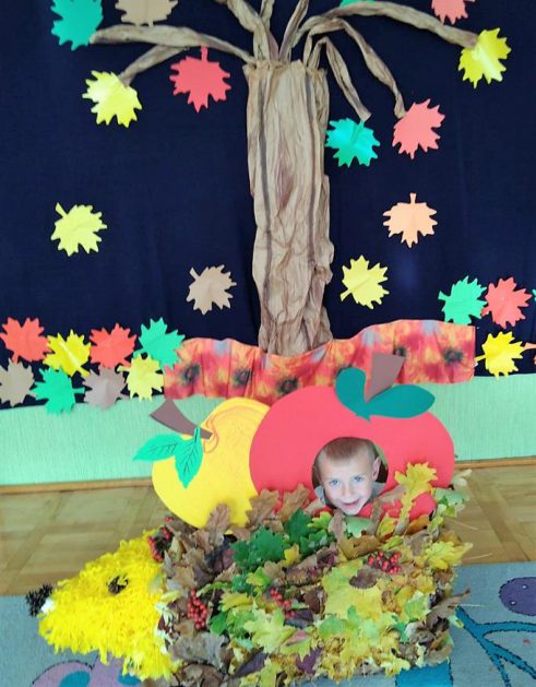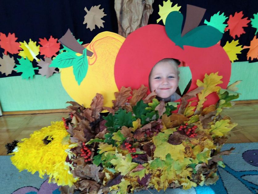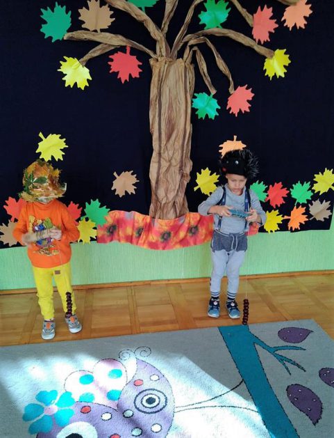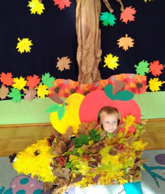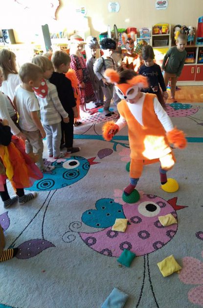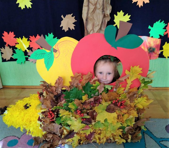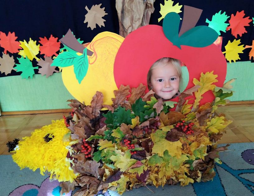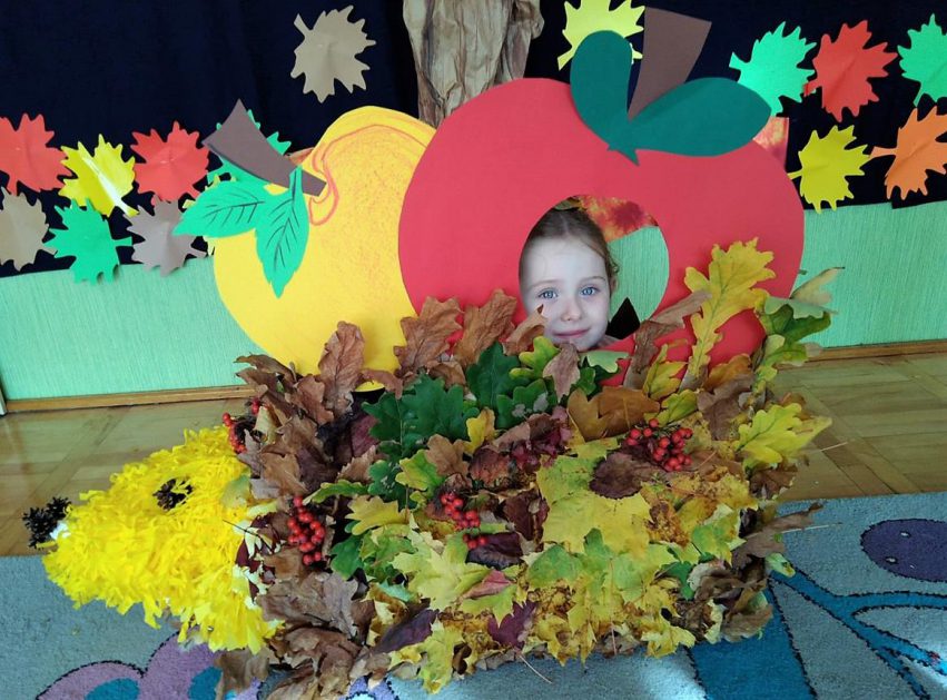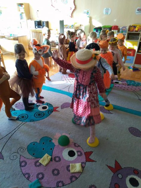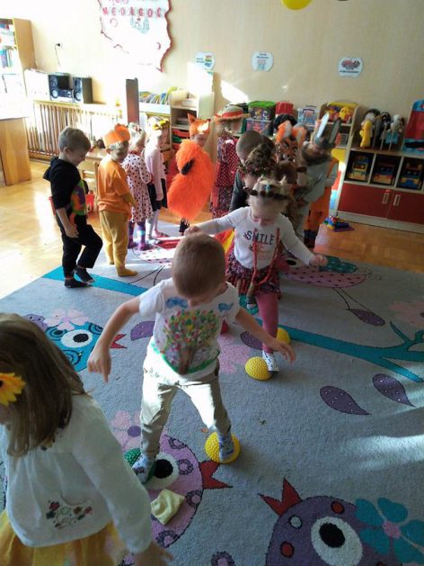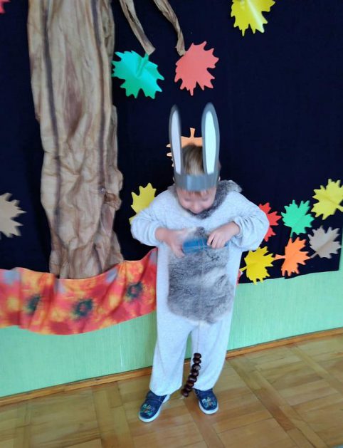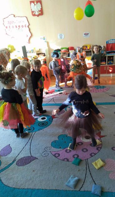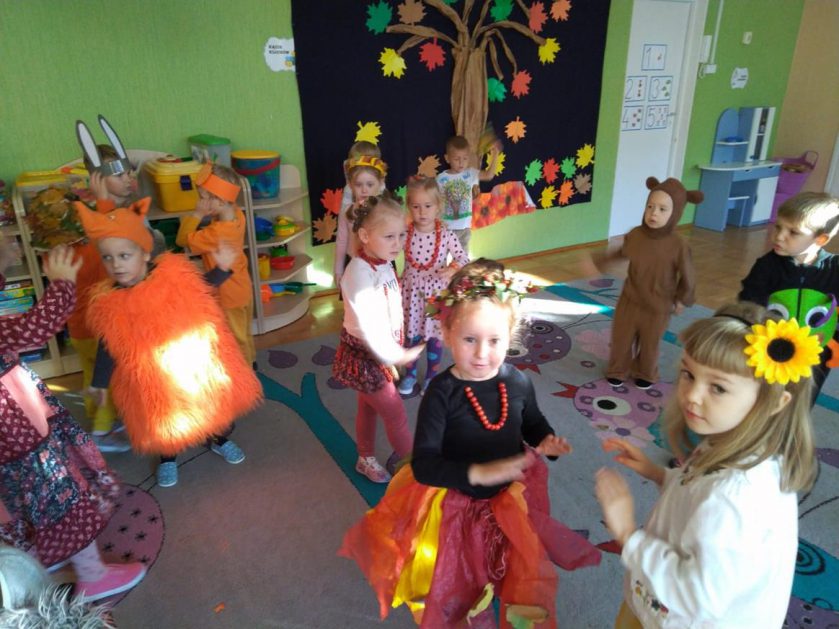 Wszystko za sprawą balu pod czujnym okiem Pani Jesieni, który odbył się w naszym przedszkolu 21 i 22 października. W tym roku Pani Jesień wraz z Krasnalem Hałabałą zawitała do każdej sali. Na bal przybyły również muchomorki, jeże, wiewiórki, lisy, zajączki, jesienne listki i jarzębinki. Zabawy było co niemiara. W każdej grupie przedszkolaki uczestniczyły w różnych zabawach i konkursach, robiły soki owocowo – warzywne, witaminki na patyku – szaszłyki. Nie zabrakło również wspólnych pląsów i tańców. A starszaki pięknie recytowały wiersze i śpiewały piosenki dla pani Jesieni na konkursie pod hasłem „Mam talent”. Jak na najstarsze przedszkolaki przystało uczestnicy konkursu spisali się na medal. Wszyscy bawili się doskonale, czego dowodem były przepiękne uśmiechy na twarzach dzieci.