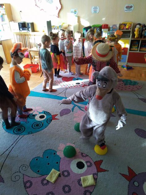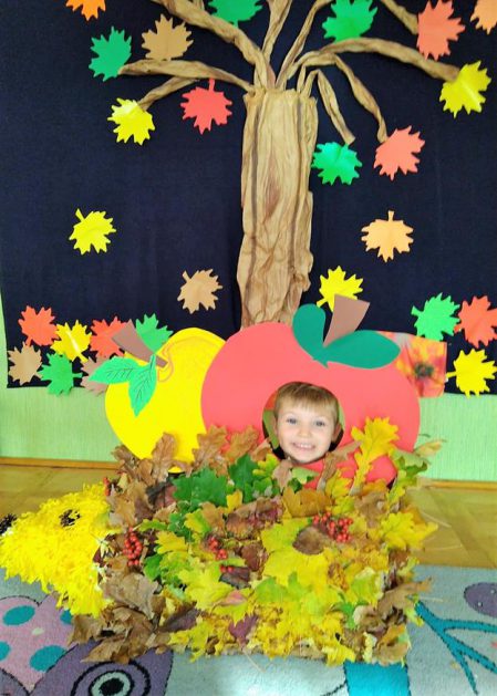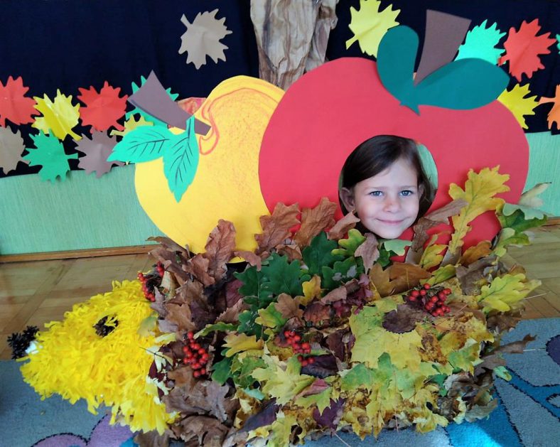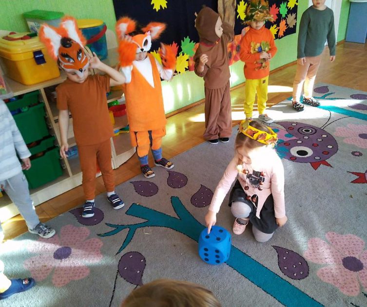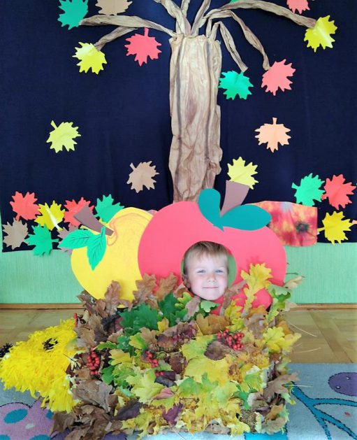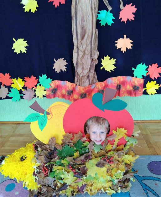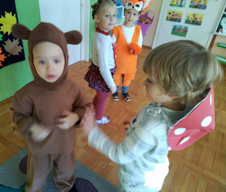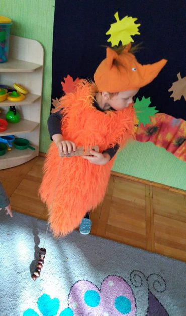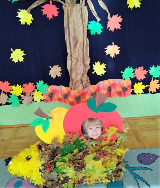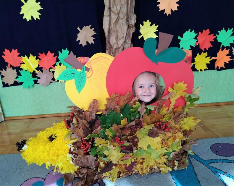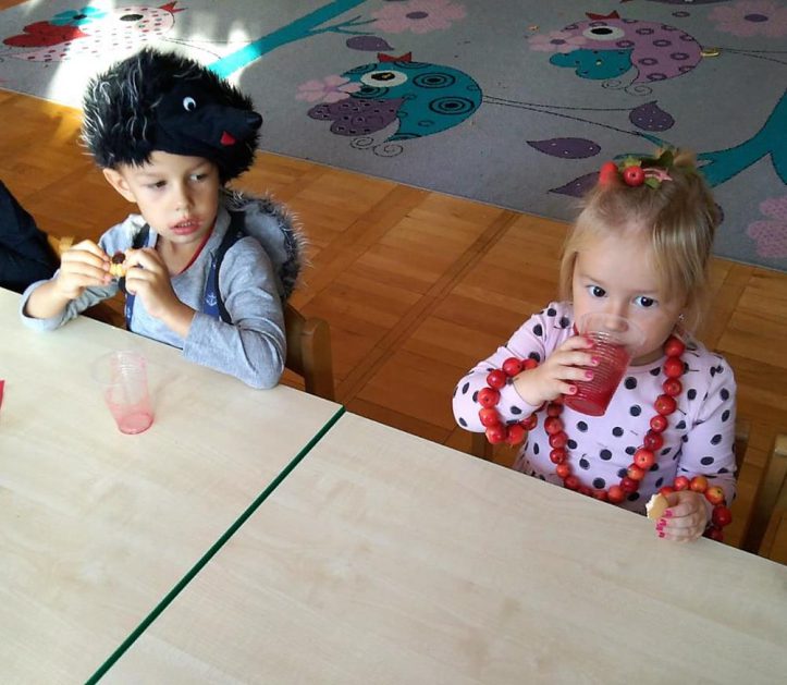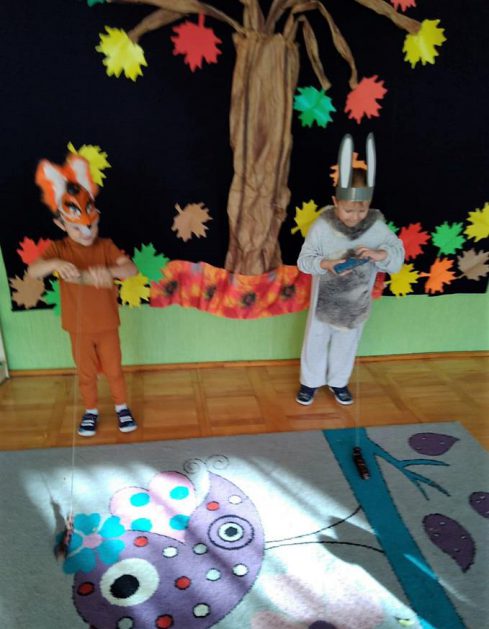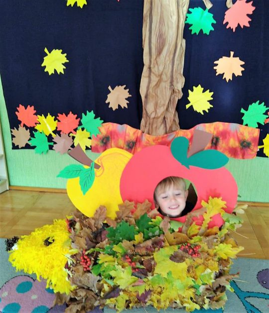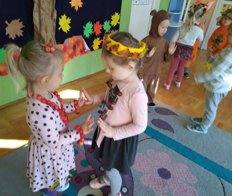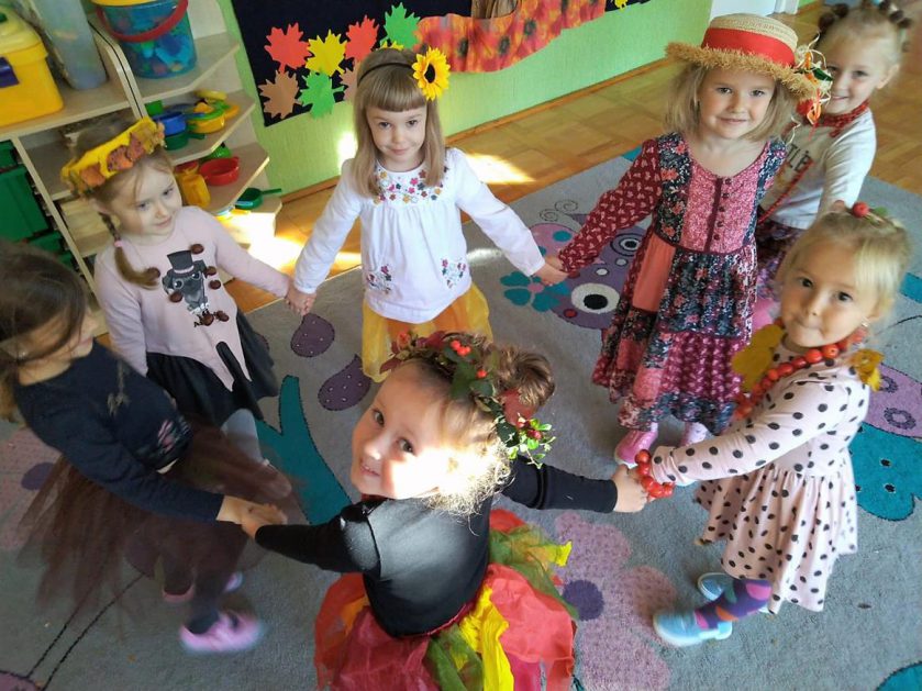 Wszystko za sprawą balu pod czujnym okiem Pani Jesieni, który odbył się w naszym przedszkolu 21 i 22 października. W tym roku Pani Jesień wraz z Krasnalem Hałabałą zawitała do każdej sali. Na bal przybyły również muchomorki, jeże, wiewiórki, lisy, zajączki, jesienne listki i jarzębinki. Zabawy było co niemiara. W każdej grupie przedszkolaki uczestniczyły w różnych zabawach i konkursach, robiły soki owocowo – warzywne, witaminki na patyku – szaszłyki. Nie zabrakło również wspólnych pląsów i tańców. A starszaki pięknie recytowały wiersze i śpiewały piosenki dla pani Jesieni na konkursie pod hasłem „Mam talent”. Jak na najstarsze przedszkolaki przystało uczestnicy konkursu spisali się na medal. Wszyscy bawili się doskonale, czego dowodem były przepiękne uśmiechy na twarzach dzieci.