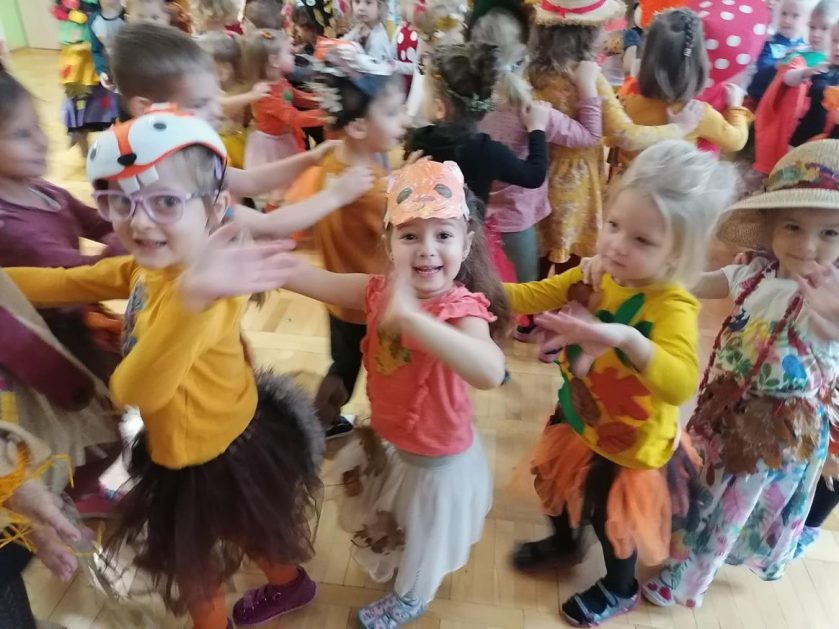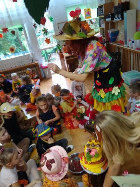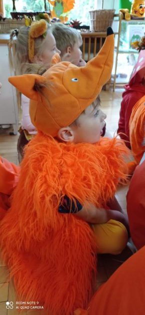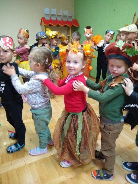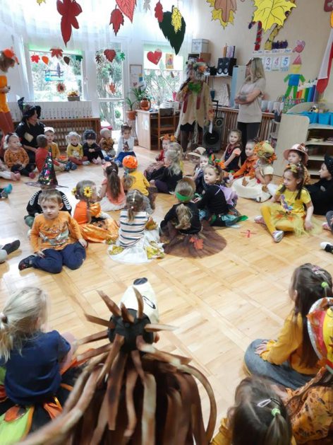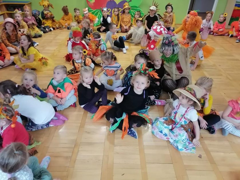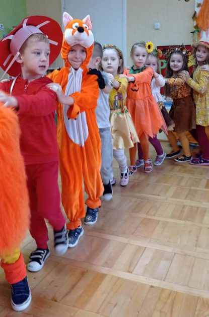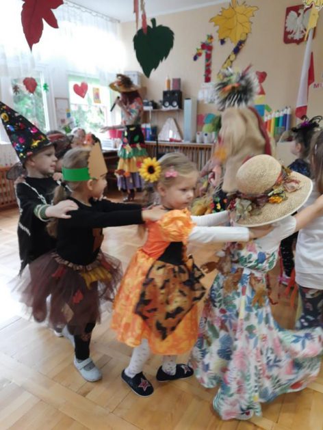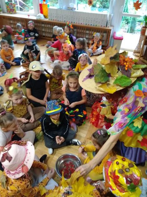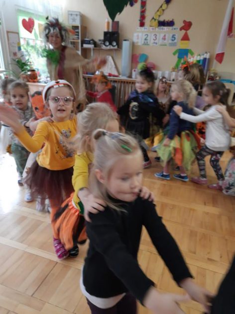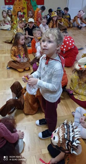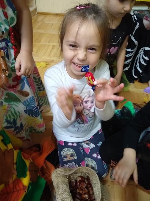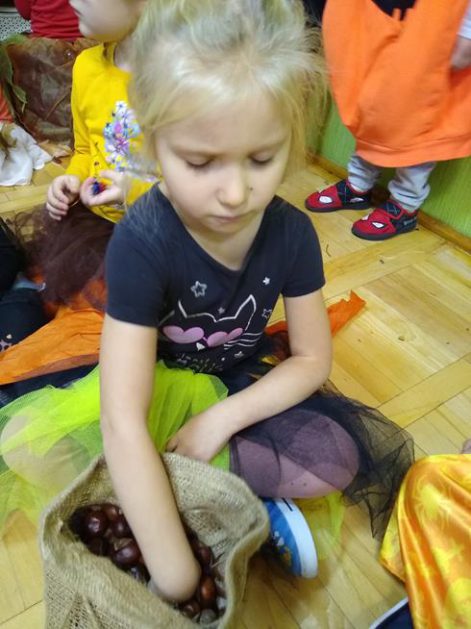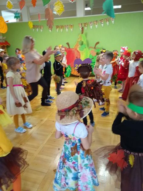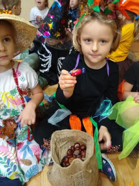Każda grupa przygotowała zabawy taneczne. Pani Jesień przyniosła dla dzieci mnóstwo atrakcji, zadbała o to, aby dla każdego było coś ciekawego a więc była także gimnastyka umysłu, zagadki, quizy o tematyce jesiennej, podczas których dzieci utrwalały zdobyte wiadomości. Na zakończenie dzieci dostały niespodzianki – woreczek kasztanów! Zdziwienie dzieci było ogromne, ale w środku kryły się jadalne smakołyki!
