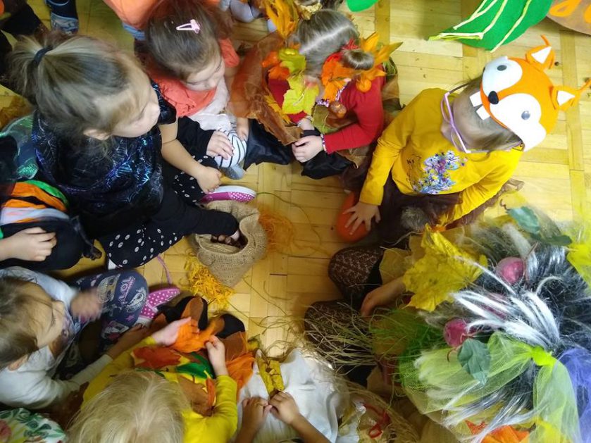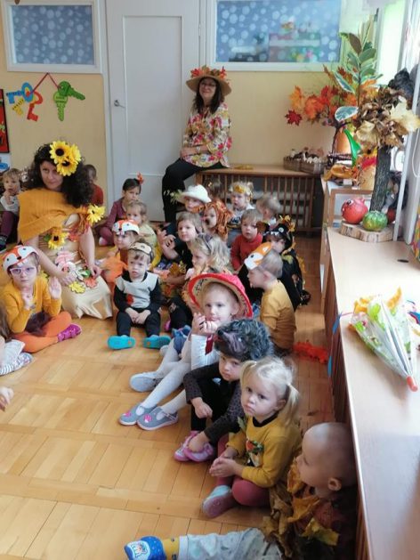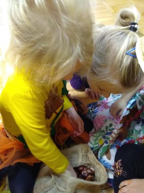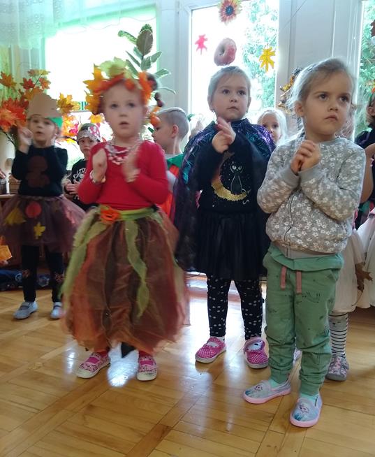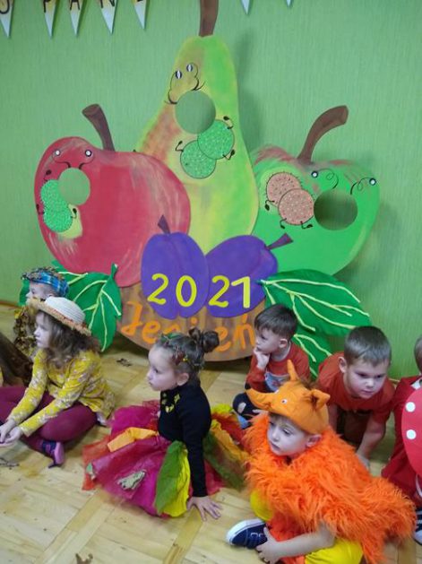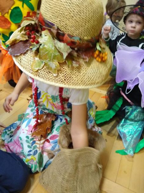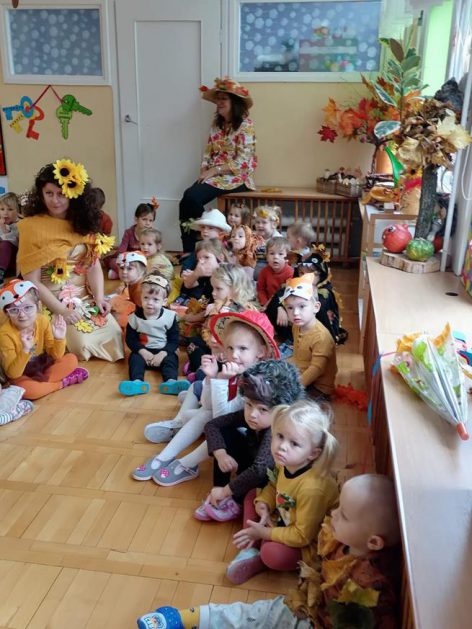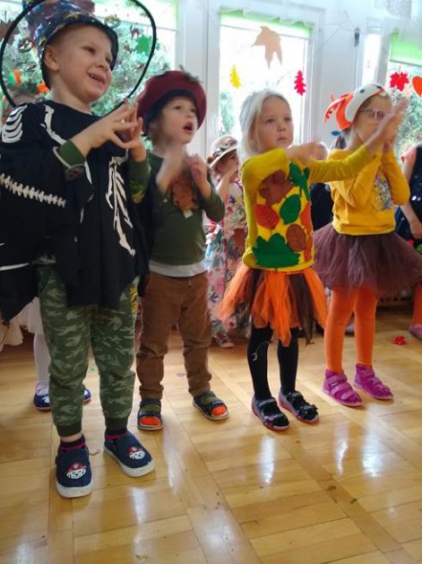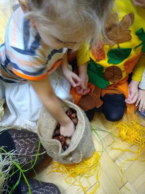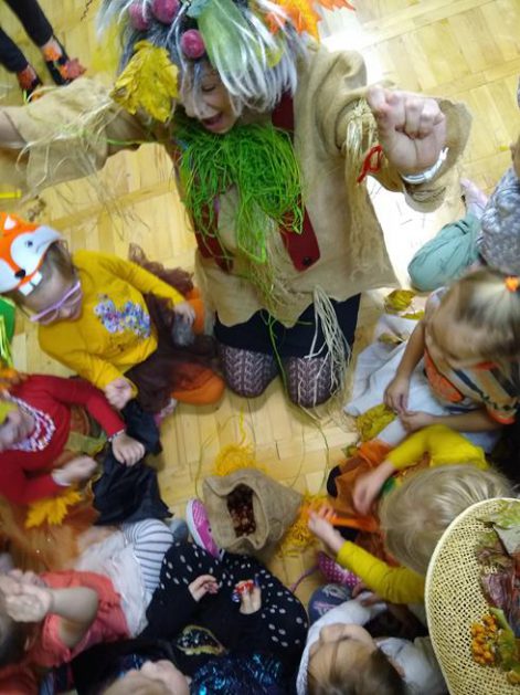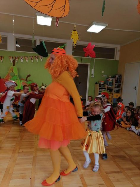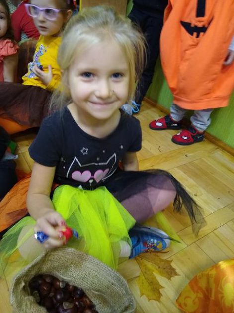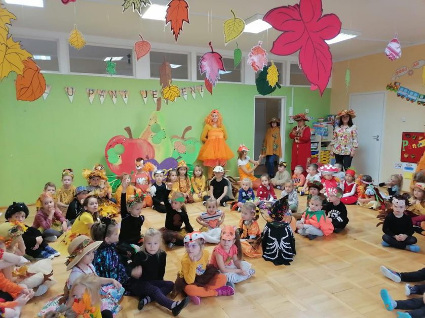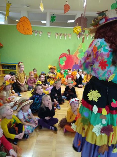 Każda grupa przygotowała zabawy taneczne. Pani Jesień przyniosła dla dzieci mnóstwo atrakcji, zadbała o to, aby dla każdego było coś ciekawego a więc była także gimnastyka umysłu, zagadki, quizy o tematyce jesiennej, podczas których dzieci utrwalały zdobyte wiadomości. Na zakończenie dzieci dostały niespodzianki – woreczek kasztanów! Zdziwienie dzieci było ogromne, ale w środku kryły się jadalne smakołyki!
