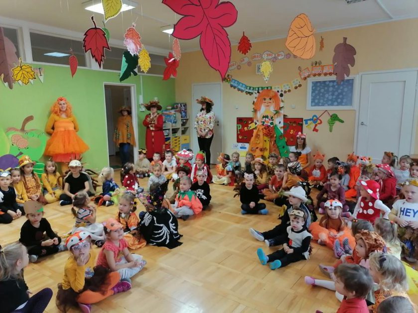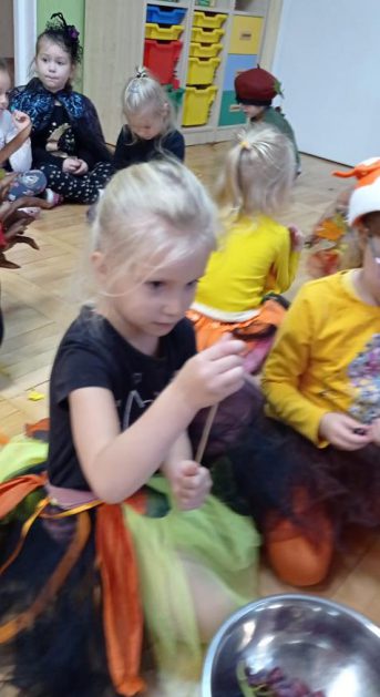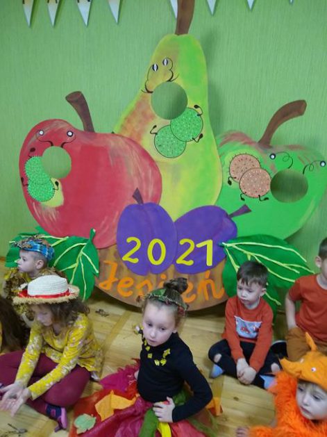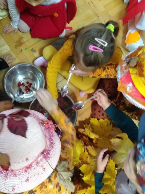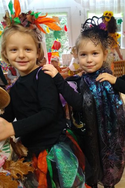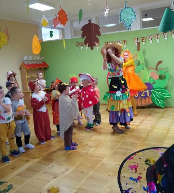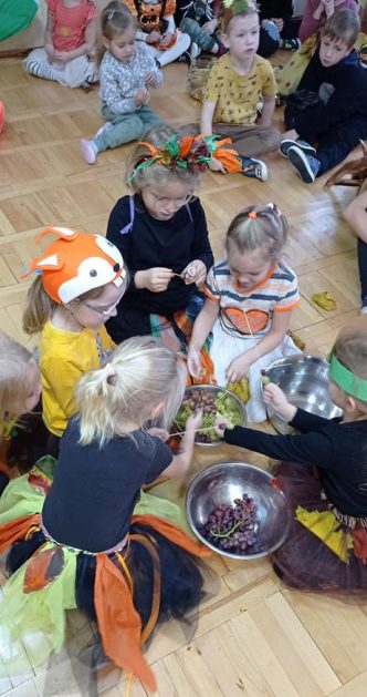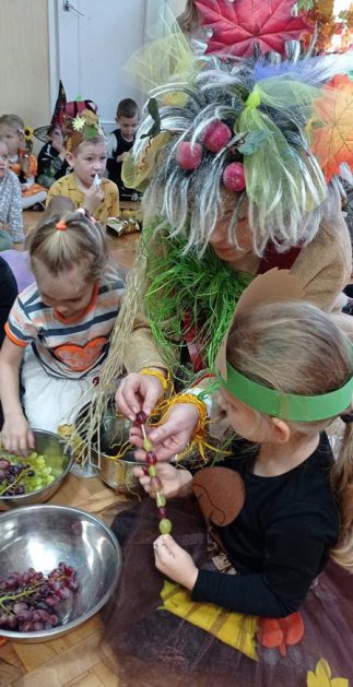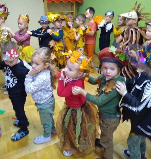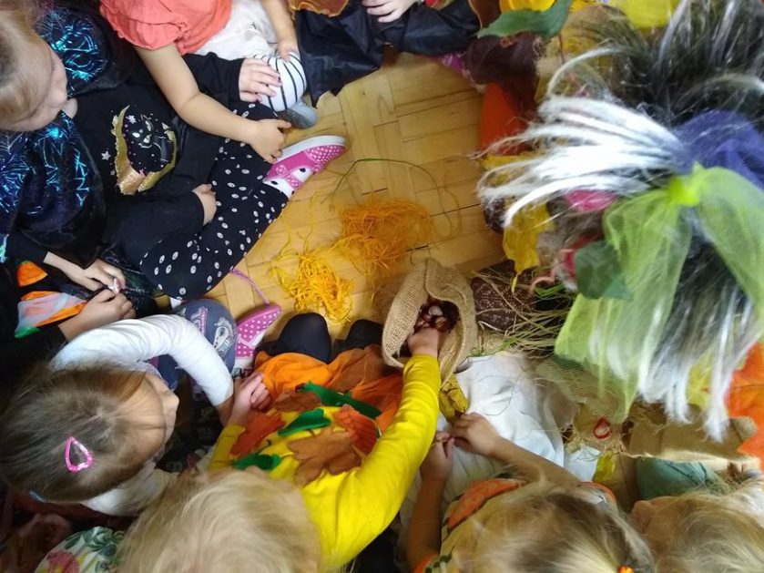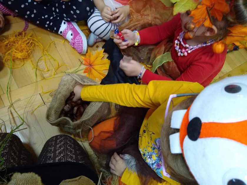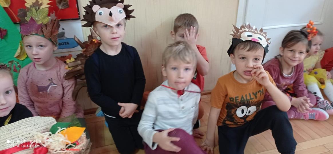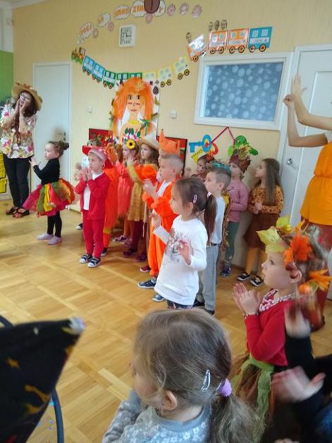 Każda grupa przygotowała zabawy taneczne. Pani Jesień przyniosła dla dzieci mnóstwo atrakcji, zadbała o to, aby dla każdego było coś ciekawego a więc była także gimnastyka umysłu, zagadki, quizy o tematyce jesiennej, podczas których dzieci utrwalały zdobyte wiadomości. Na zakończenie dzieci dostały niespodzianki – woreczek kasztanów! Zdziwienie dzieci było ogromne, ale w środku kryły się jadalne smakołyki!