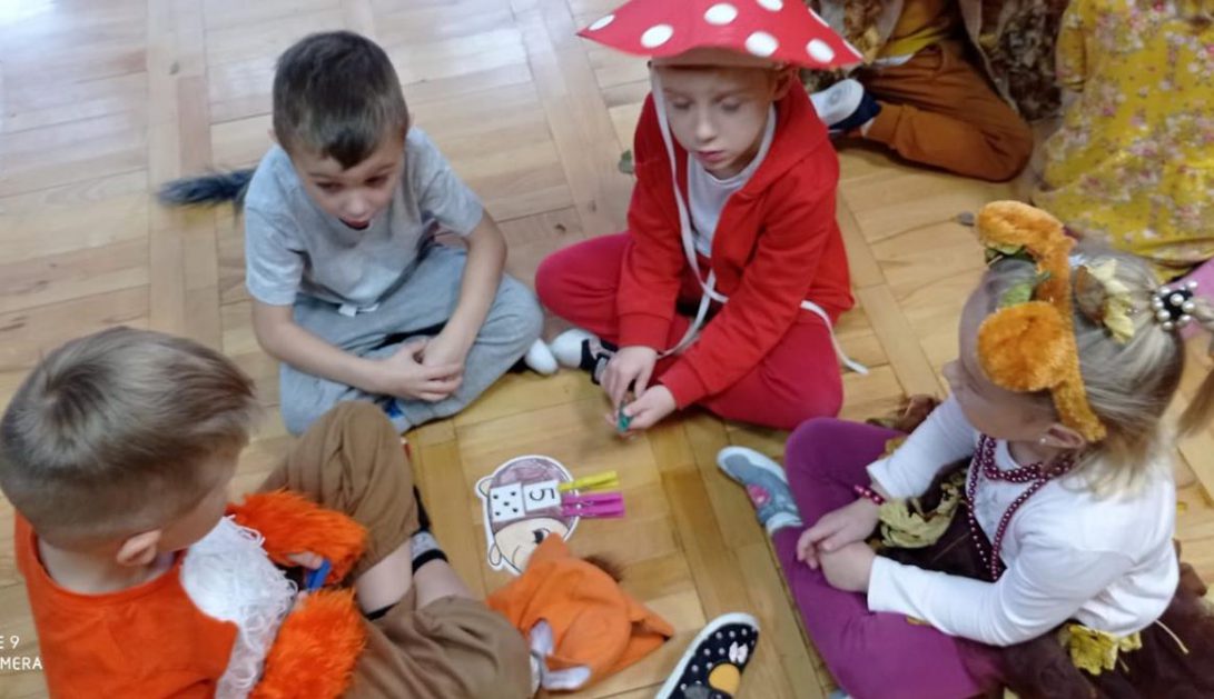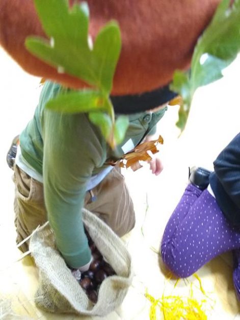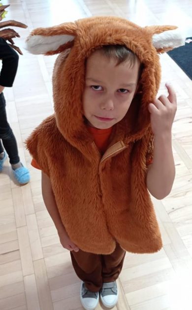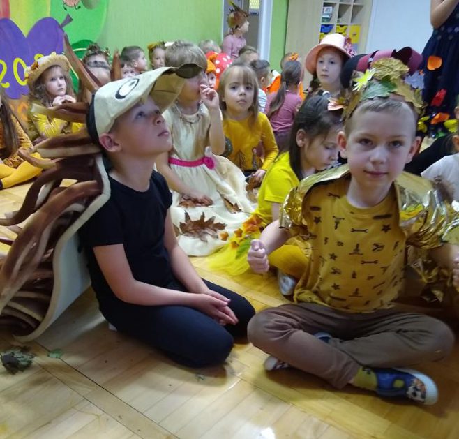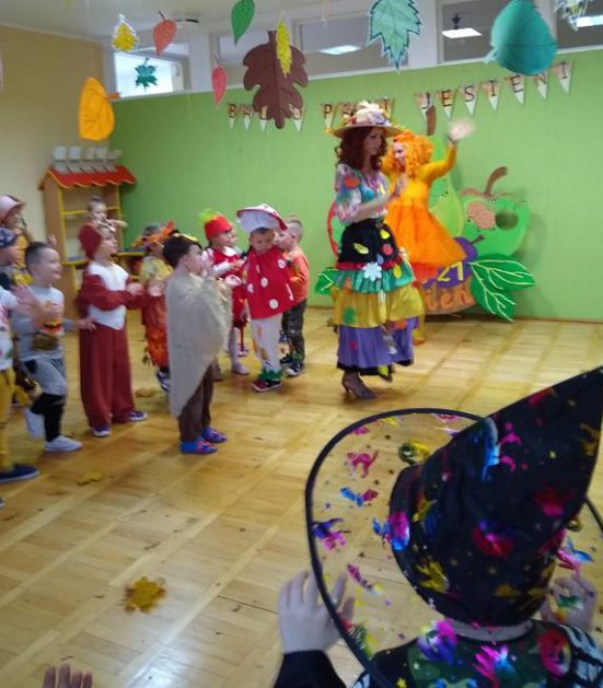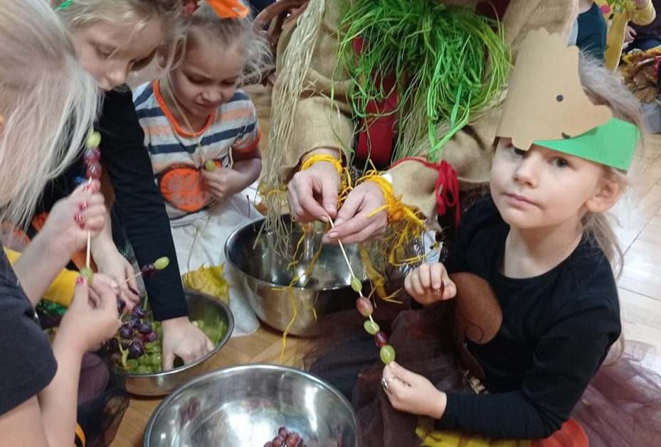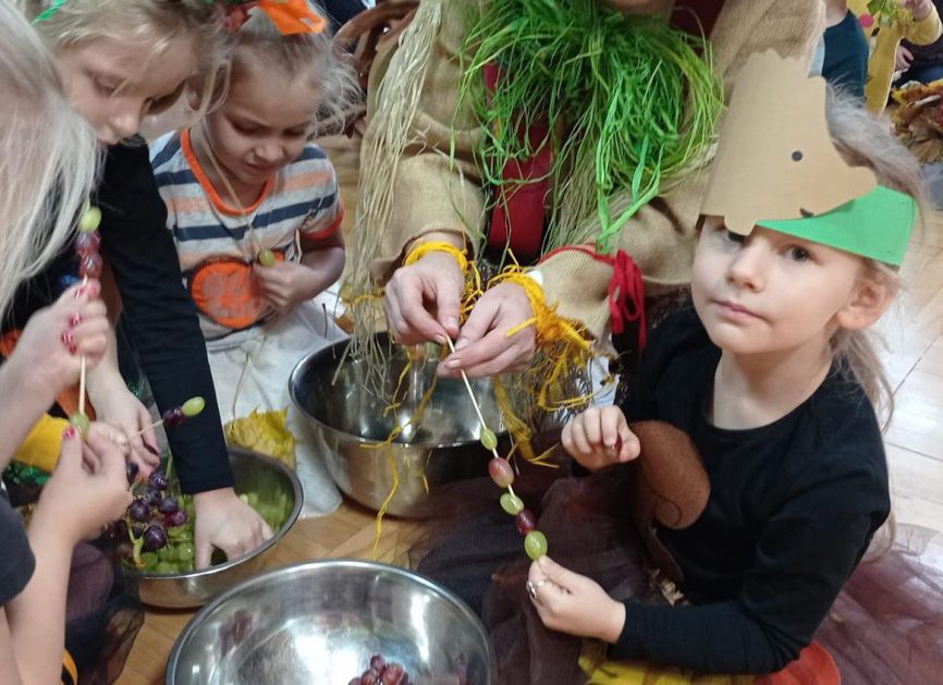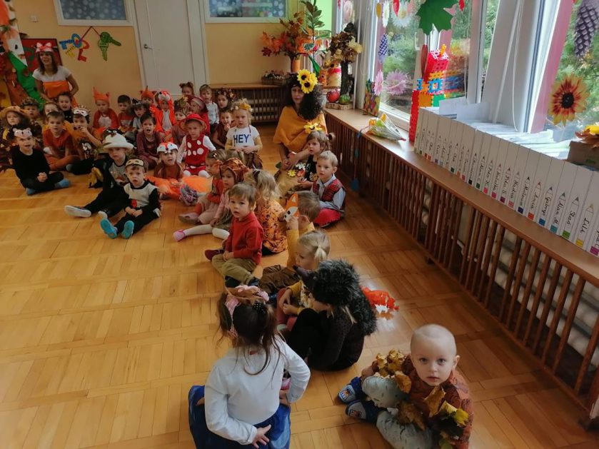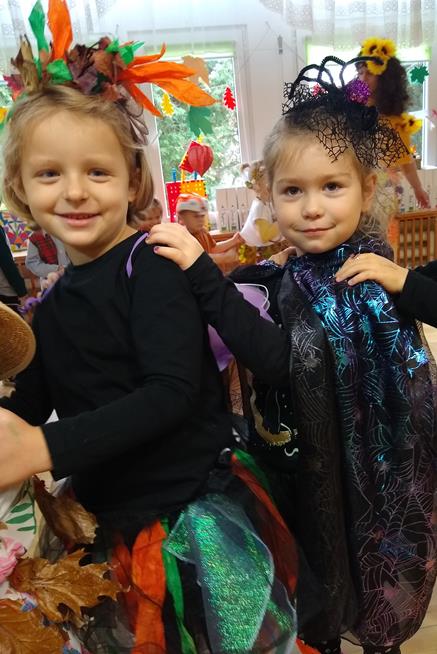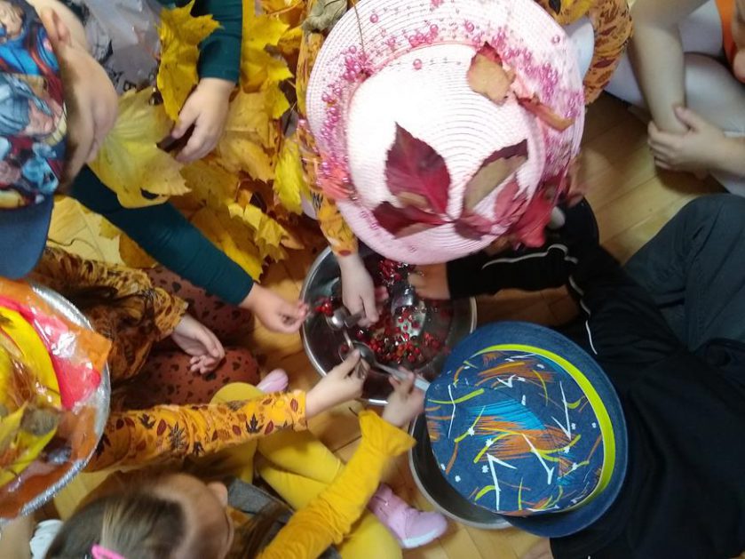 Każda grupa przygotowała zabawy taneczne. Pani Jesień przyniosła dla dzieci mnóstwo atrakcji, zadbała o to, aby dla każdego było coś ciekawego a więc była także gimnastyka umysłu, zagadki, quizy o tematyce jesiennej, podczas których dzieci utrwalały zdobyte wiadomości. Na zakończenie dzieci dostały niespodzianki – woreczek kasztanów! Zdziwienie dzieci było ogromne, ale w środku kryły się jadalne smakołyki!