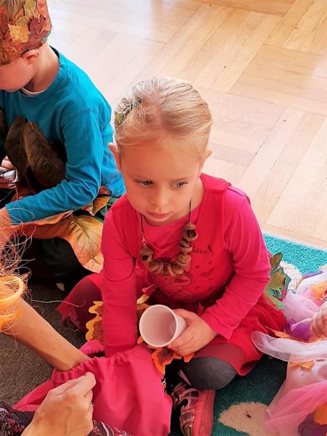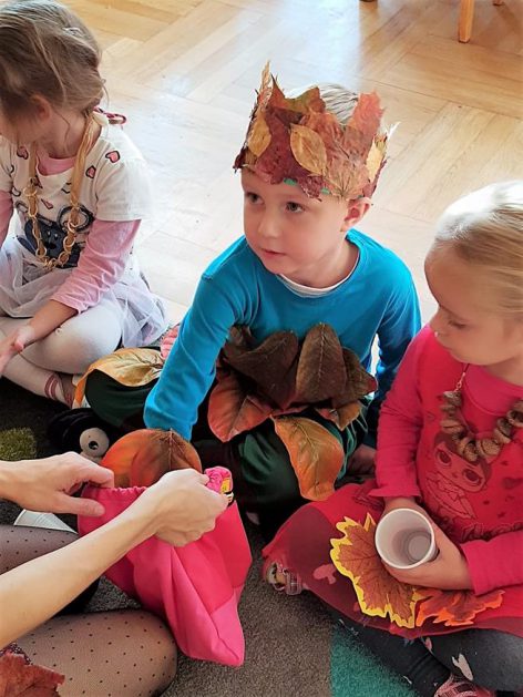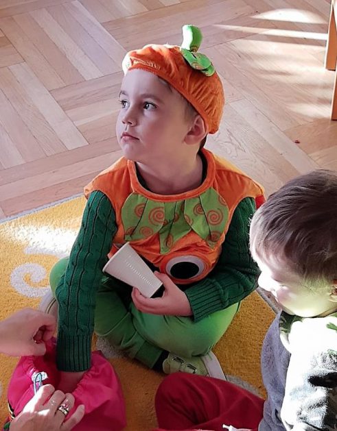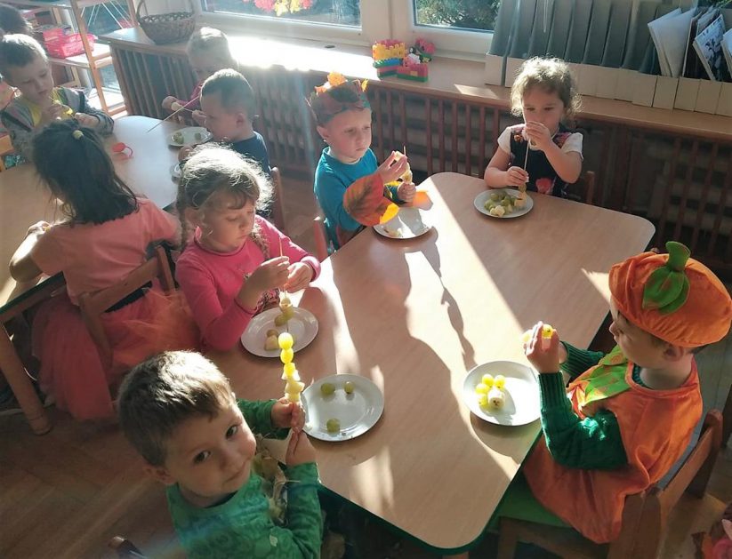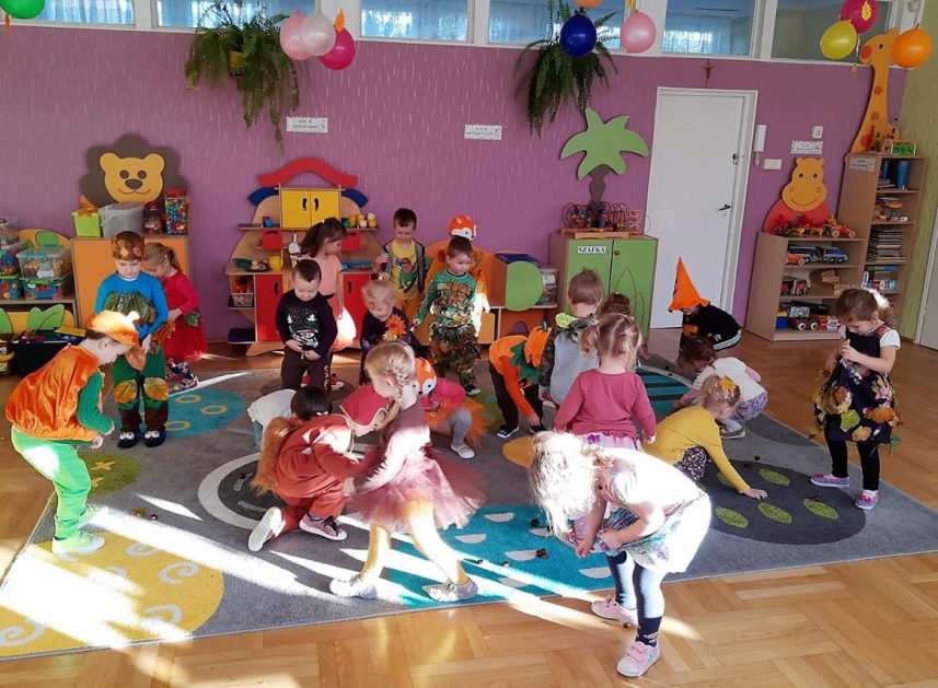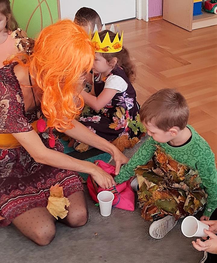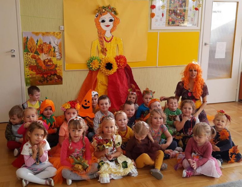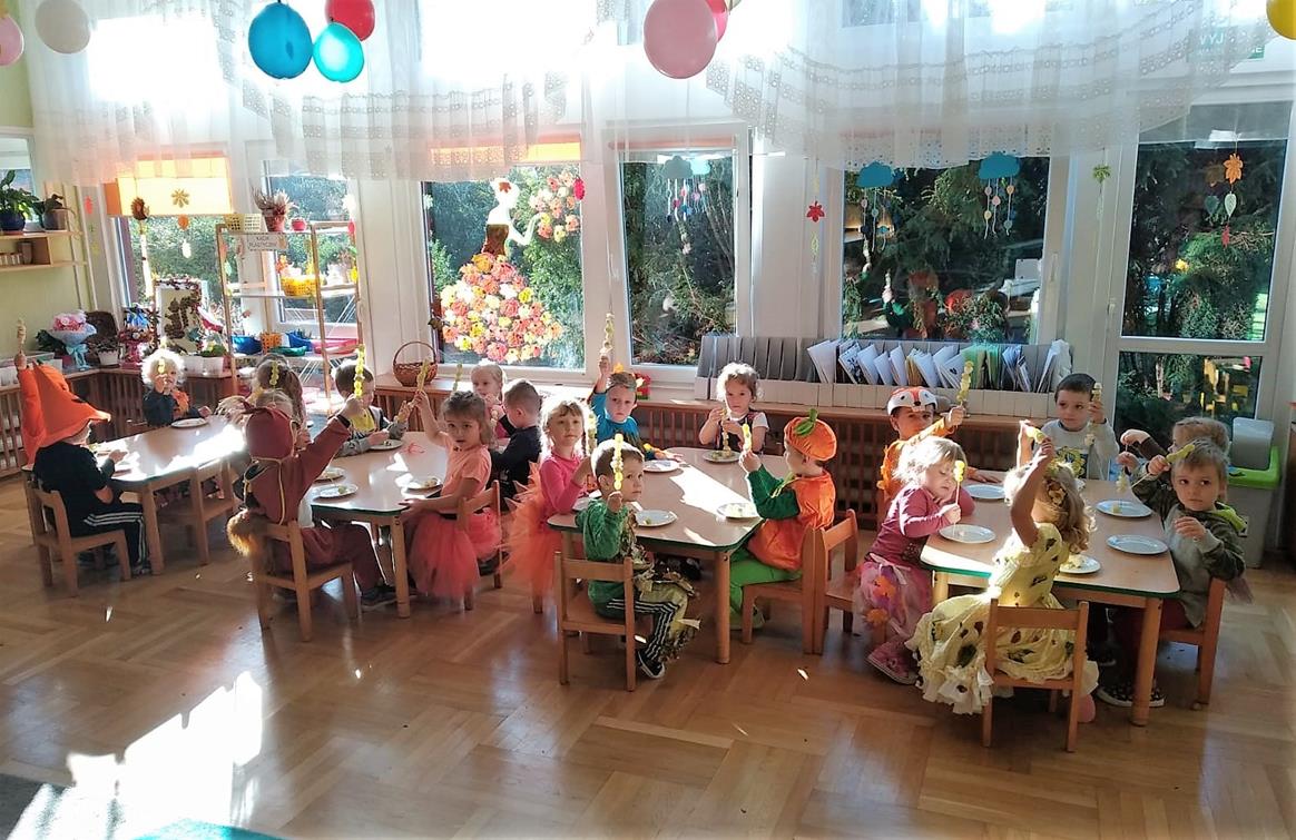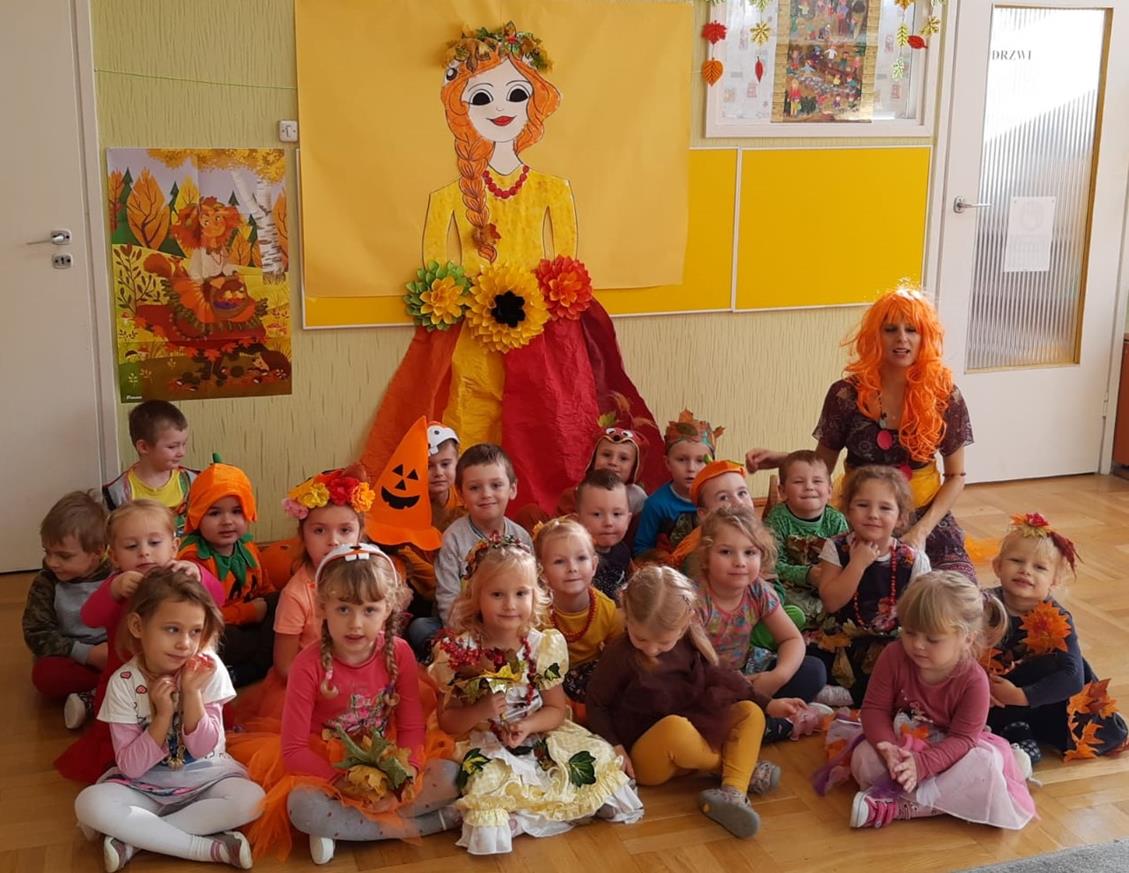 Wszystko za sprawą balu pod czujnym okiem Pani Jesieni, który odbył się w naszym przedszkolu 21 i 22 października. W tym roku Pani Jesień wraz z Krasnalem Hałabałą zawitała do każdej sali. Na bal przybyły również muchomorki, jeże, wiewiórki, lisy, zajączki, jesienne listki i jarzębinki. Zabawy było co niemiara. W każdej grupie przedszkolaki uczestniczyły w różnych zabawach i konkursach, robiły soki owocowo – warzywne, witaminki na patyku – szaszłyki. Nie zabrakło również wspólnych pląsów i tańców. A starszaki pięknie recytowały wiersze i śpiewały piosenki dla pani Jesieni na konkursie pod hasłem „Mam talent”. Jak na najstarsze przedszkolaki przystało uczestnicy konkursu spisali się na medal. Wszyscy bawili się doskonale, czego dowodem były przepiękne uśmiechy na twarzach dzieci.