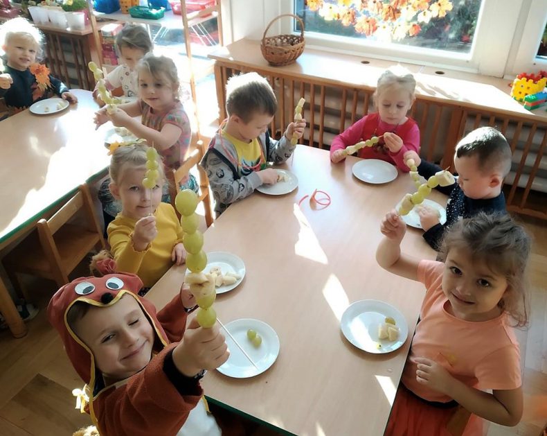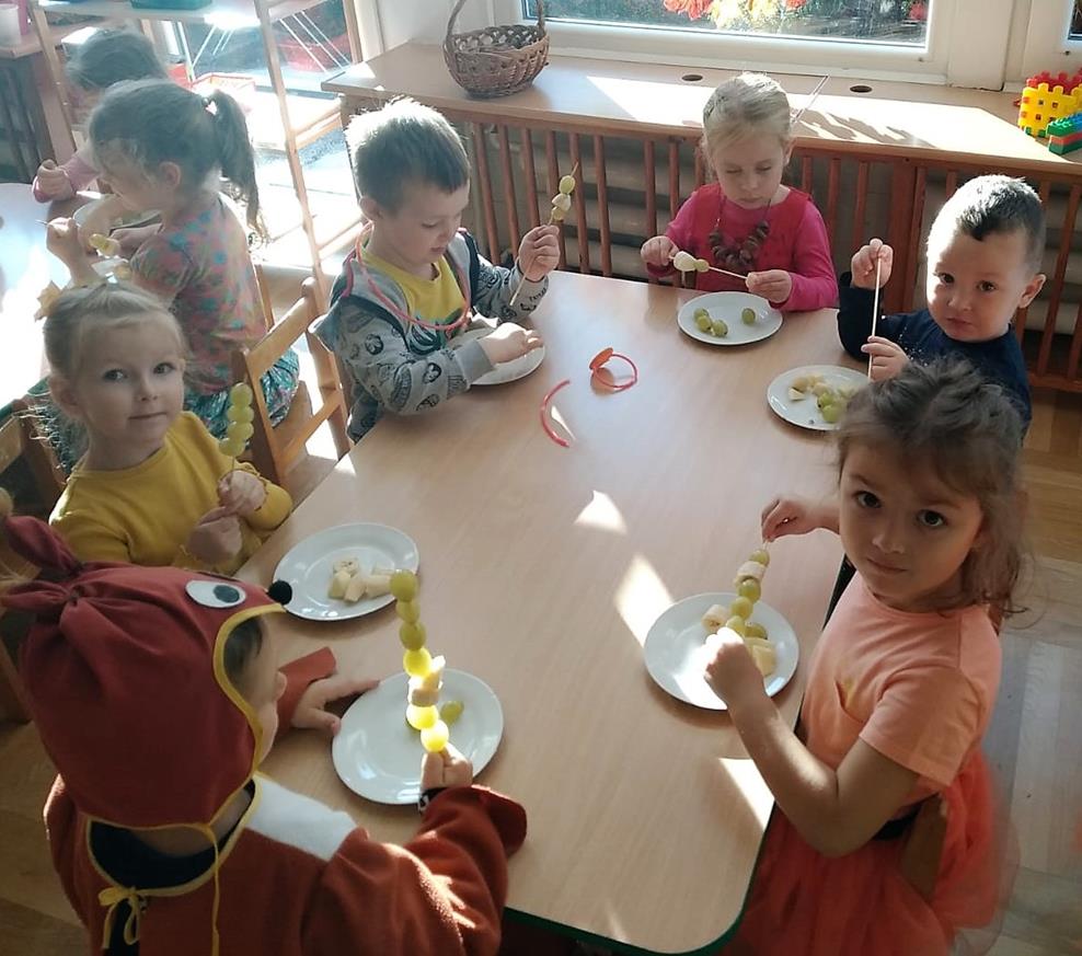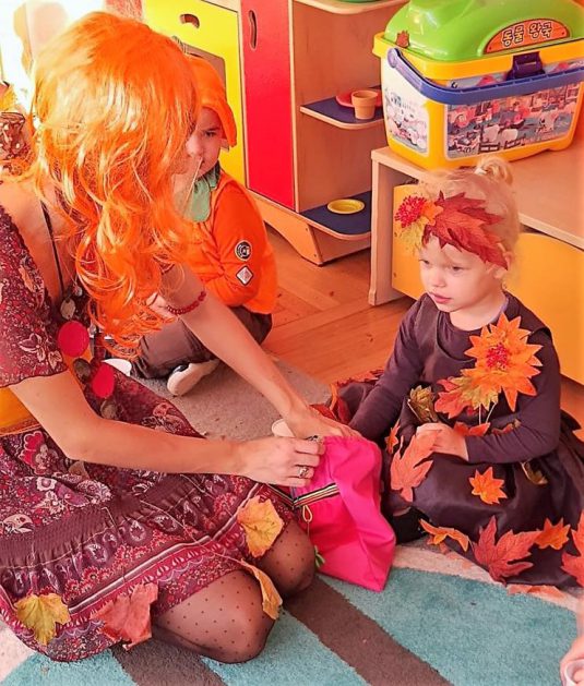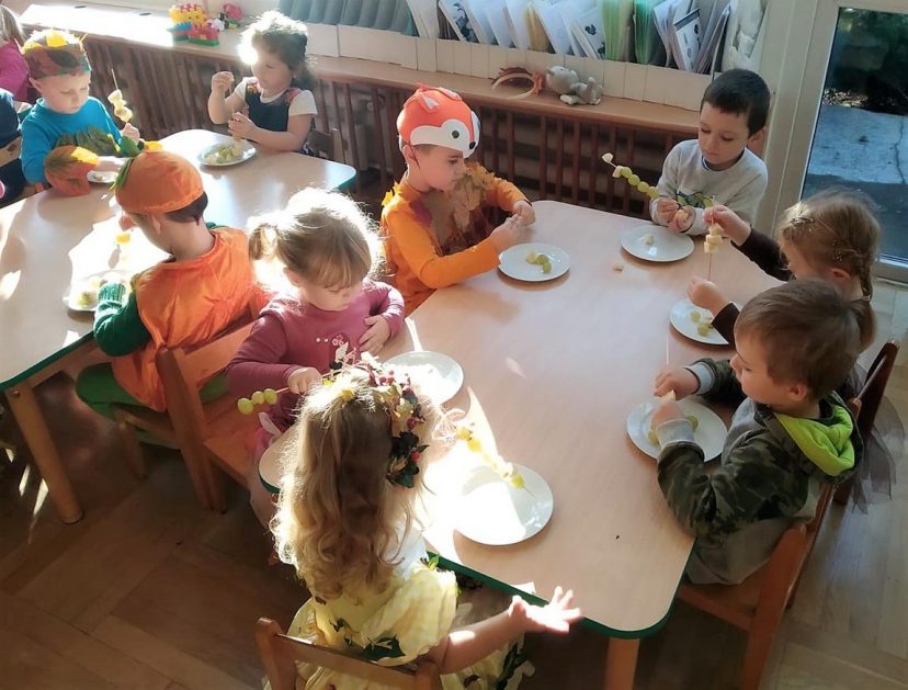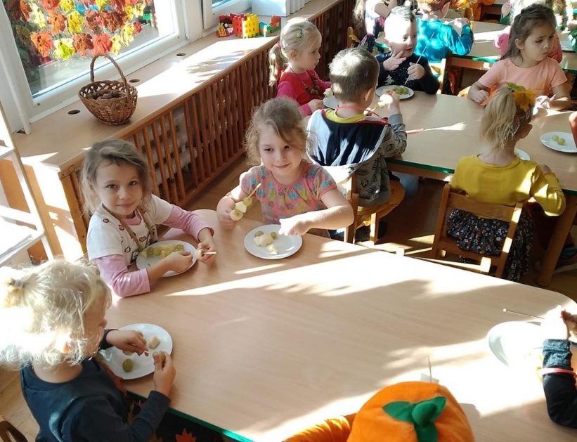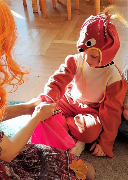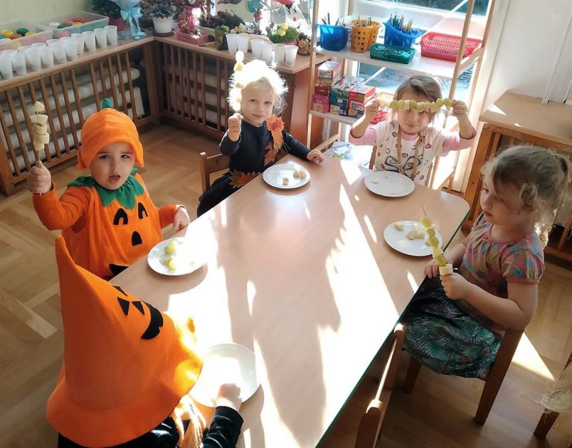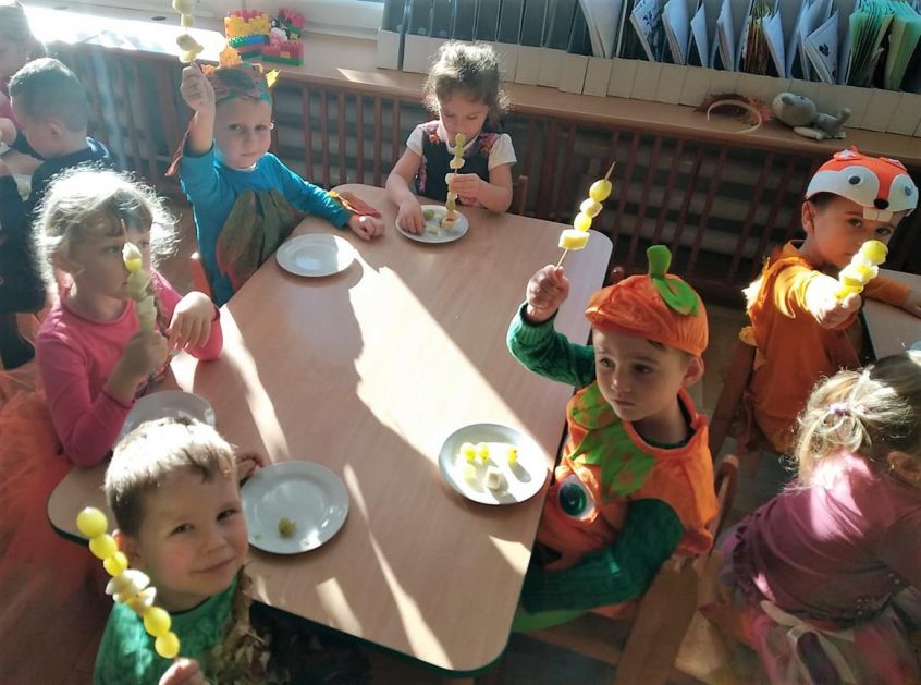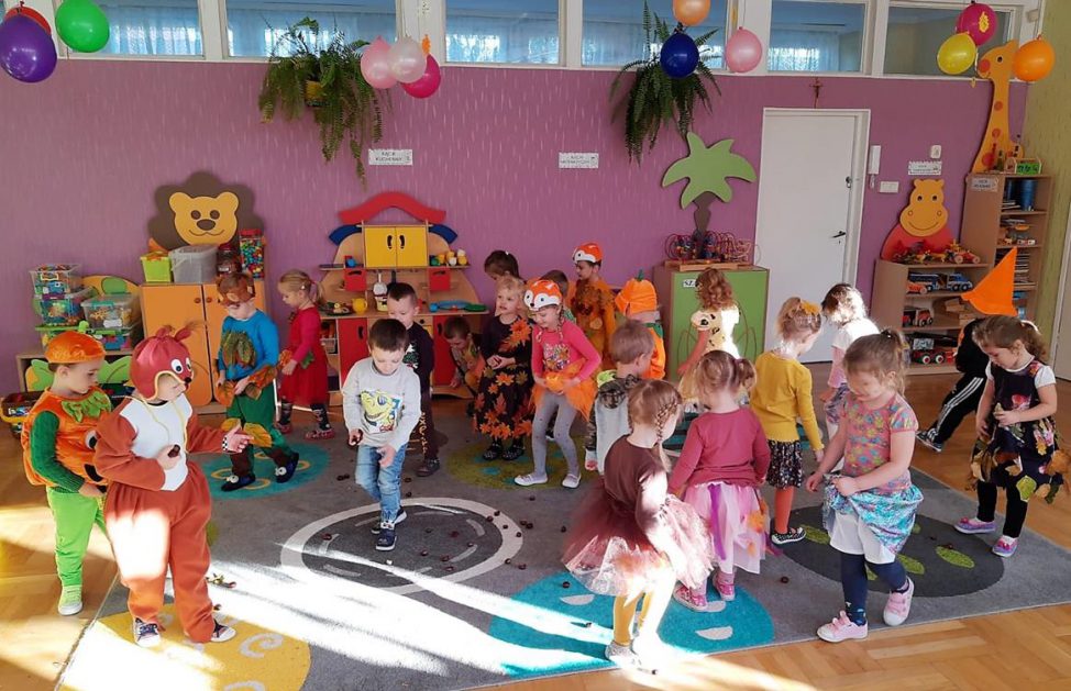 Wszystko za sprawą balu pod czujnym okiem Pani Jesieni, który odbył się w naszym przedszkolu 21 i 22 października. W tym roku Pani Jesień wraz z Krasnalem Hałabałą zawitała do każdej sali. Na bal przybyły również muchomorki, jeże, wiewiórki, lisy, zajączki, jesienne listki i jarzębinki. Zabawy było co niemiara. W każdej grupie przedszkolaki uczestniczyły w różnych zabawach i konkursach, robiły soki owocowo – warzywne, witaminki na patyku – szaszłyki. Nie zabrakło również wspólnych pląsów i tańców. A starszaki pięknie recytowały wiersze i śpiewały piosenki dla pani Jesieni na konkursie pod hasłem „Mam talent”. Jak na najstarsze przedszkolaki przystało uczestnicy konkursu spisali się na medal. Wszyscy bawili się doskonale, czego dowodem były przepiękne uśmiechy na twarzach dzieci.