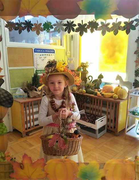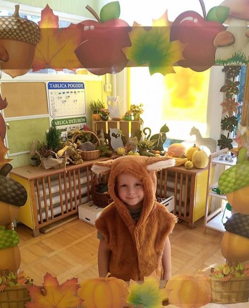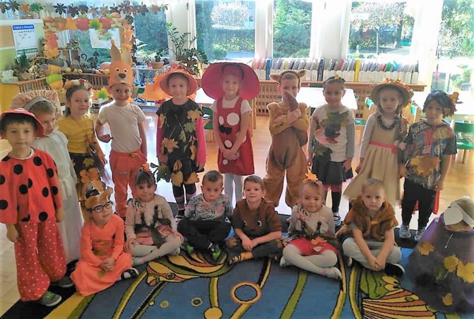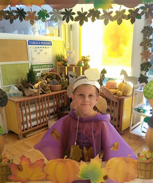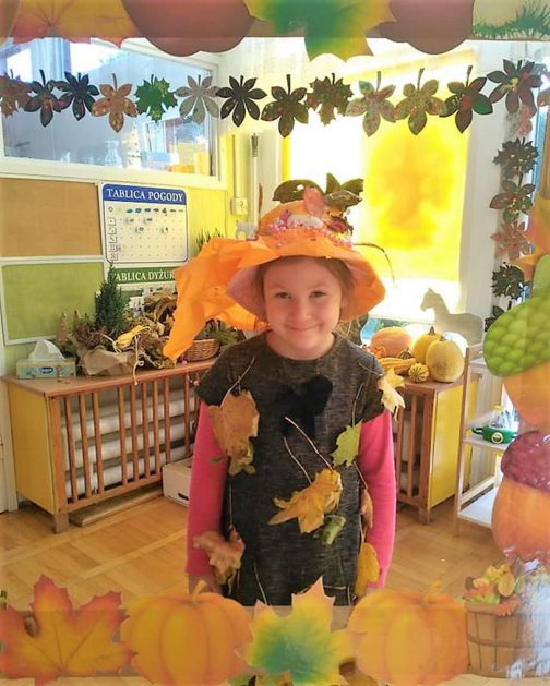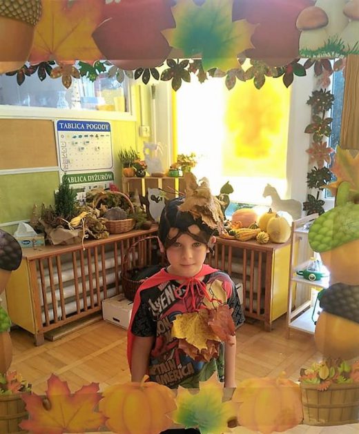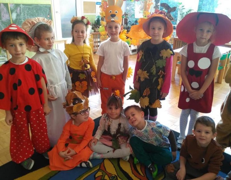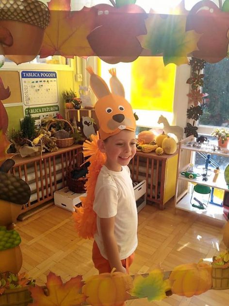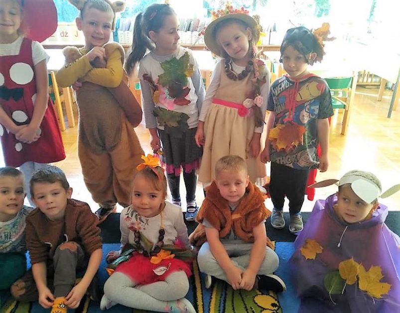 Wszystko za sprawą balu pod czujnym okiem Pani Jesieni, który odbył się w naszym przedszkolu 21 i 22 października. W tym roku Pani Jesień wraz z Krasnalem Hałabałą zawitała do każdej sali. Na bal przybyły również muchomorki, jeże, wiewiórki, lisy, zajączki, jesienne listki i jarzębinki. Zabawy było co niemiara. W każdej grupie przedszkolaki uczestniczyły w różnych zabawach i konkursach, robiły soki owocowo – warzywne, witaminki na patyku – szaszłyki. Nie zabrakło również wspólnych pląsów i tańców. A starszaki pięknie recytowały wiersze i śpiewały piosenki dla pani Jesieni na konkursie pod hasłem „Mam talent”. Jak na najstarsze przedszkolaki przystało uczestnicy konkursu spisali się na medal. Wszyscy bawili się doskonale, czego dowodem były przepiękne uśmiechy na twarzach dzieci.