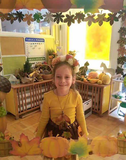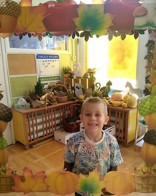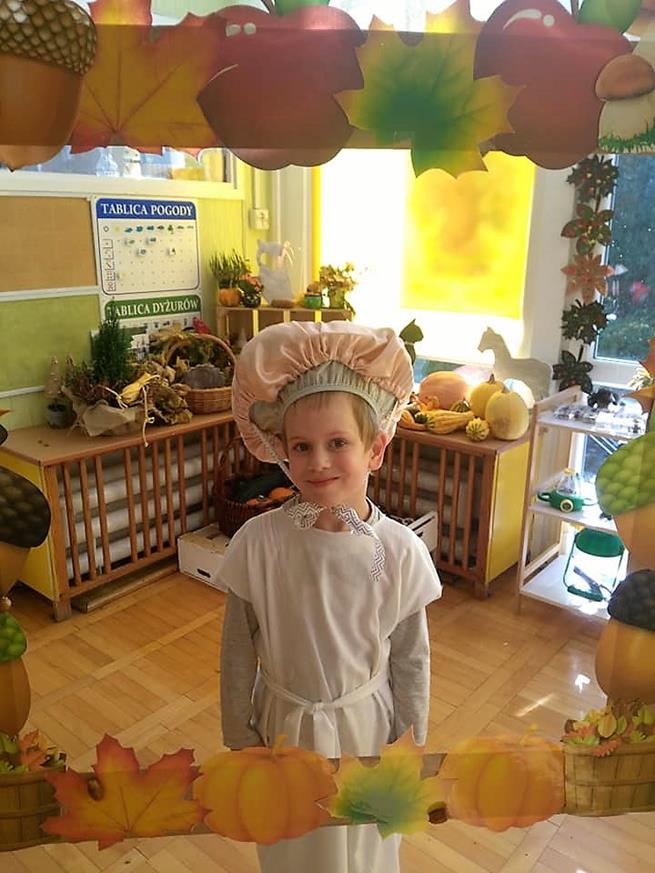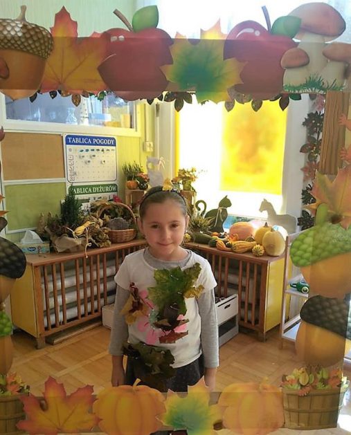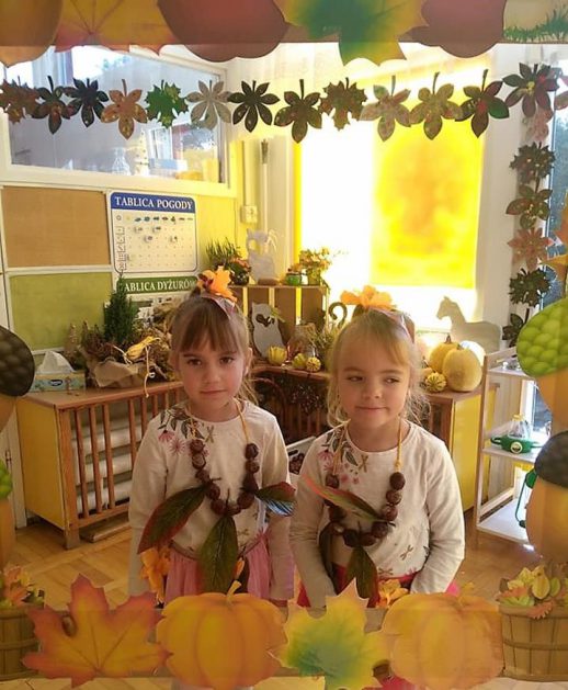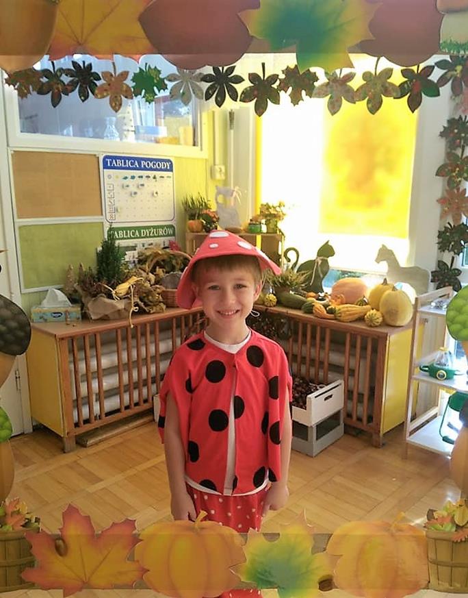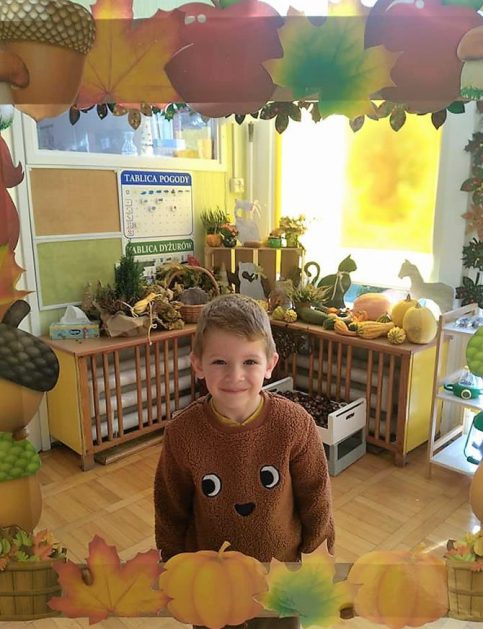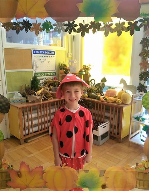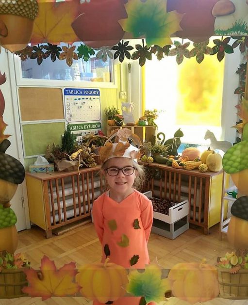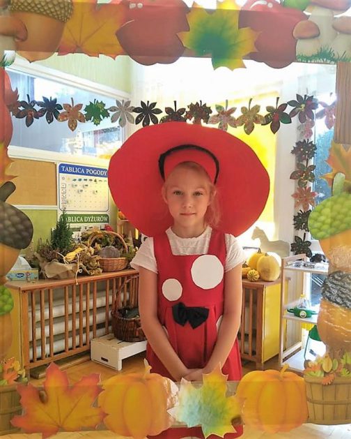 Wszystko za sprawą balu pod czujnym okiem Pani Jesieni, który odbył się w naszym przedszkolu 21 i 22 października. W tym roku Pani Jesień wraz z Krasnalem Hałabałą zawitała do każdej sali. Na bal przybyły również muchomorki, jeże, wiewiórki, lisy, zajączki, jesienne listki i jarzębinki. Zabawy było co niemiara. W każdej grupie przedszkolaki uczestniczyły w różnych zabawach i konkursach, robiły soki owocowo – warzywne, witaminki na patyku – szaszłyki. Nie zabrakło również wspólnych pląsów i tańców. A starszaki pięknie recytowały wiersze i śpiewały piosenki dla pani Jesieni na konkursie pod hasłem „Mam talent”. Jak na najstarsze przedszkolaki przystało uczestnicy konkursu spisali się na medal. Wszyscy bawili się doskonale, czego dowodem były przepiękne uśmiechy na twarzach dzieci.