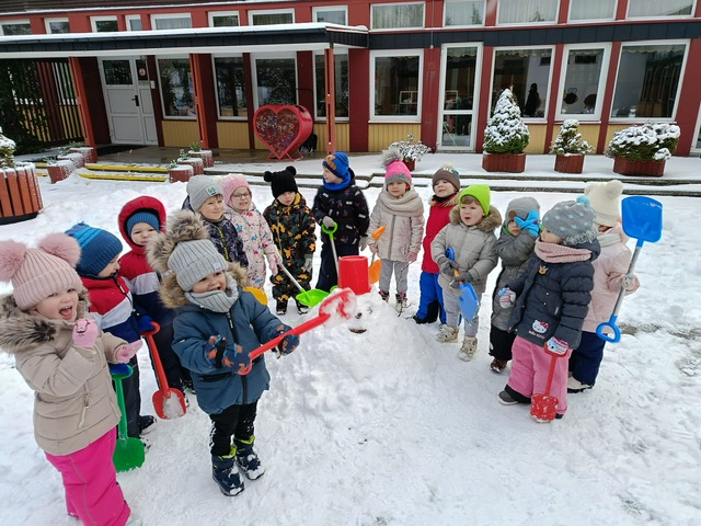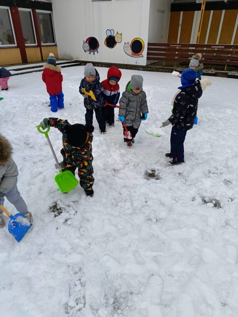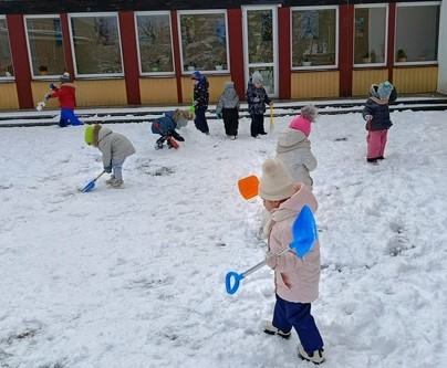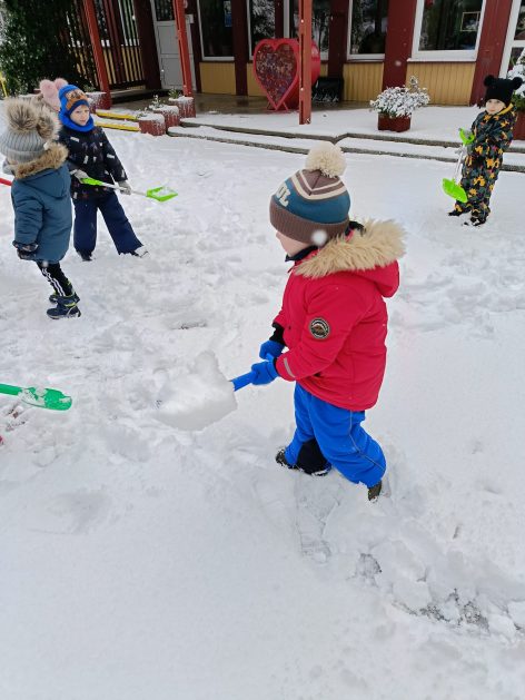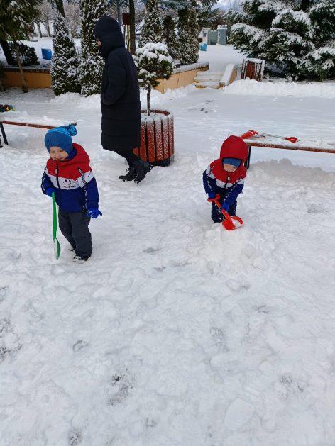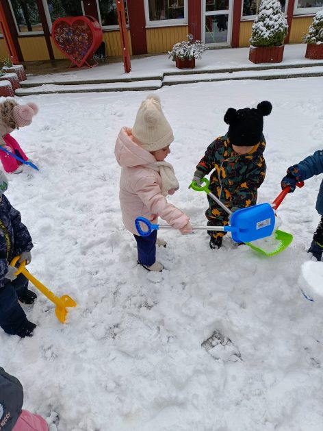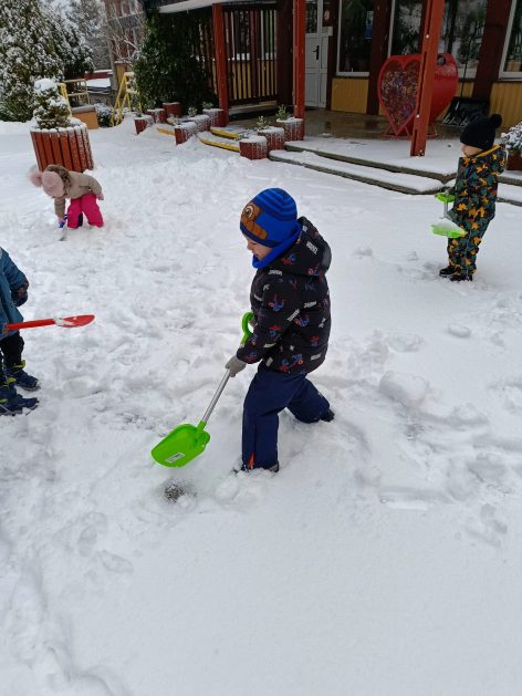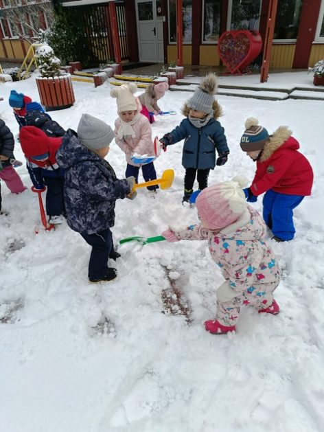„Zima, zima, zima. Pada, pada śnieg…” – dzisiaj 3-latki korzystały z uroków prawdziwej zimy. Lepienie bałwana sprawiło dzieciom wiele radości, okazało się że łopatka może służyć nie tylko do piasku…