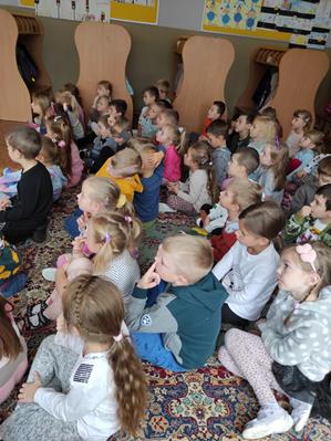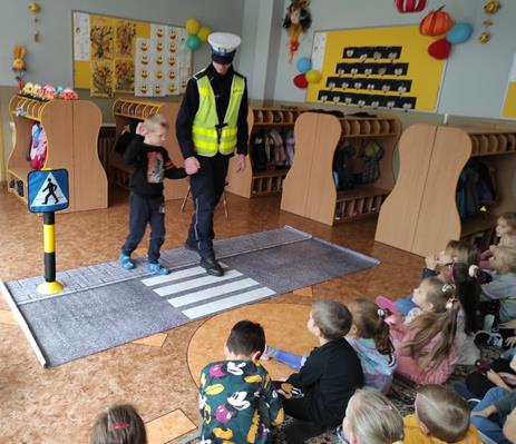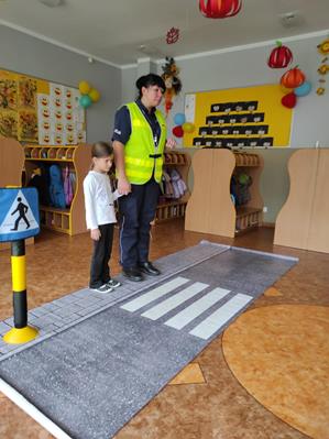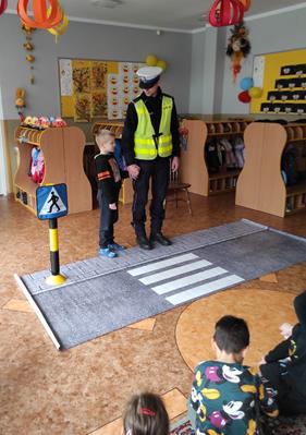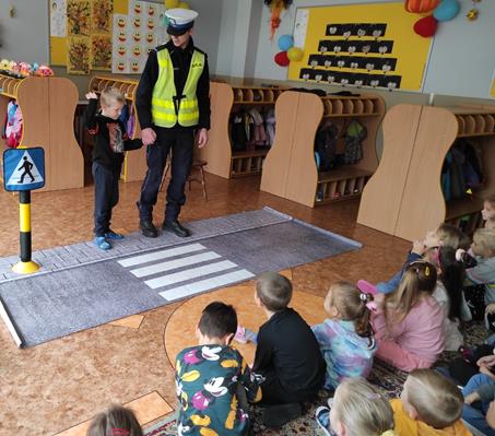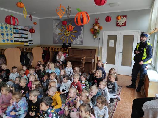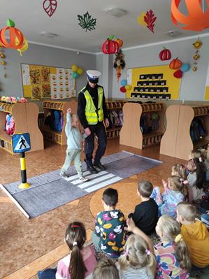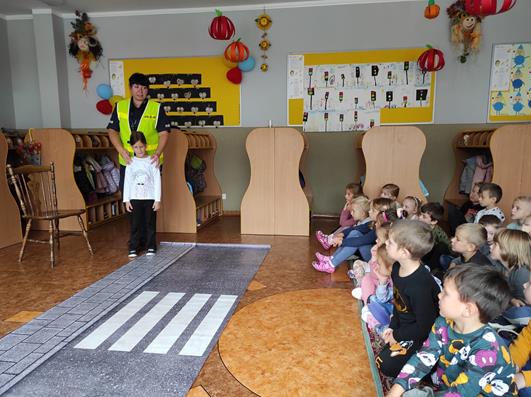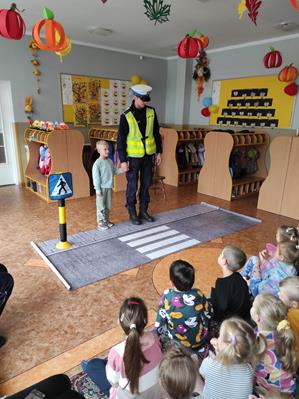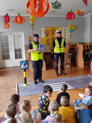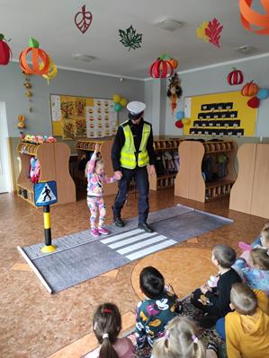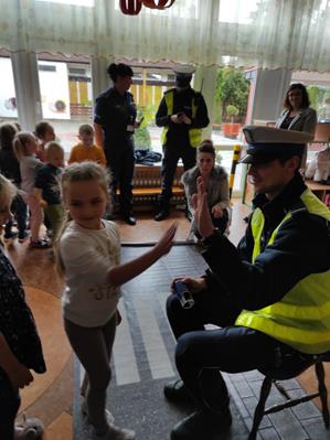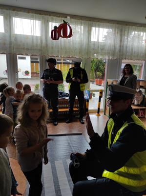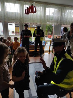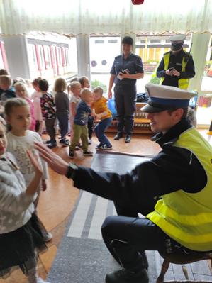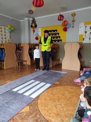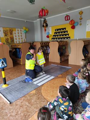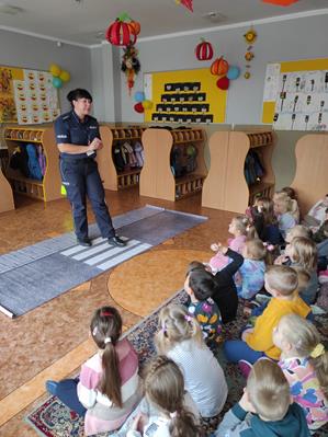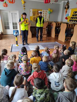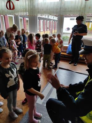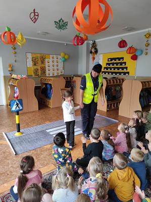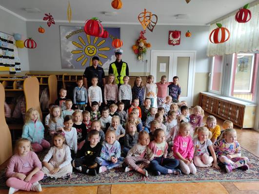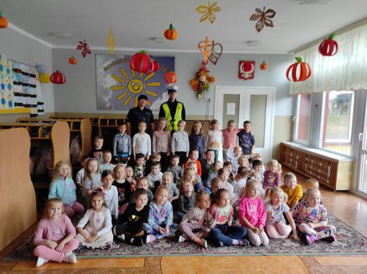 Nasze przedszkolaki gościły u siebie przedstawicieli policji. Głównym celem spotkania było zapoznanie z niebezpieczeństwami grożącymi w trakcie drogi do przedszkola, uświadomienie dziecka jak prawidłowo należy korzystać z drogi oraz jak zachować się, gdy spotkają na swojej drodze obcą osobę. Przedszkolaki utrwaliły również numery alarmowe, a dzięki specjalnym rekwizytom mogły czynnie przećwiczyć i utrwalić właściwe i poprawne reakcje na drodze. Policjanci podkreślili również, jak ważne dla własnego bezpieczeństwa jest noszenie elementów odblaskowych, szczególnie teraz w okresie jesiennym. Na zakończenie spotkania dzieci dostały znaczki odblaskowe.
