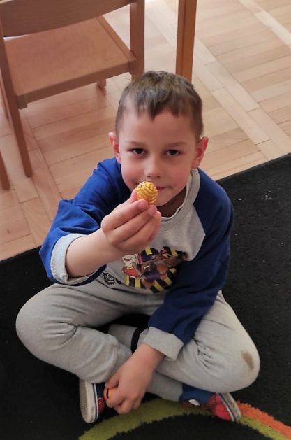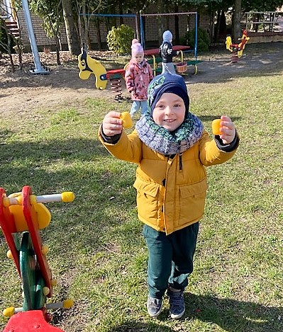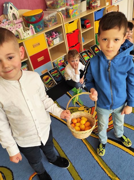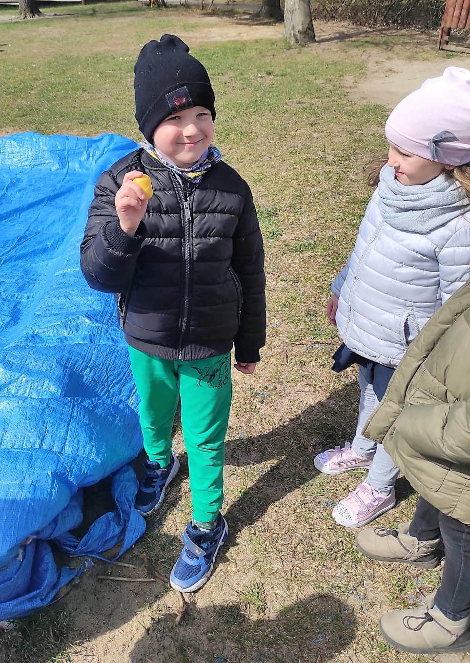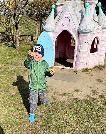 Zajączek Wielkanocny 14.04 do drzwi przedszkola zapukał, z koszyczkiem pełnym jajek, wesołych dzieci szukał. Jajka były niezwykłe a w środku miały słodkie niespodzianki. Spieszył się bardzo, więc zostawił jajka w ogródku przedszkolnym i na pożegnanie pomachał ogonkiem okrąglutkim. Dzieci o wizycie się dowiedziały i szybko na dwór się wybrały. Każdy jajeczko odszukał i słodką niespodziankę schrupał. Na dzień dobry miła osłoda, ale później zajączek jeszcze coś dodał…