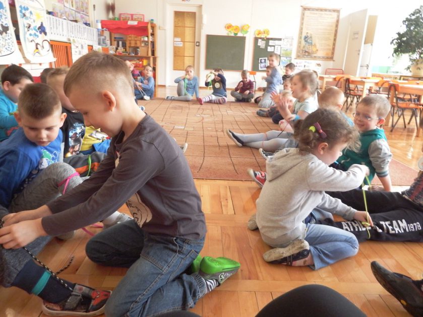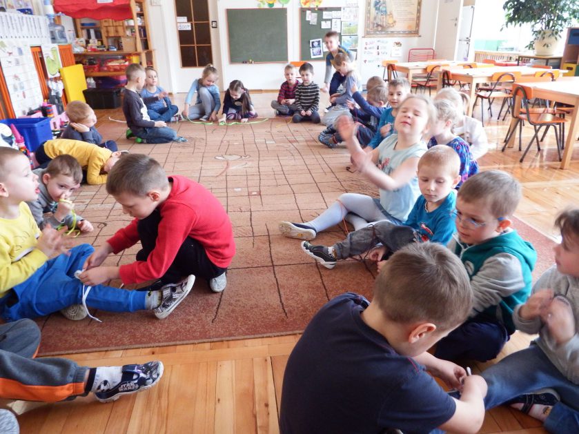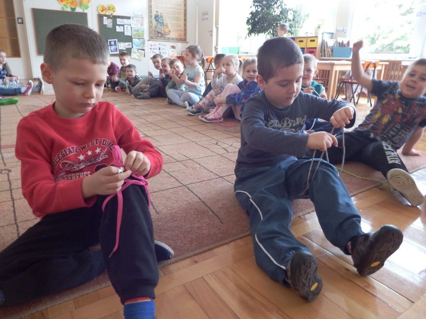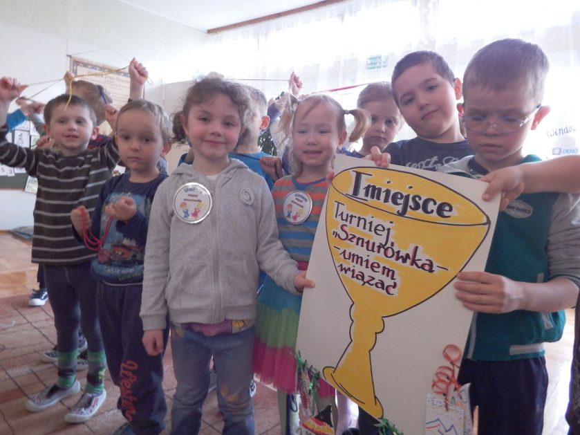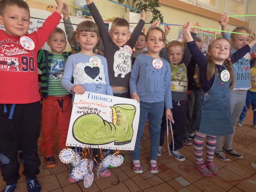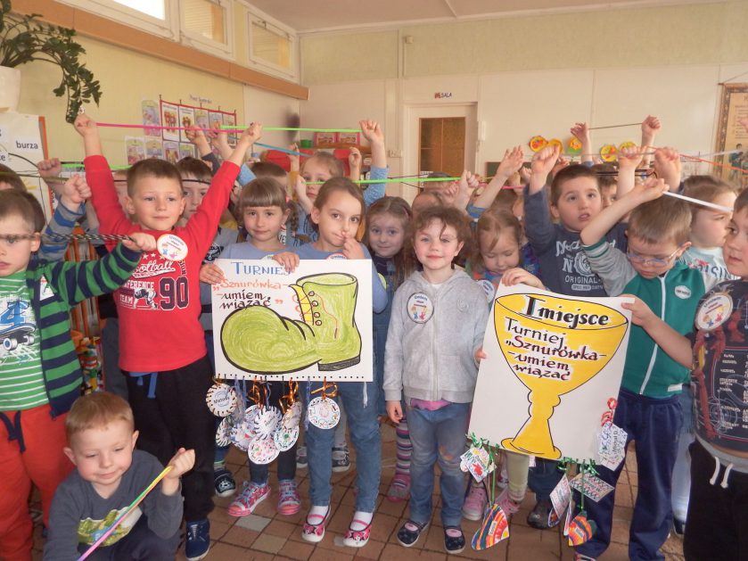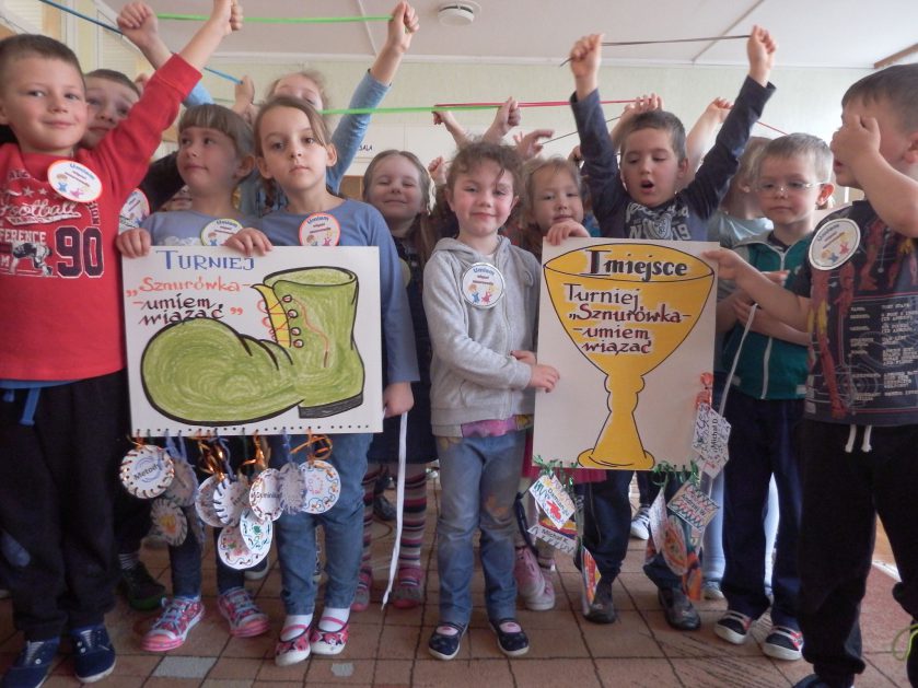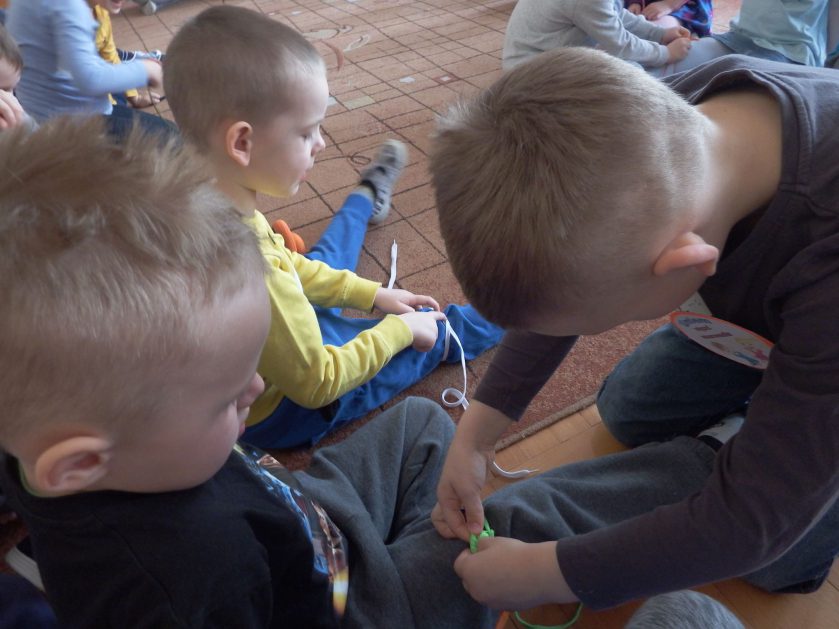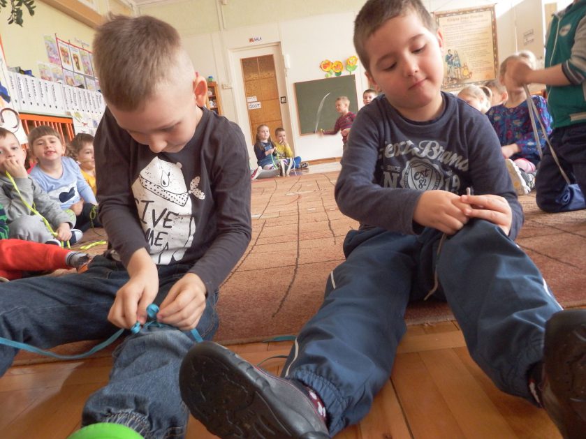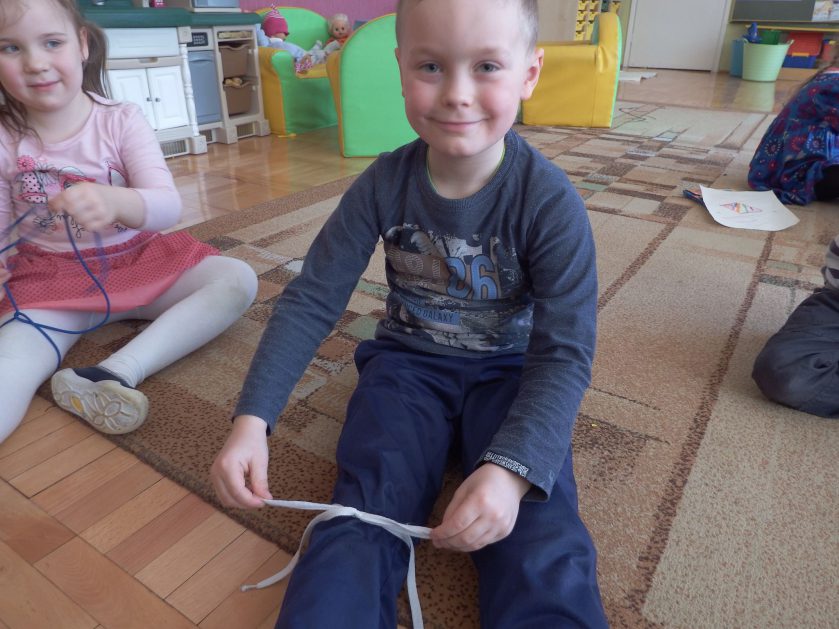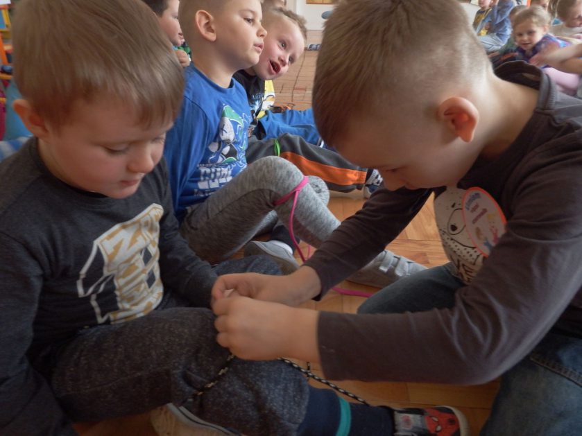 Chociaż każdy z nas jest mały, ale chce być doskonały. Trudna sztuka wiązania nie jest łatwa dla każdego 5 latka, w wolnych chwilach się staramy i ćwiczymy sznurowanie ….Aż dnia pewnego doszło do spotkania wielkiego, dwie grupy się spotkały i ze sobą rywalizowały, kto sprytniejszy, kto zwinniejszy…. Turniej „Sznurówka” zakończył się w miłej atmosferze, teraz dzieci wiedzą ,że trening czyni mistrza!