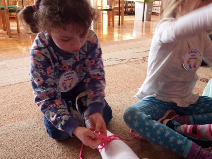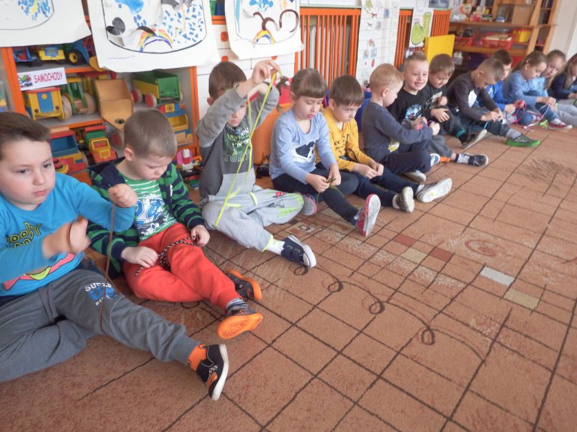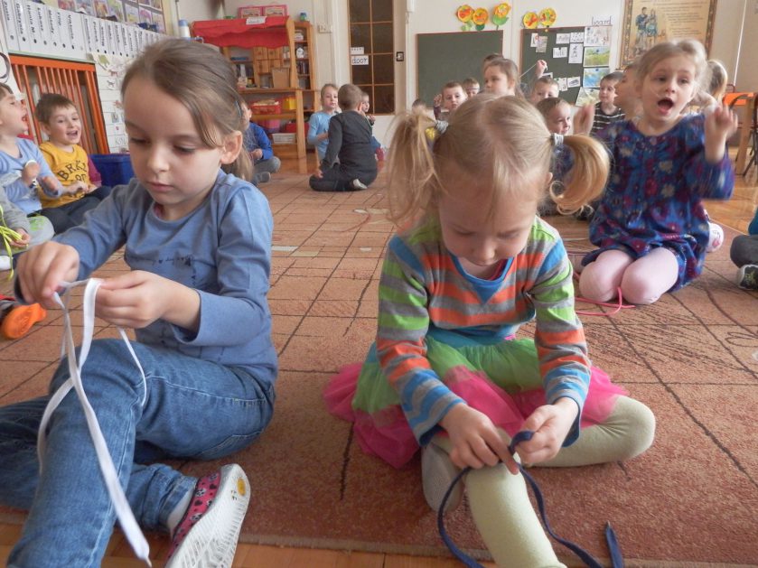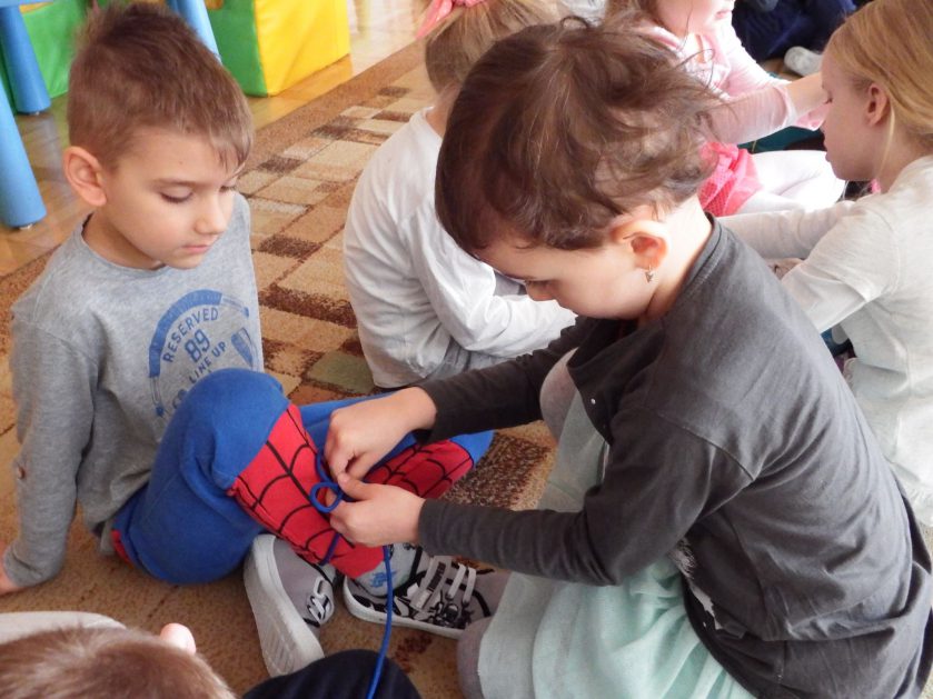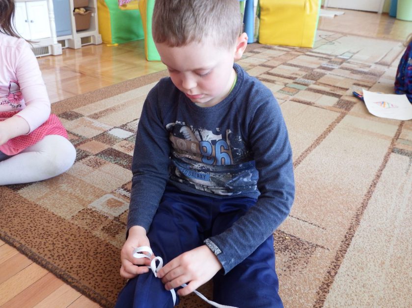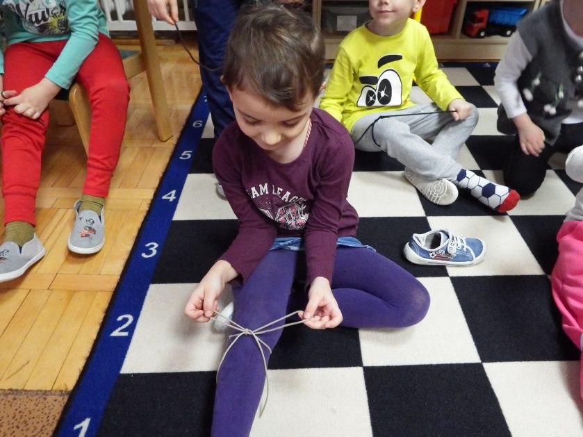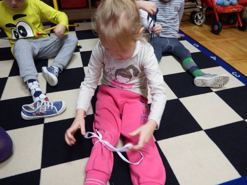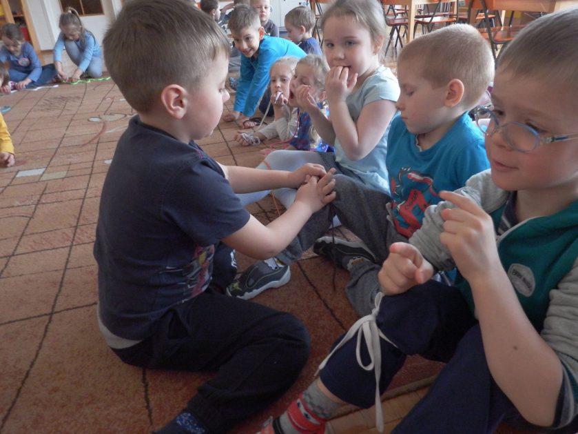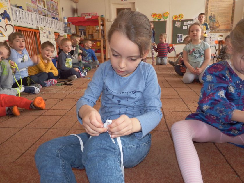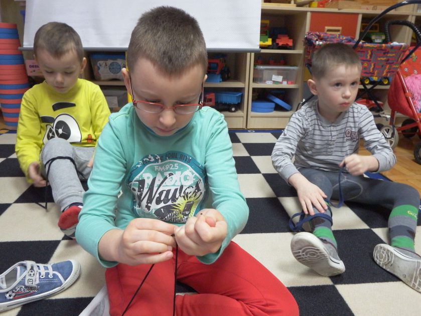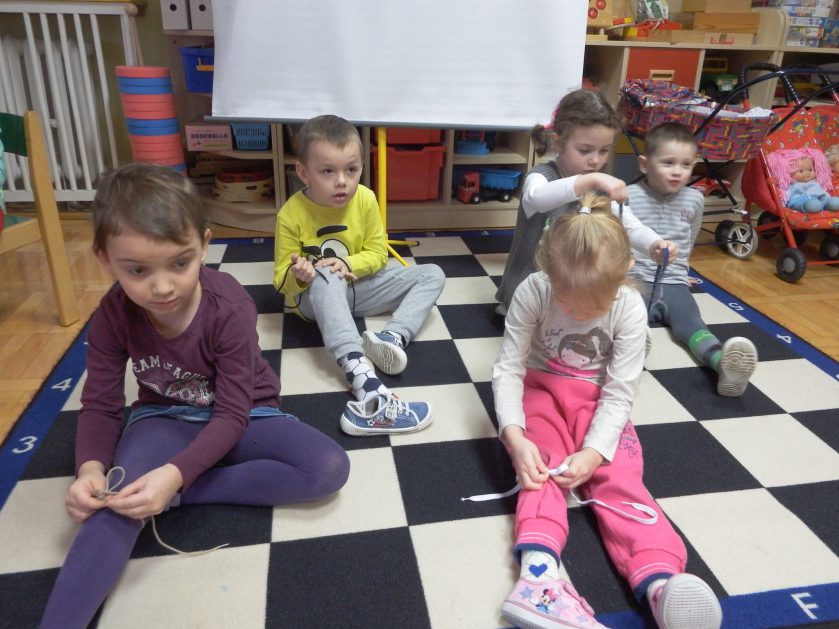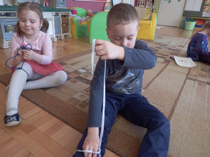 Chociaż każdy z nas jest mały, ale chce być doskonały. Trudna sztuka wiązania nie jest łatwa dla każdego 5 latka, w wolnych chwilach się staramy i ćwiczymy sznurowanie ….Aż dnia pewnego doszło do spotkania wielkiego, dwie grupy się spotkały i ze sobą rywalizowały, kto sprytniejszy, kto zwinniejszy…. Turniej „Sznurówka” zakończył się w miłej atmosferze, teraz dzieci wiedzą ,że trening czyni mistrza!