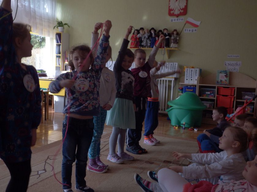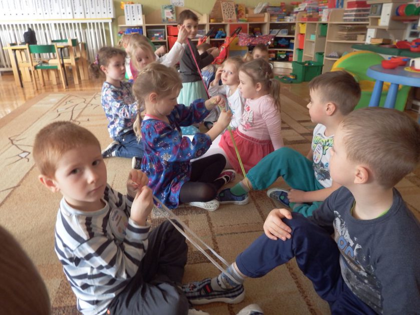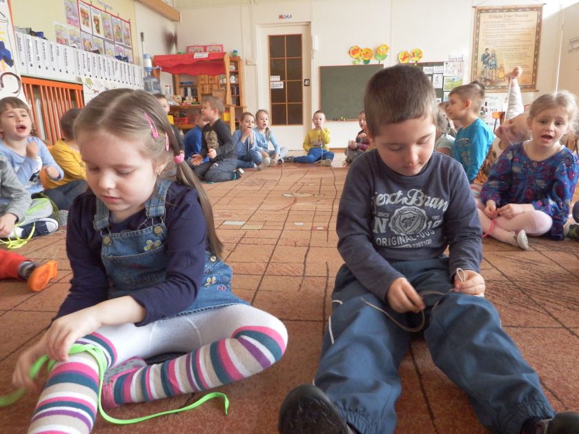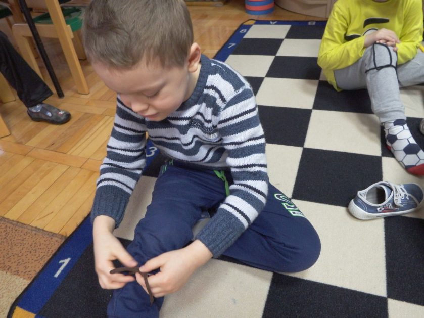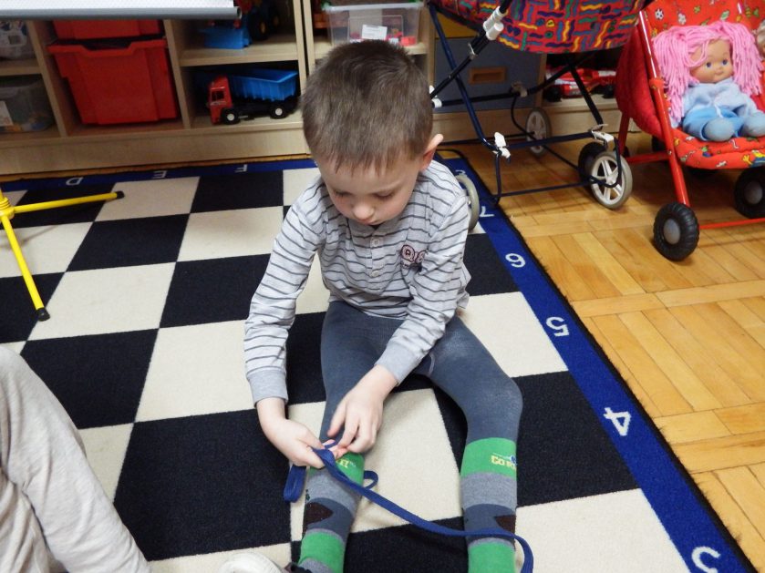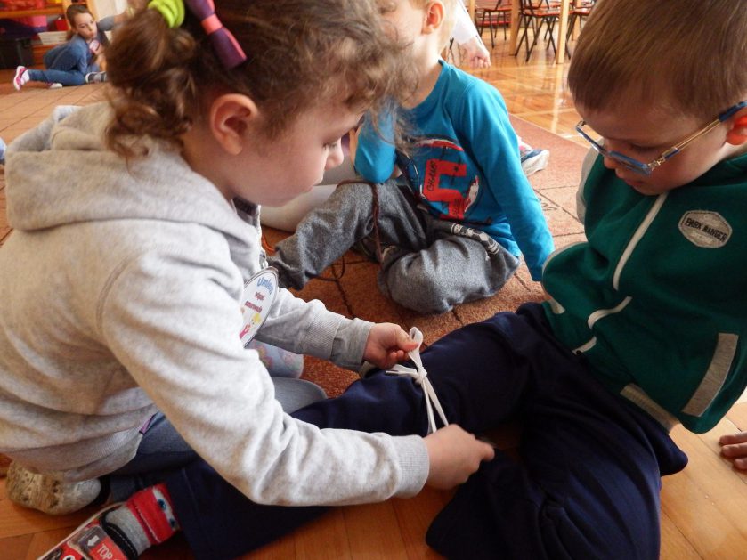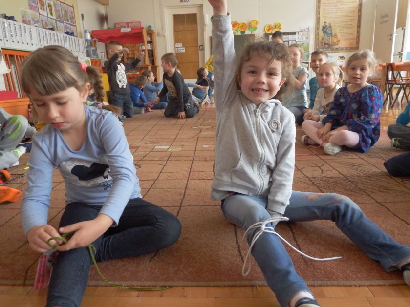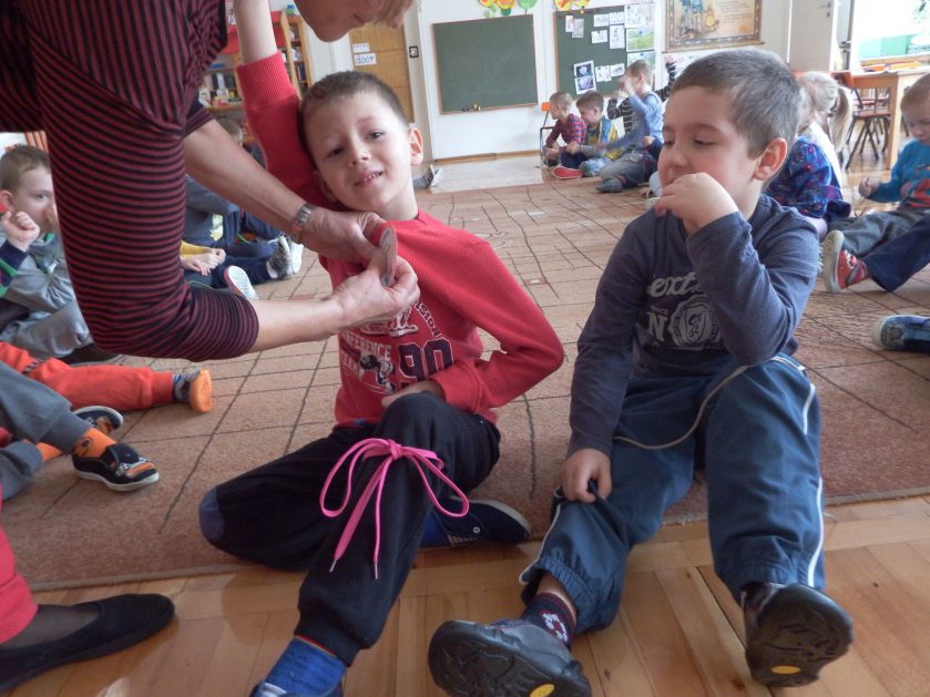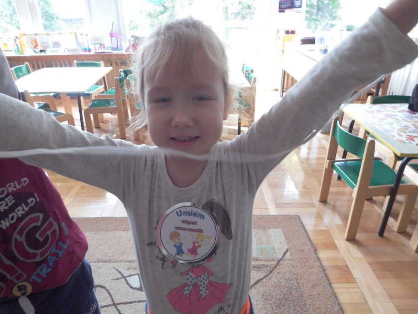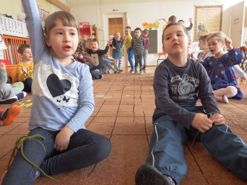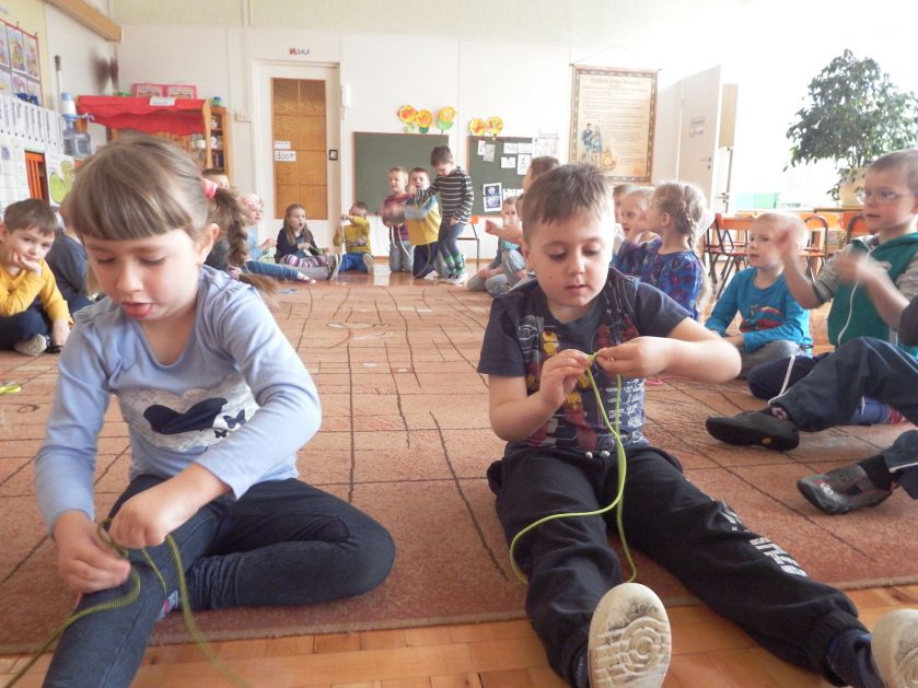 Chociaż każdy z nas jest mały, ale chce być doskonały. Trudna sztuka wiązania nie jest łatwa dla każdego 5 latka, w wolnych chwilach się staramy i ćwiczymy sznurowanie ….Aż dnia pewnego doszło do spotkania wielkiego, dwie grupy się spotkały i ze sobą rywalizowały, kto sprytniejszy, kto zwinniejszy…. Turniej „Sznurówka” zakończył się w miłej atmosferze, teraz dzieci wiedzą ,że trening czyni mistrza!