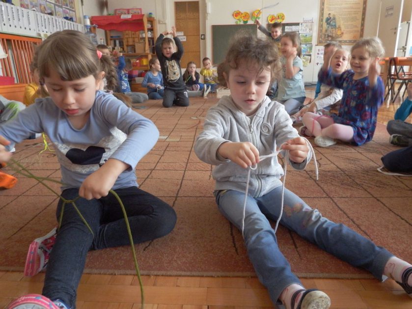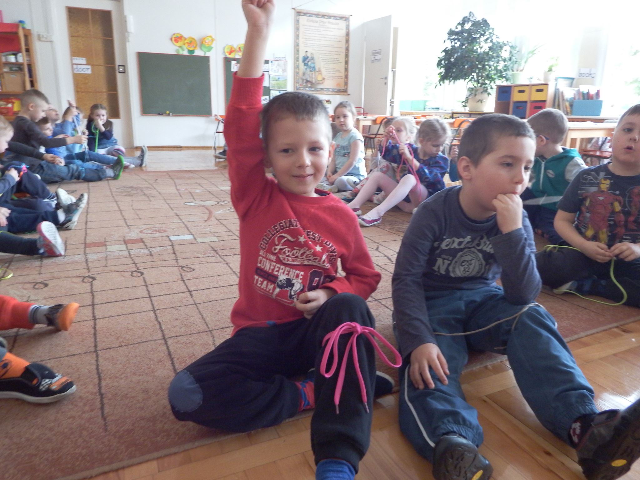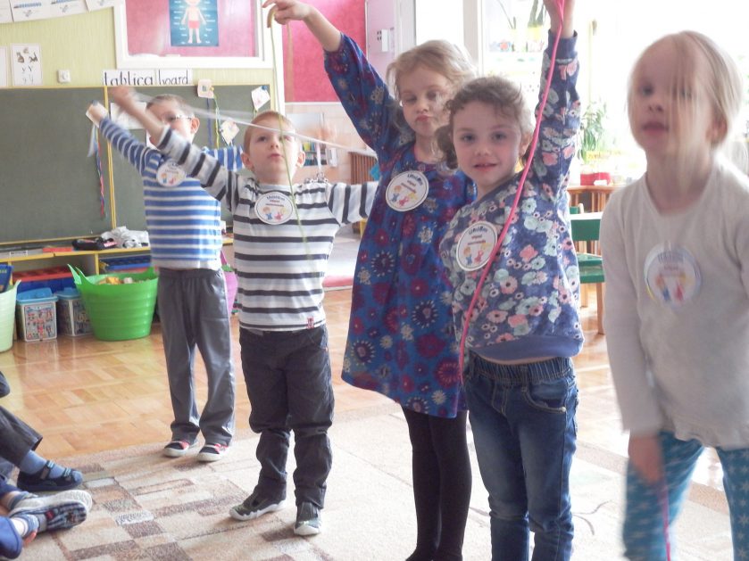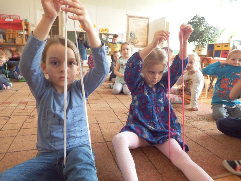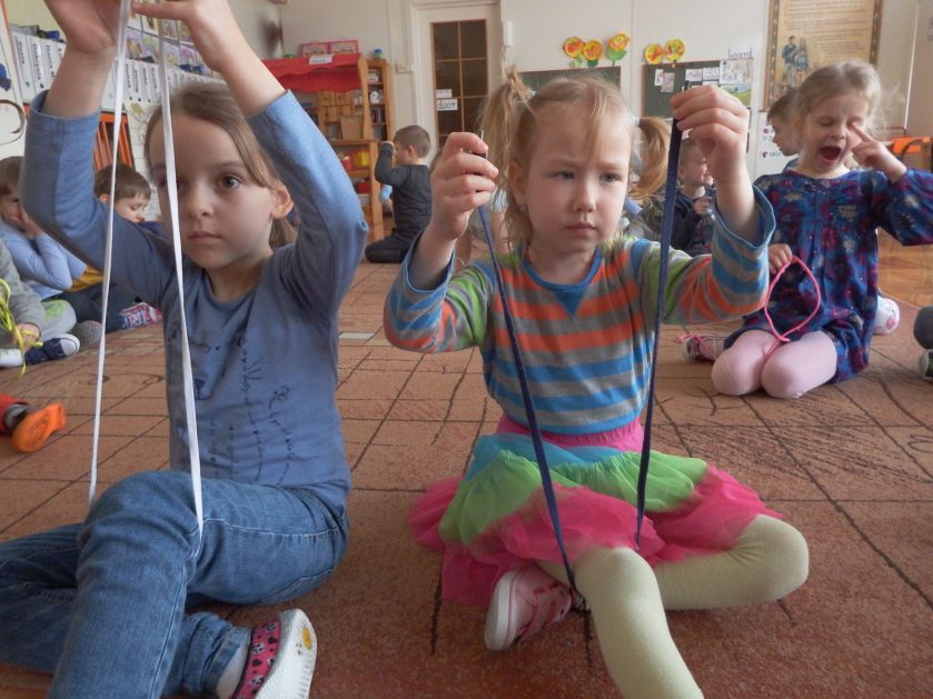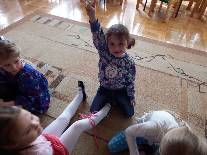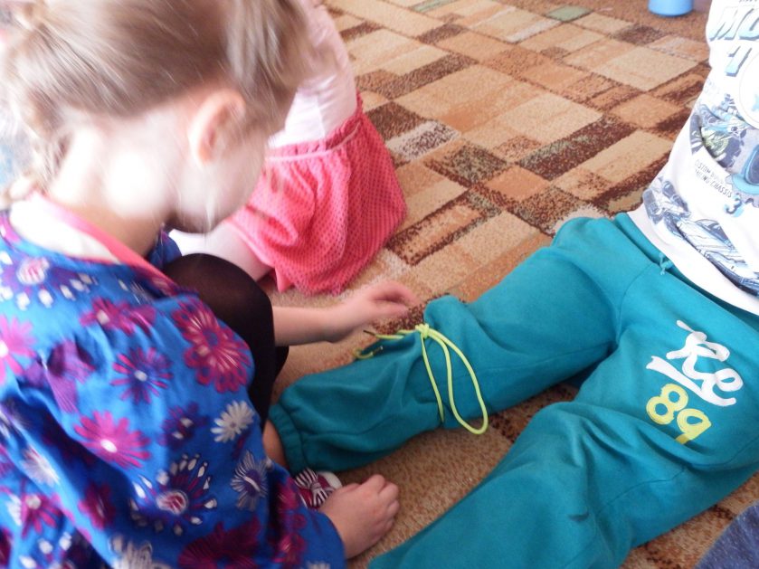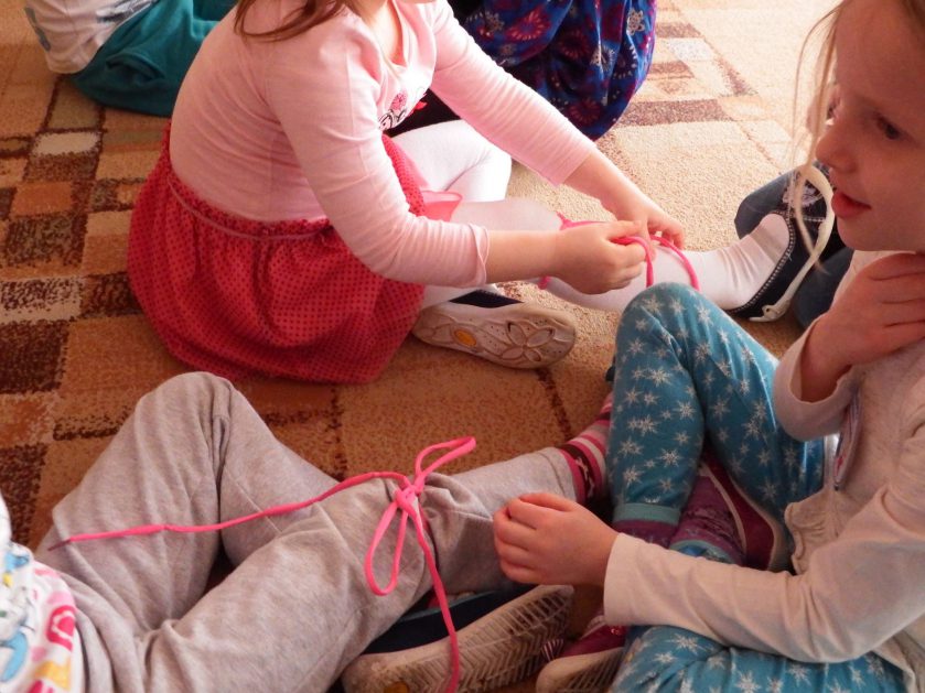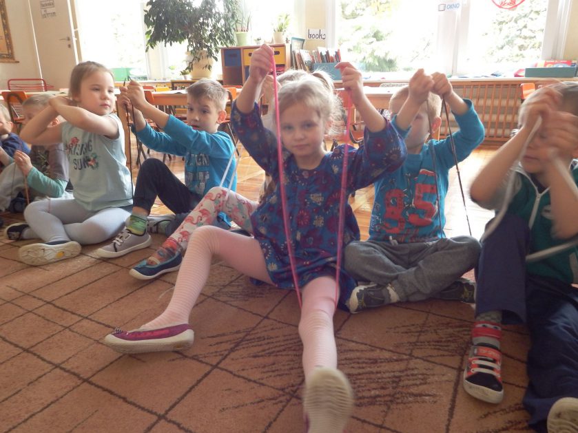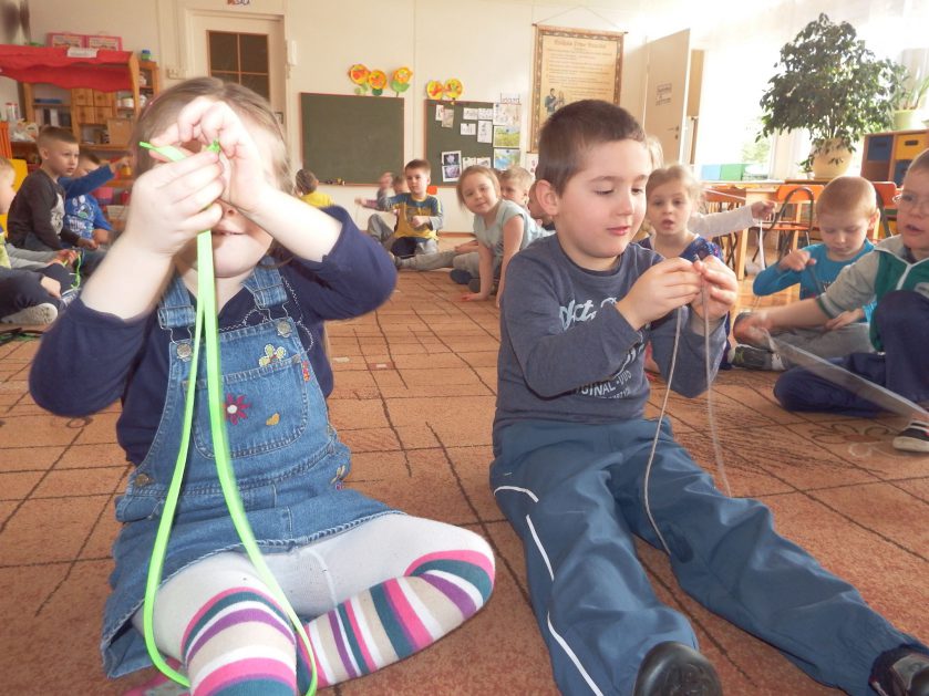 Chociaż każdy z nas jest mały, ale chce być doskonały. Trudna sztuka wiązania nie jest łatwa dla każdego 5 latka, w wolnych chwilach się staramy i ćwiczymy sznurowanie ….Aż dnia pewnego doszło do spotkania wielkiego, dwie grupy się spotkały i ze sobą rywalizowały, kto sprytniejszy, kto zwinniejszy…. Turniej „Sznurówka” zakończył się w miłej atmosferze, teraz dzieci wiedzą ,że trening czyni mistrza!