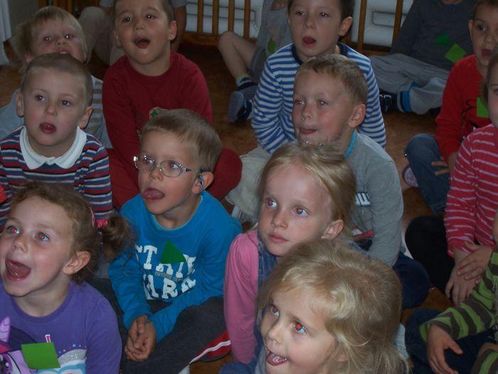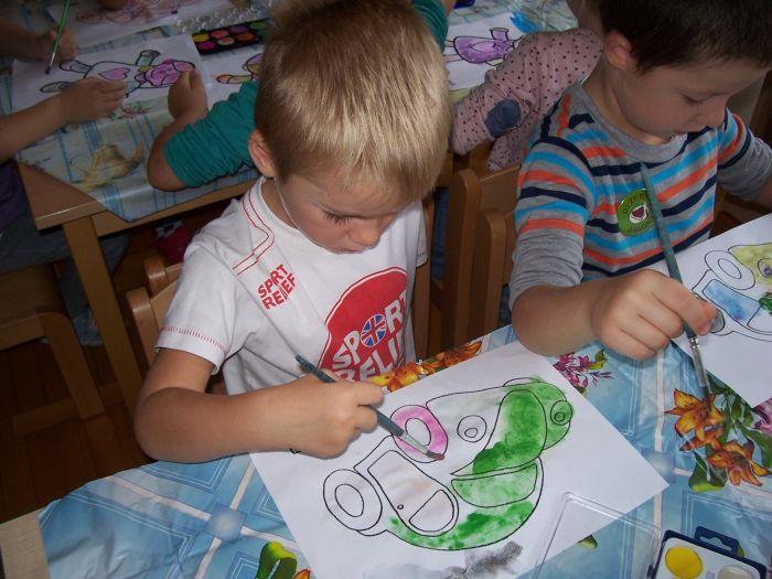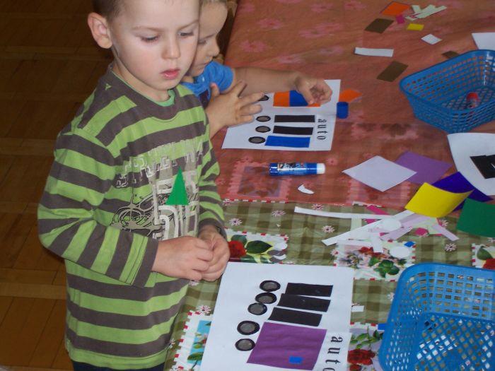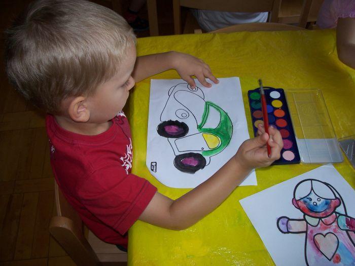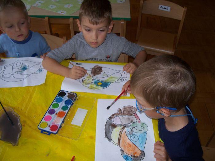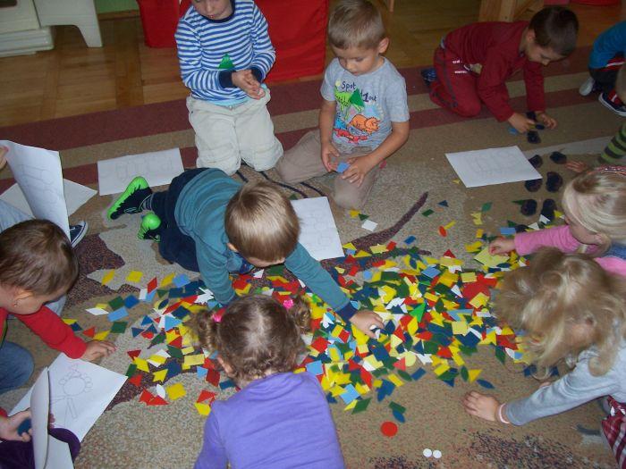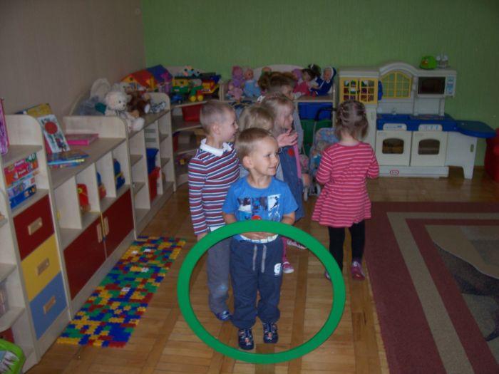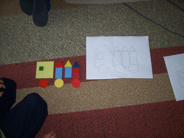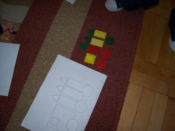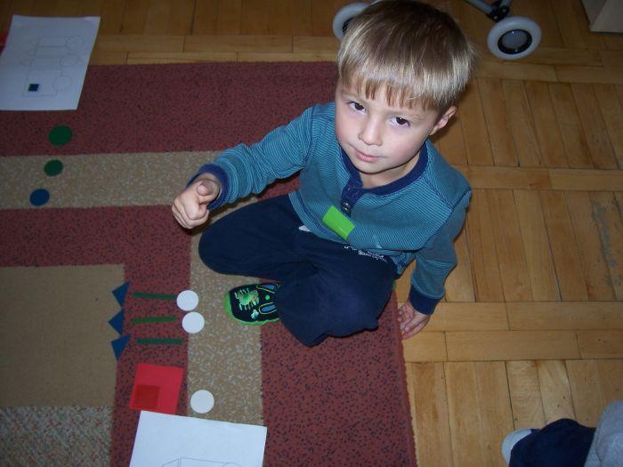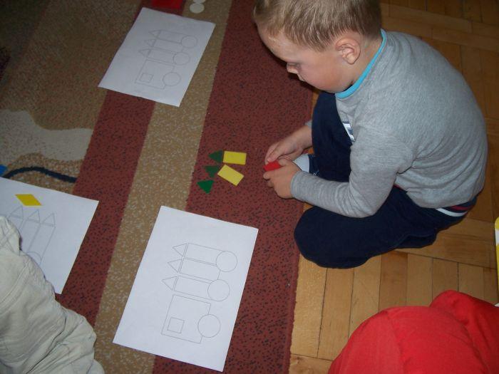 4 latki uczestniczą we wszystkich zabawach organizowanych przesz panią Asię W. Tym razem bawią się figurami geometrycznymi – nazywają, układają ciekawe kompozycje według swojej inwencji lub określonego wzoru.
