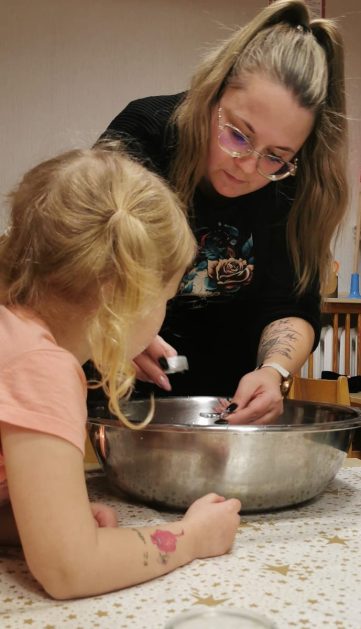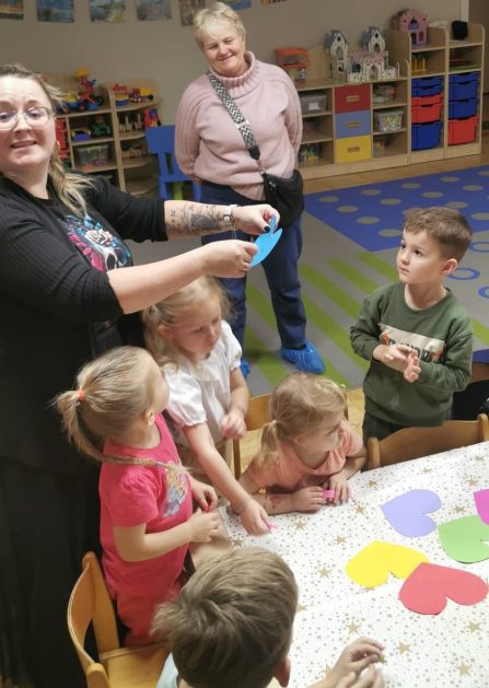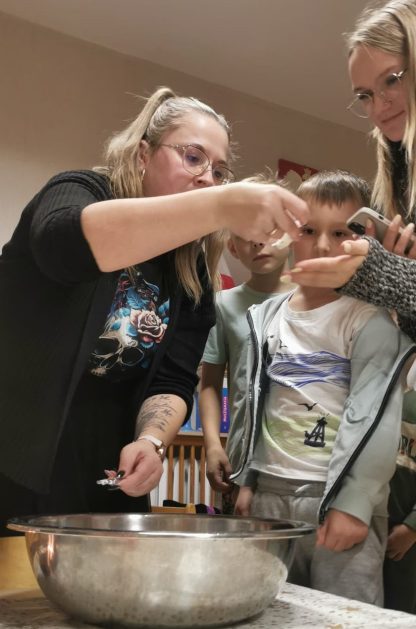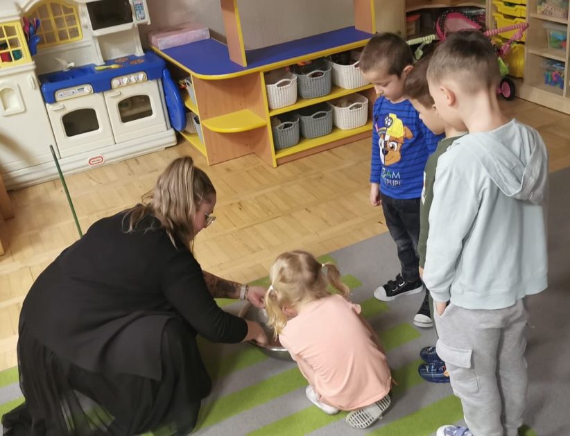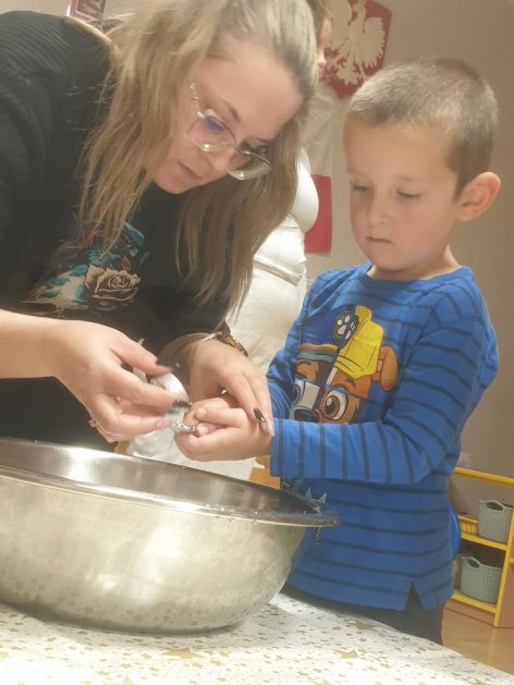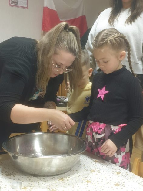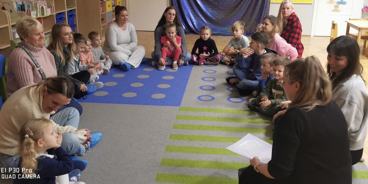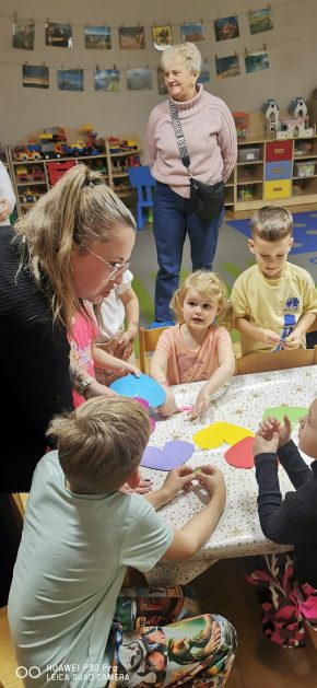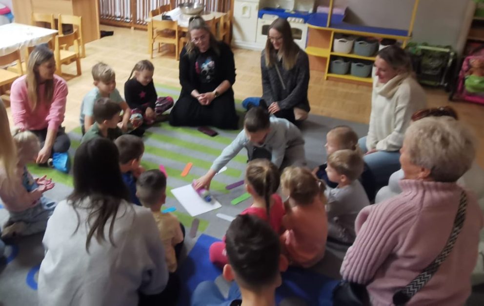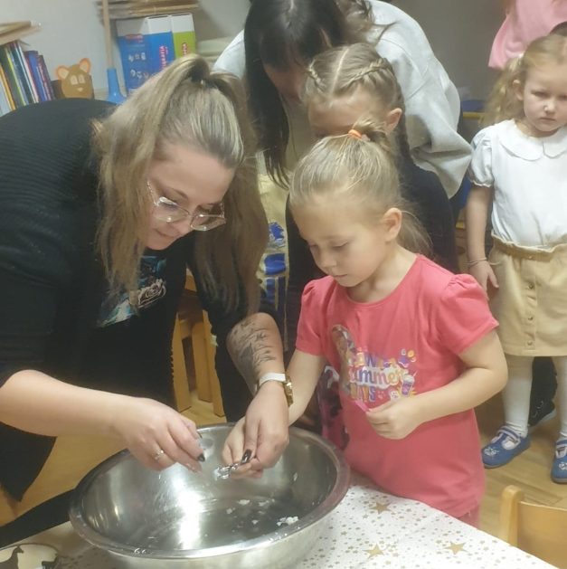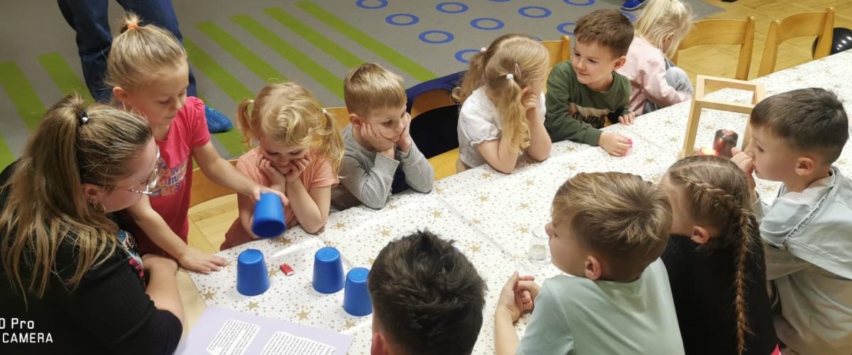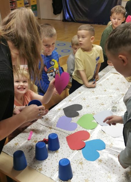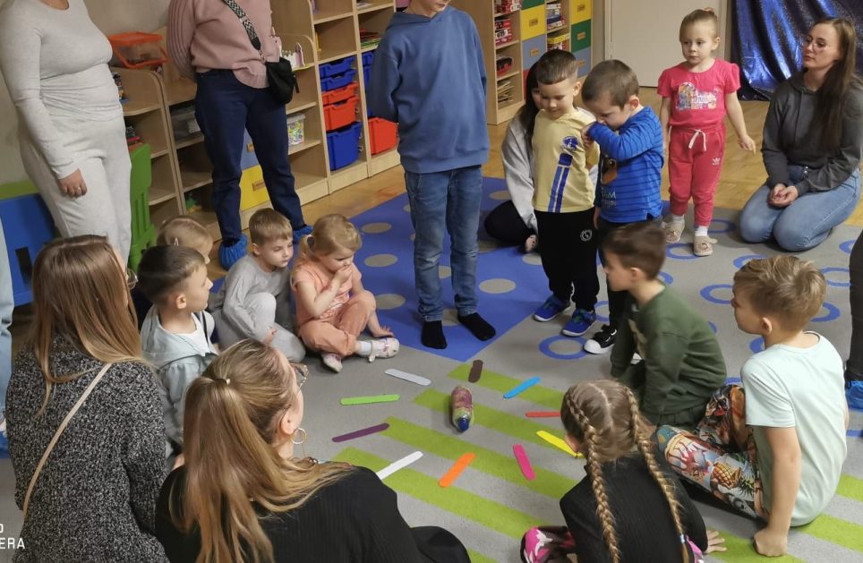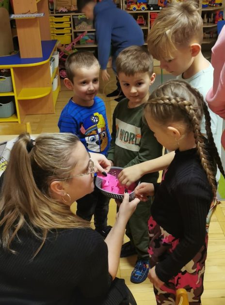Każda uroczystość przedszkolna jest dobrą okazją do nawiązywania bliższych kontaktów z rodzicami, powierzonych naszej opiece dzieci. Również taką okazją stało się spotkanie integracyjne rodziców, dzieci z grupy Pani Honoratki z okazji Andrzejek. Celem tego spotkania było poznanie ludowych zwyczajów i obrzędów związanych ze świętem andrzejkowym, uwrażliwienie na różne tradycje oraz integracja najbliższego otoczenia dziecka (przedszkole i rodzina). Dzieci wraz z „Czarownicą Honoratą – Hogatą” rozwiązywały magiczne zadania i wróżby. Dużo radości przyniosła dzieciom wróżba najbardziej kojarzona z Andrzejkami – lanie wosku. Powstałe kształty były okazją do rozwijania wyobraźni. Wspólnie z nauczycielką dzieci odgadywały co je czeka i czego mogą się spodziewać w przyszłości. Wszystkie wróżby przeplatane były pląsami i tańcami przy muzyce.