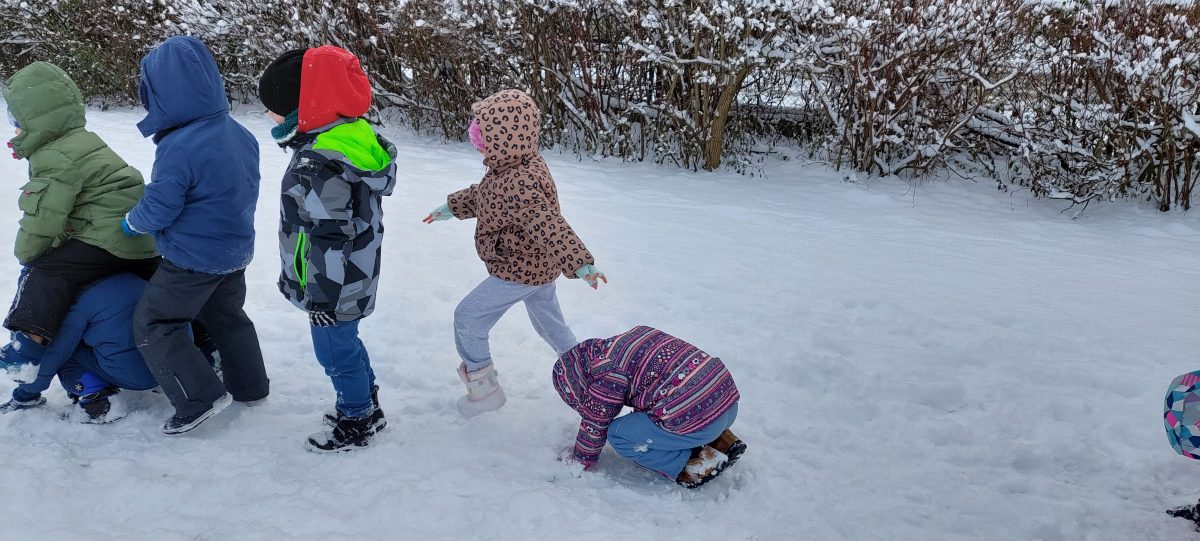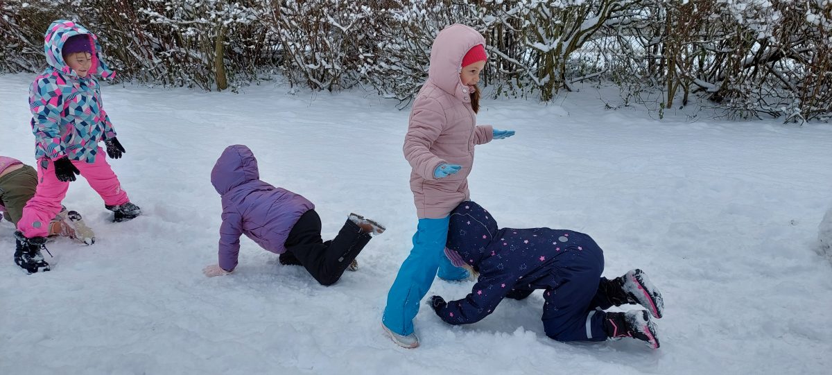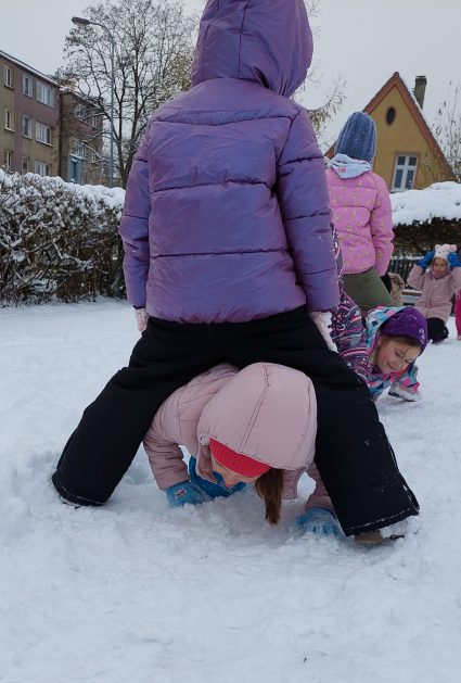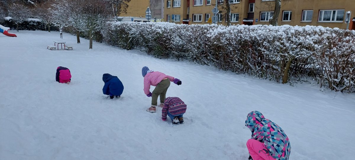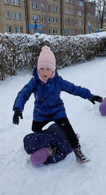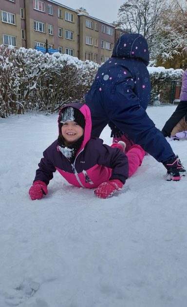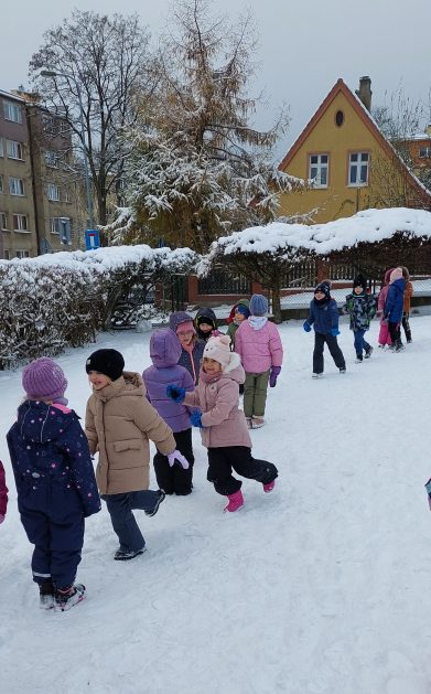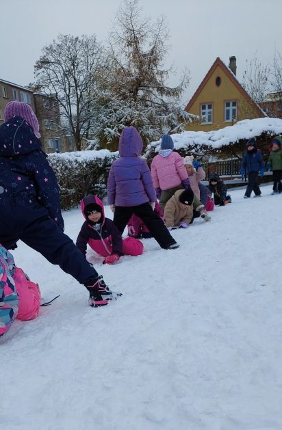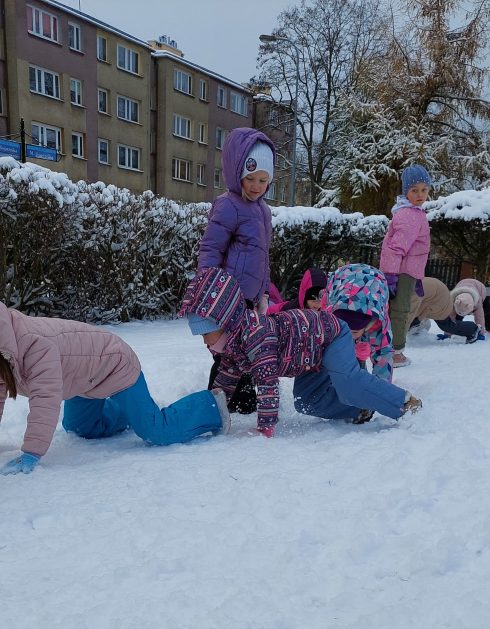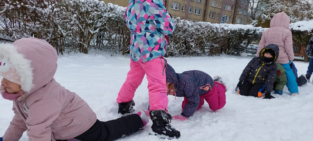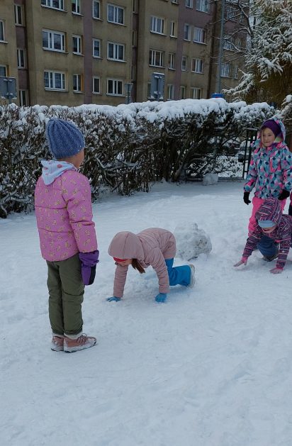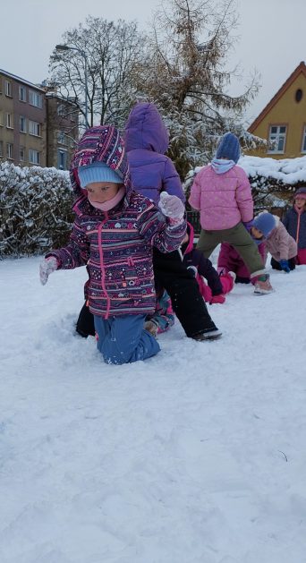 Śniegu dużo napadało! Wszędzie biało! „Czapka, szalik, rękawiczki, kombinezon zakładamy i ćwiczenia na śniegu zaczynamy” – tak głośno wołały 6 latki idąc na plac przedszkolny! Ruch i kondycja fizyczna jest ważna bez względu na porę roku, dzisiaj dzieci miały znakomitą zabawę, ale także i porządną dawkę ruchu. Kombinezony doskonale zabezpieczyły dzieci przed zimnem i nie przemokły podczas szaleństwa na białym puchu.