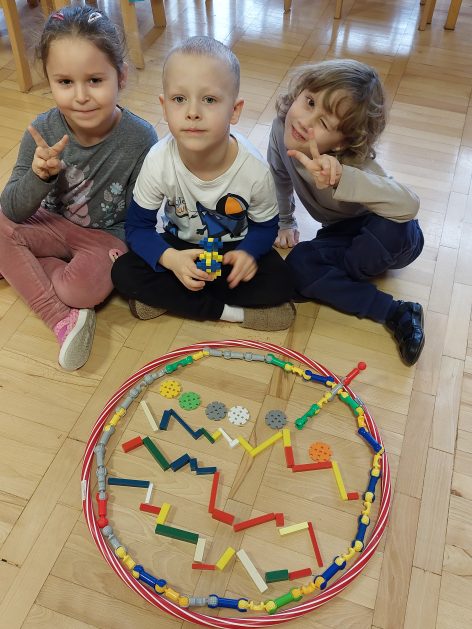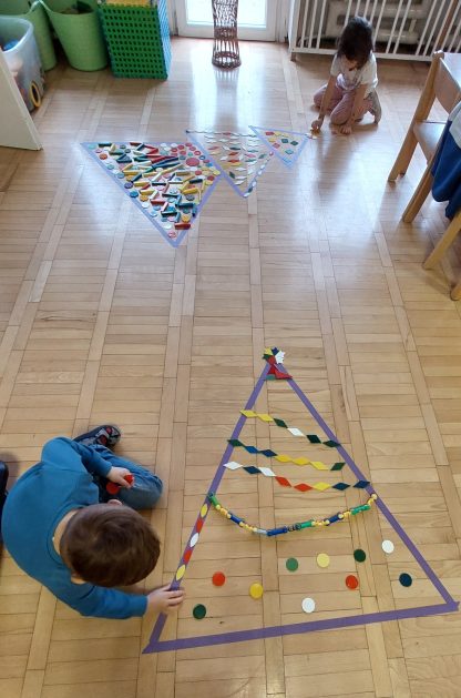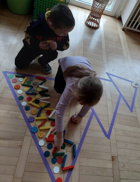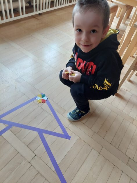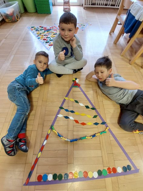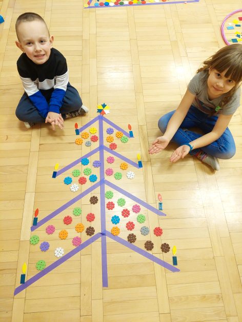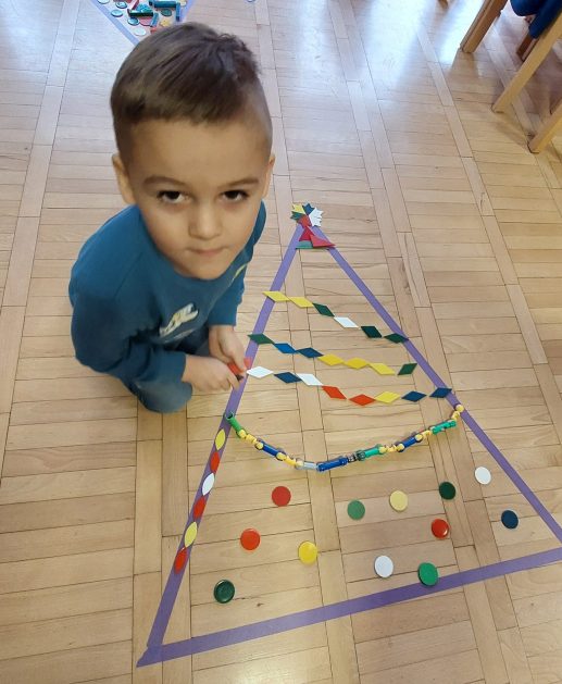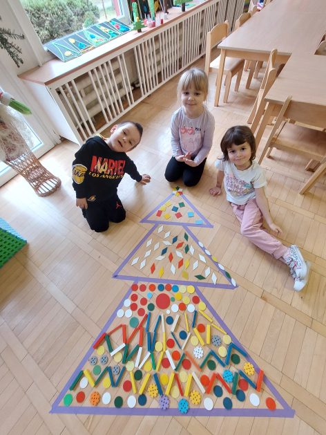 Boże Narodzenie to pełne uroku święta, które dla dzieci kojarzą się … między innymi z ubieraniem choinki. Choinka – co to za drzewo? 5 latki „A” przed świętami poszukiwały właśnie choinek w ogrodzie przedszkolnym, rozpoznawały i uczyły się rozróżniać drzewa iglaste, jest ich bardzo dużo, próbowały policzyć każde drzewko! Czy się udało? Wynik był sporny, więc wróciliśmy do sali, aby udekorować choinki. Nasza kreatywna aktywność pobudzała bodźce dotykowe, percepcję wzrokową, koordynację wzrokowo – ruchową, małą motorykę oraz rozwijała komunikację i współdziałanie w małych grupach. Całkowita dowolność w wyborze materiałów i tak oto powstawały kolorowe drzewka choinkowe.