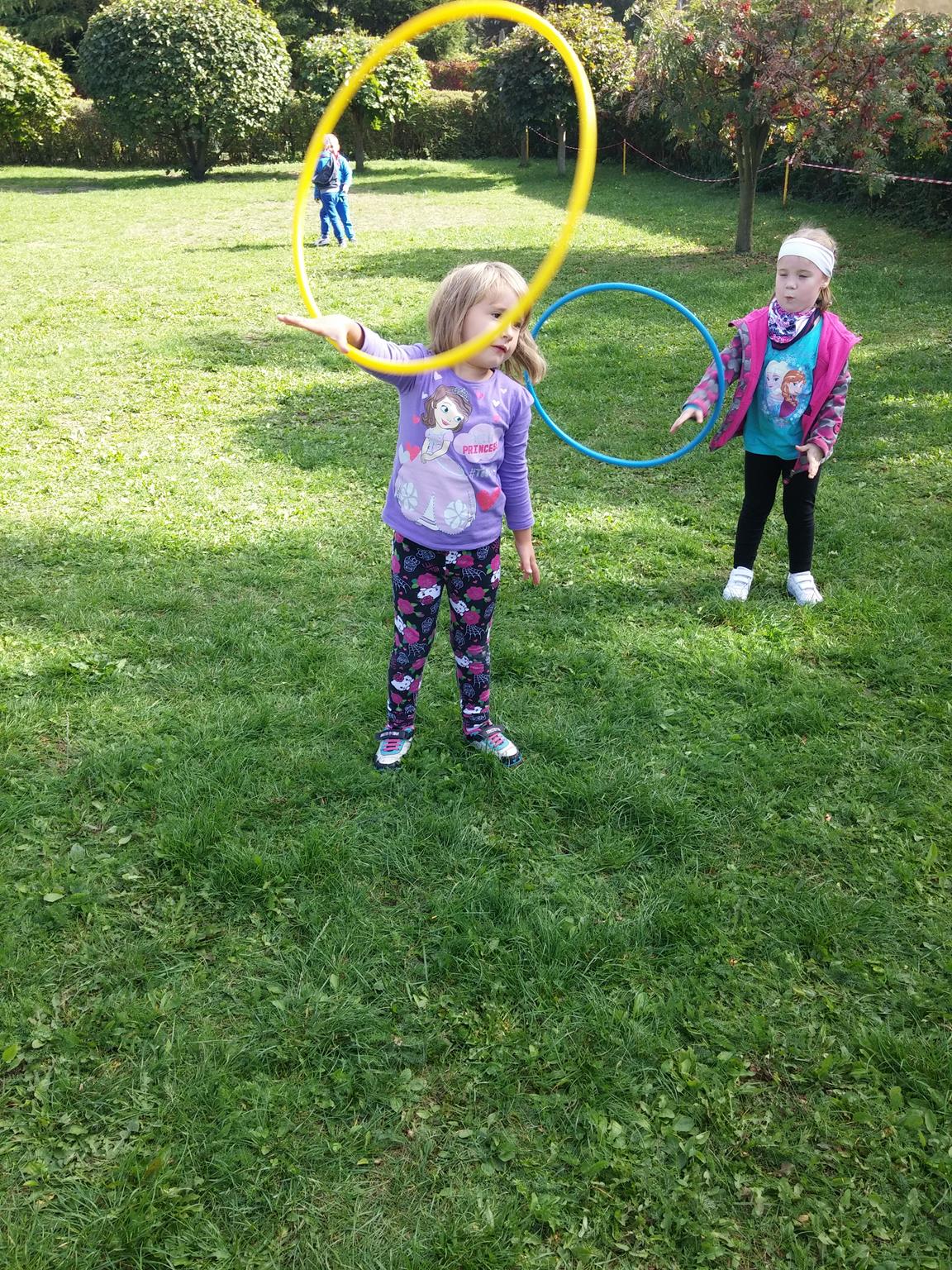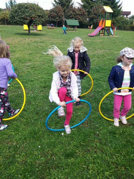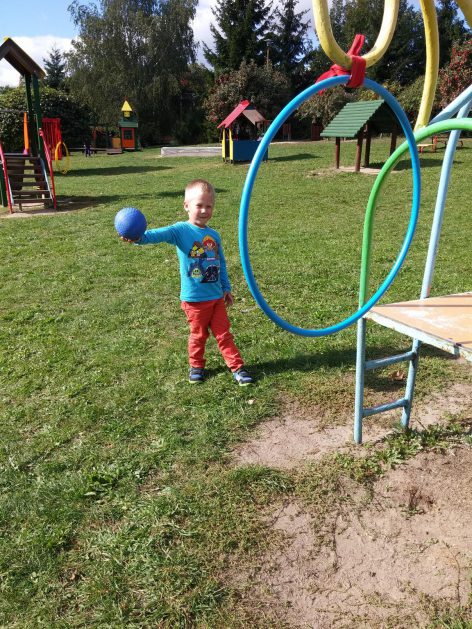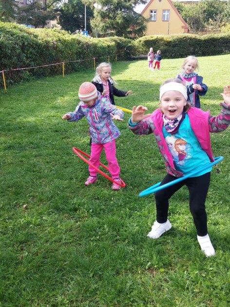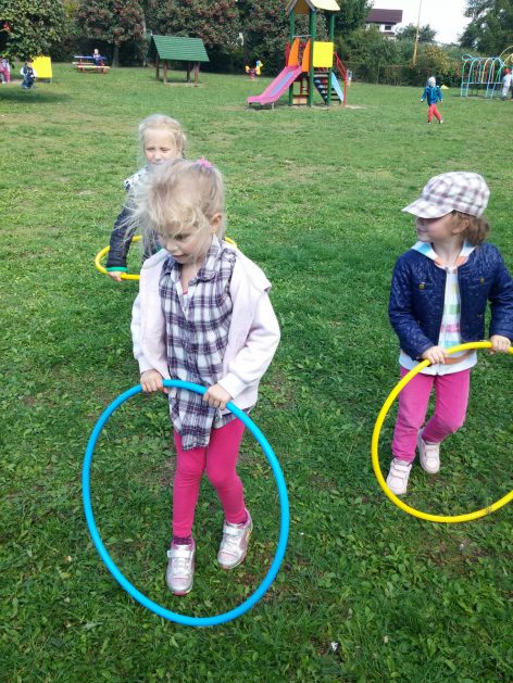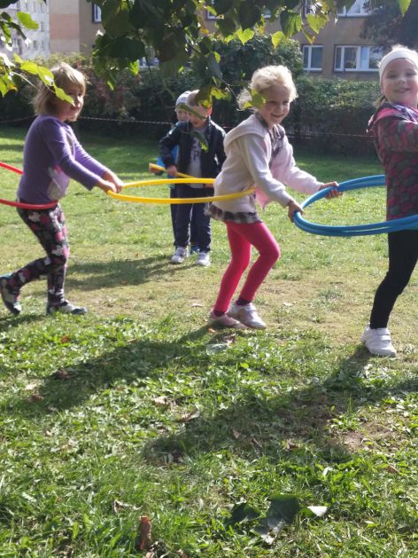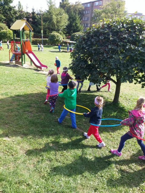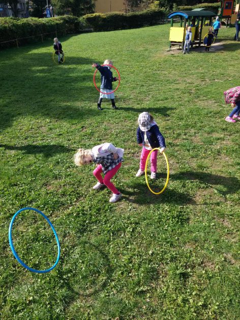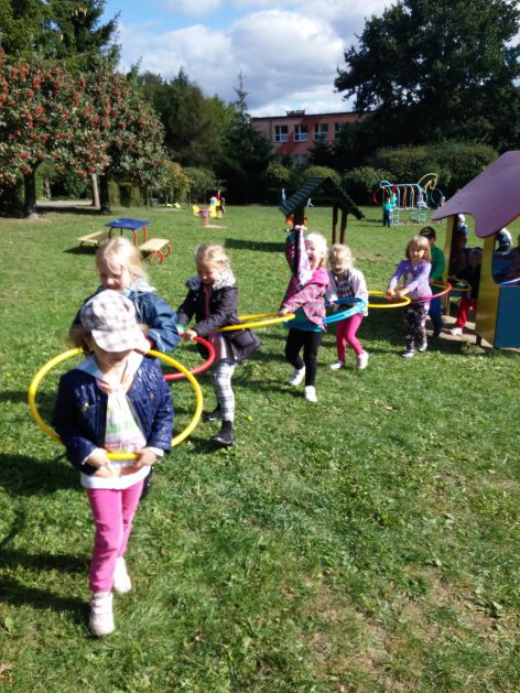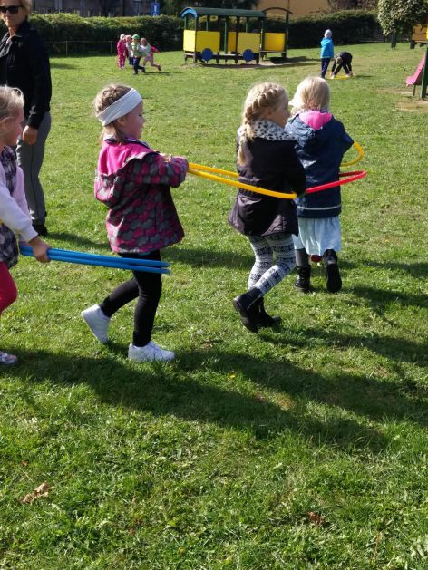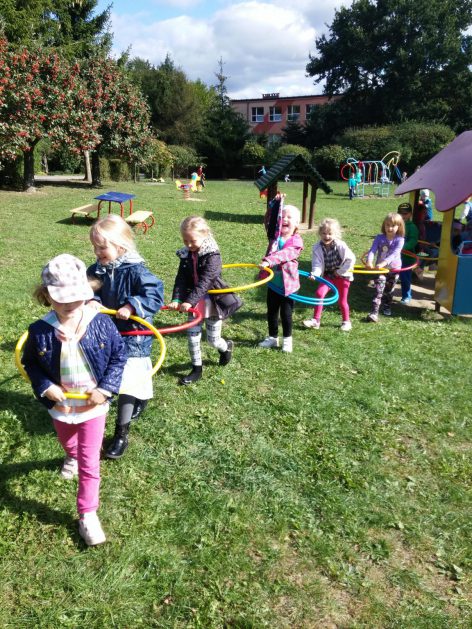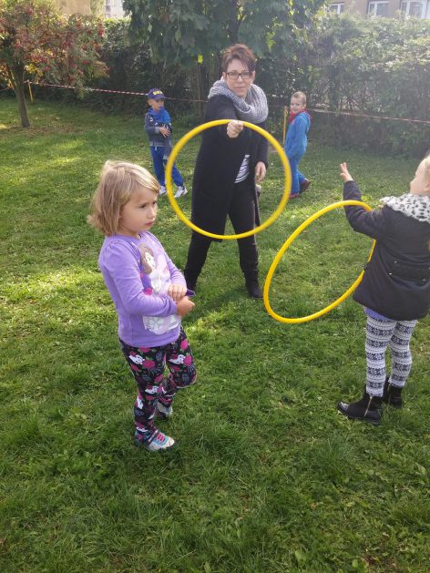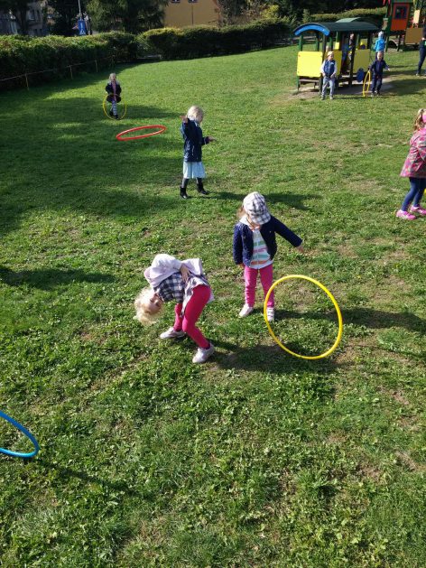 „Ruch to zdrowie, każdy przedszkolak to powie!” – dlatego korzystając z uroków jesiennej aury, dzieci codziennie przebywają na powietrzu. Naturalną potrzebę ruchu ukierunkowujemy na spontaniczne zabawy ruchowe z wykorzystaniem sprzętów nie tylko terenowych. Dzieci wykorzystują przybory gimnastyczne i pobudzają inwencję twórczą , co wpływa korzystnie na dobry nastrój jak i na rozwój motoryki.