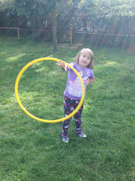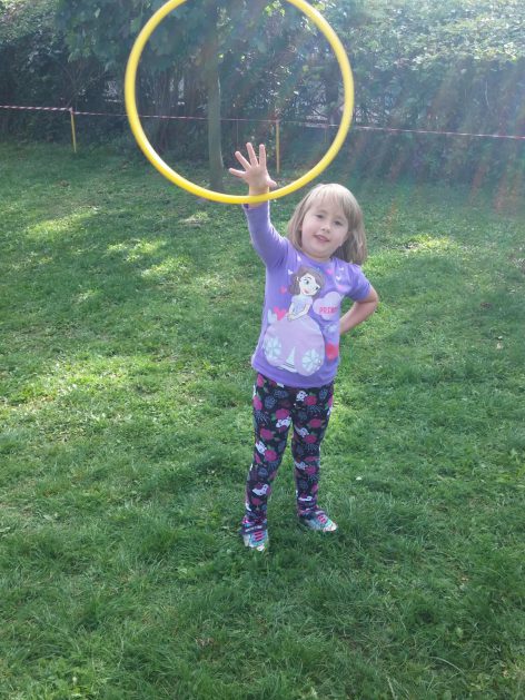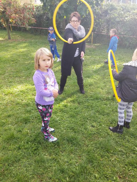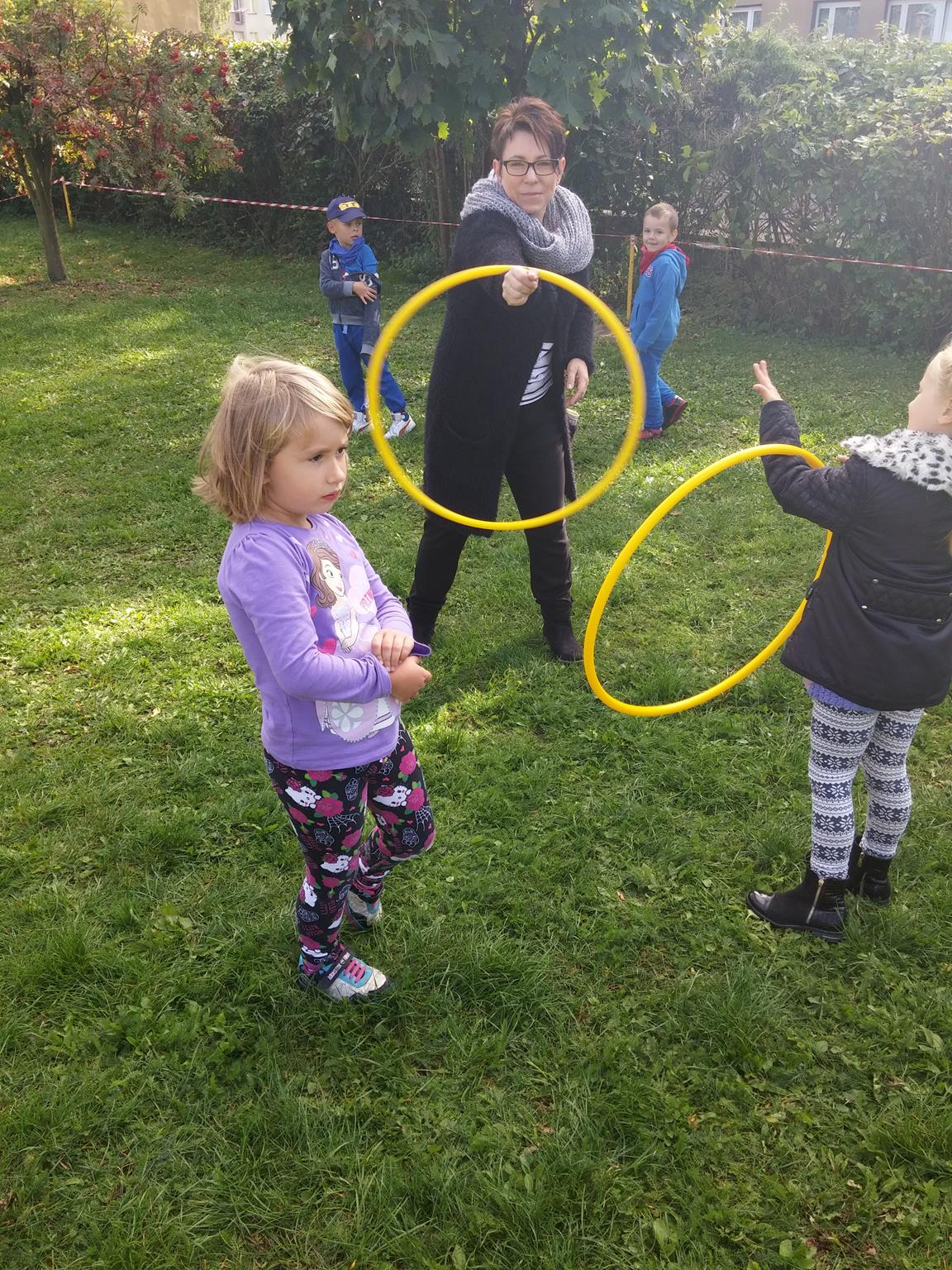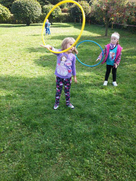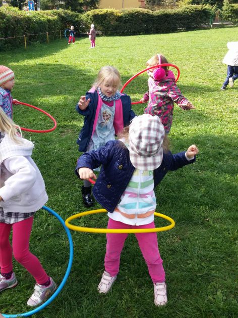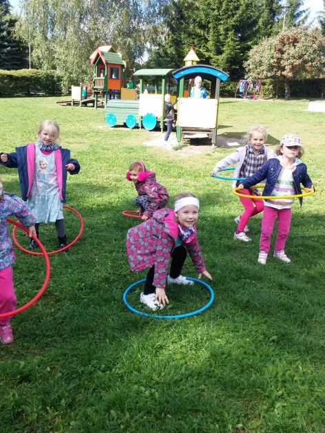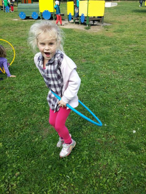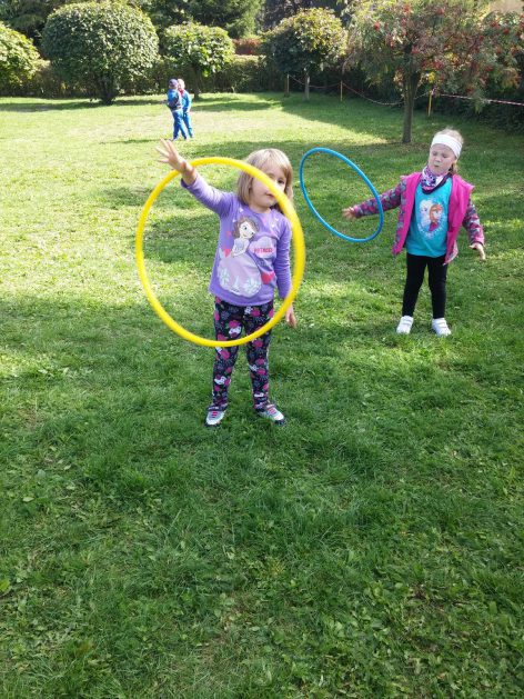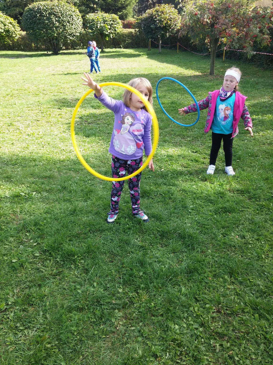 „Ruch to zdrowie, każdy przedszkolak to powie!” – dlatego korzystając z uroków jesiennej aury, dzieci codziennie przebywają na powietrzu. Naturalną potrzebę ruchu ukierunkowujemy na spontaniczne zabawy ruchowe z wykorzystaniem sprzętów nie tylko terenowych. Dzieci wykorzystują przybory gimnastyczne i pobudzają inwencję twórczą , co wpływa korzystnie na dobry nastrój jak i na rozwój motoryki.