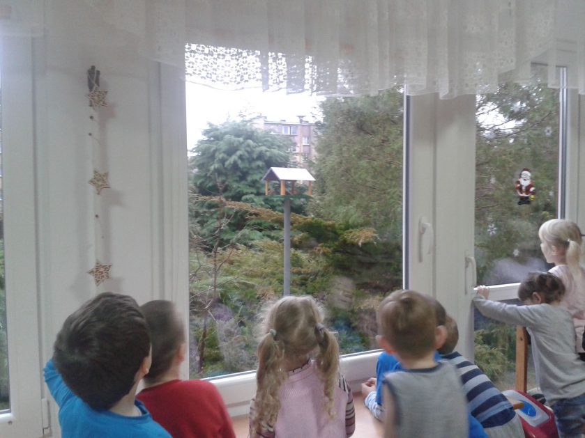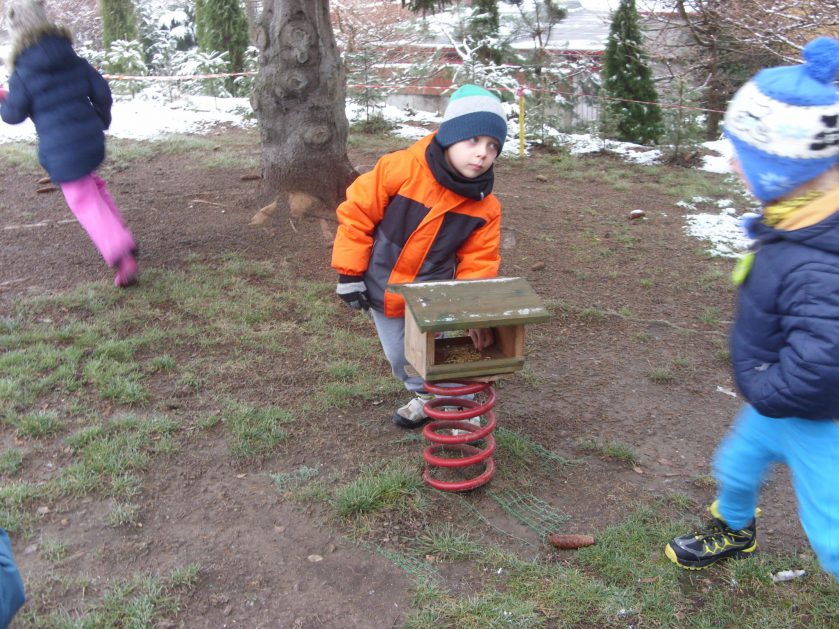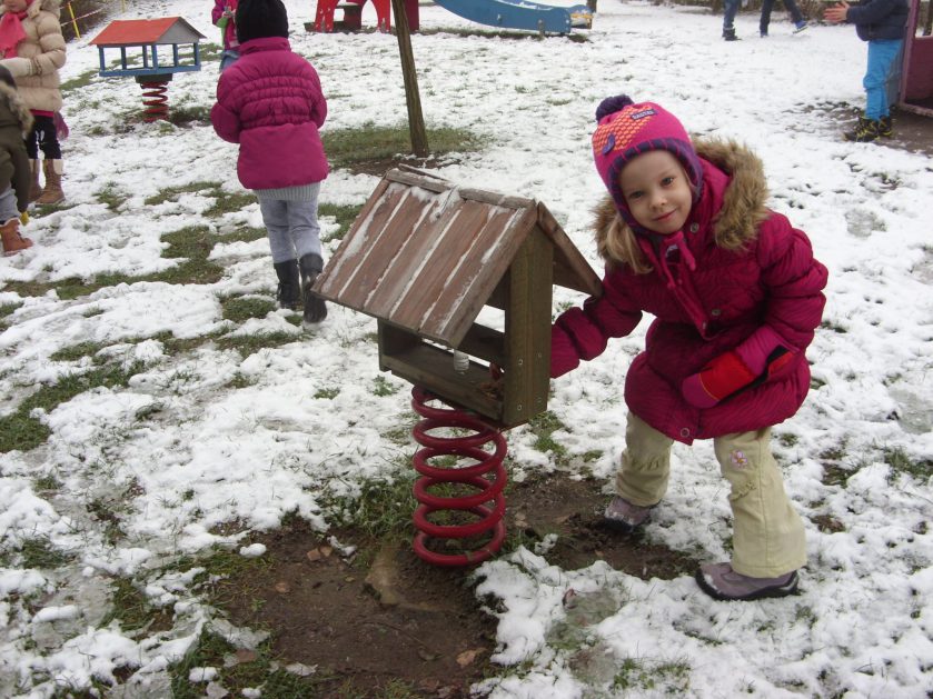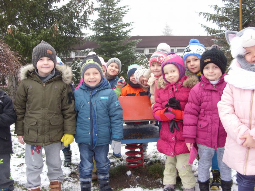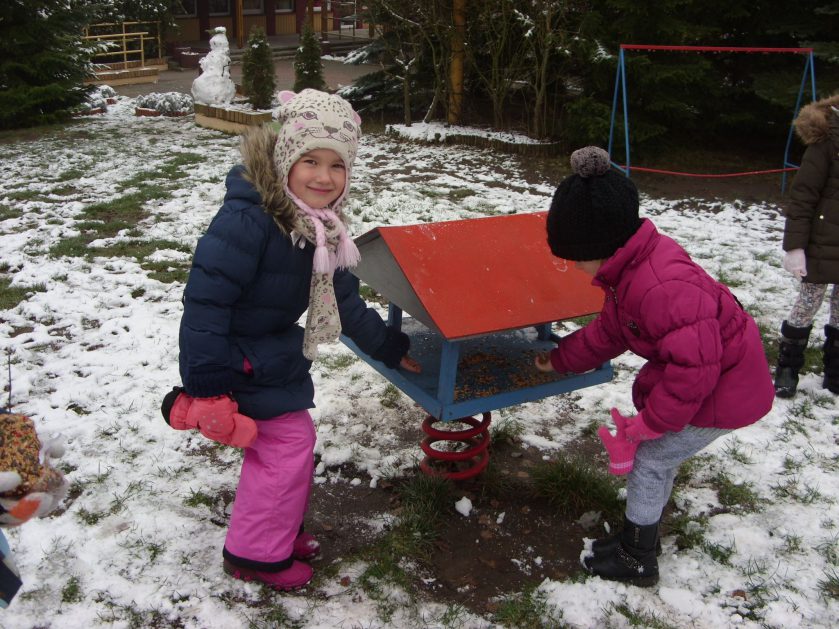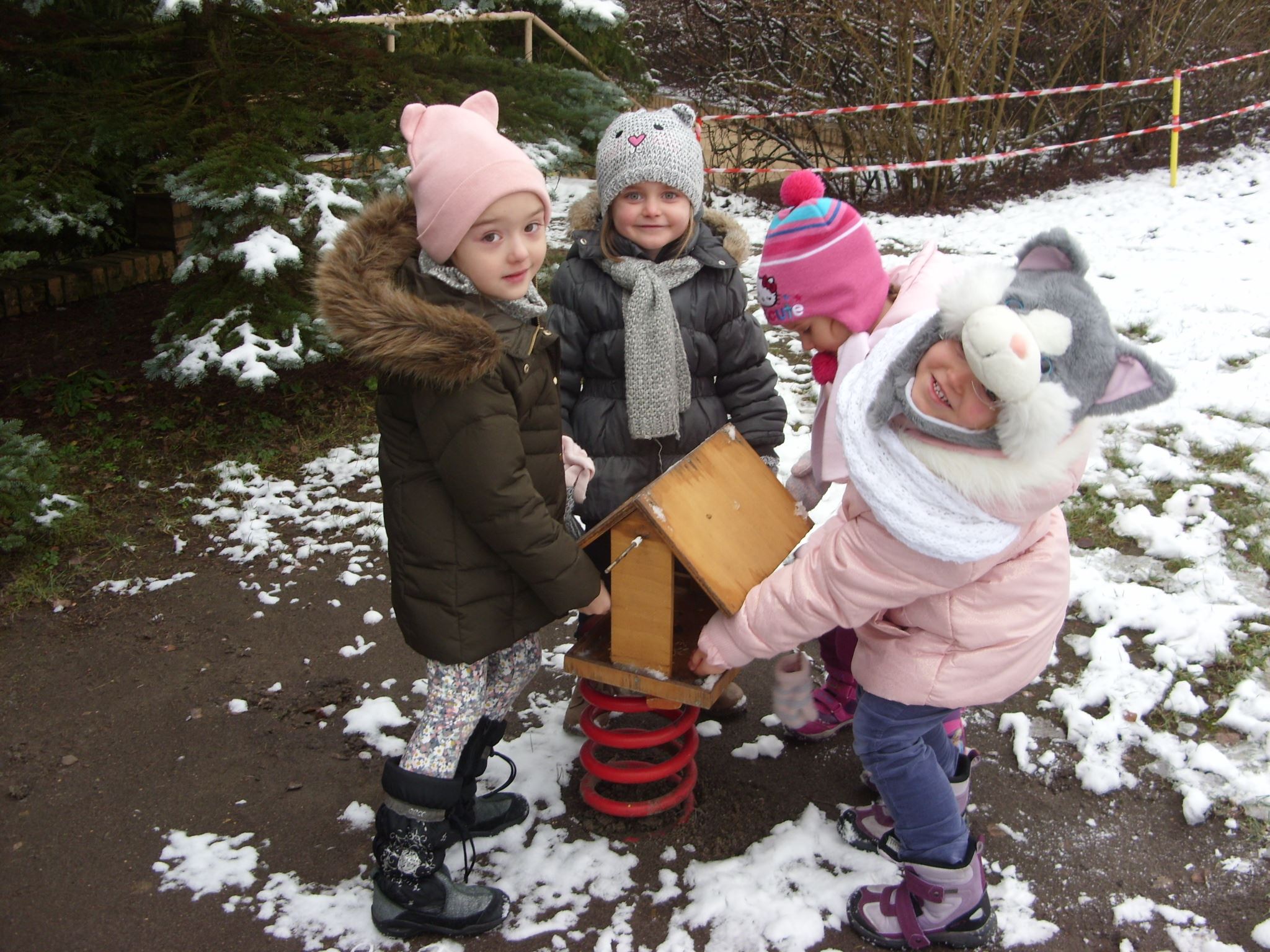 W końcu zawitała do Nas zimowa pogoda. 4-latki udały się do ogrodu przedszkolnego, aby nakarmić mieszkające w nim ptaki. Nawet najmłodsi wiedzą, że bez pomocy trudno będzie naszym skrzydlatym przyjaciołom przetrwać mroźne dni.