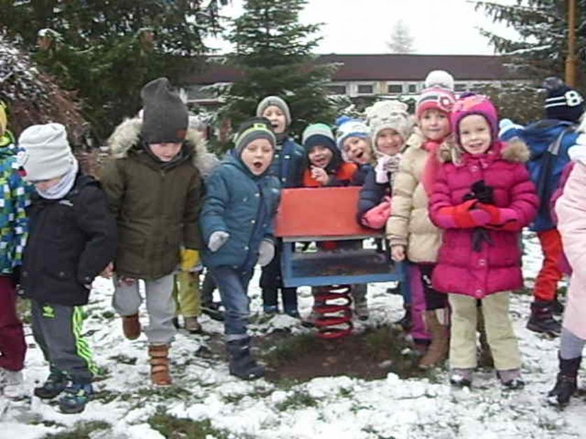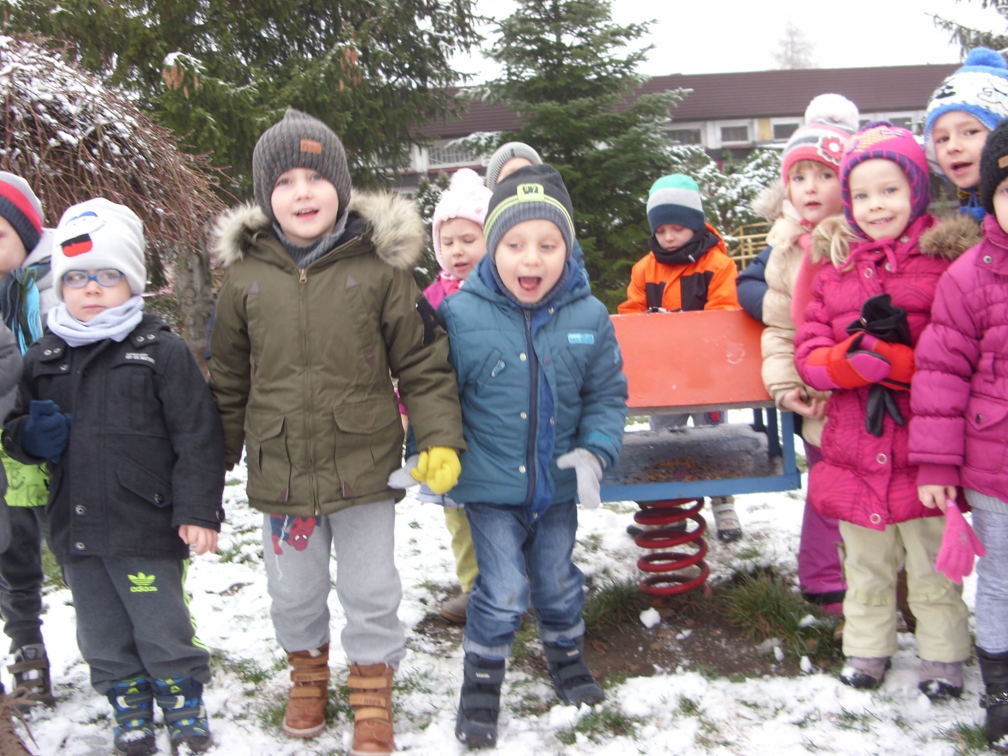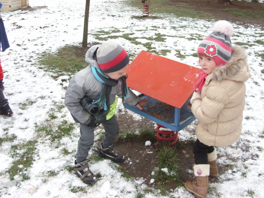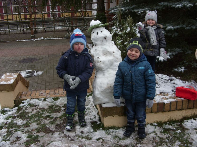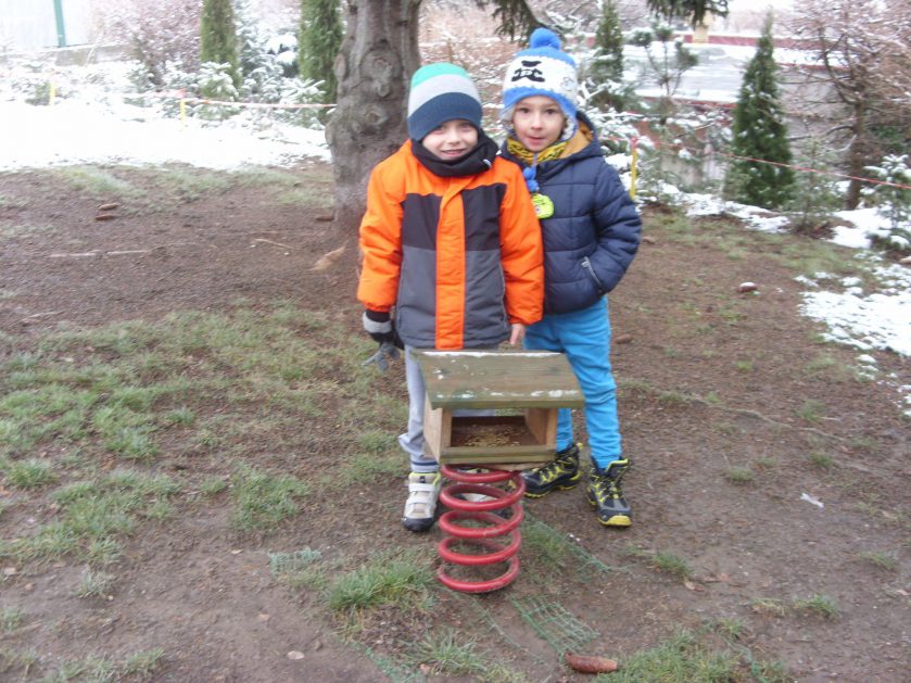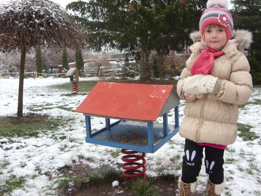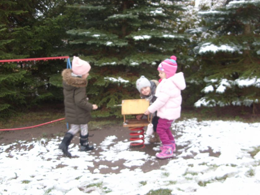 W końcu zawitała do Nas zimowa pogoda. 4-latki udały się do ogrodu przedszkolnego, aby nakarmić mieszkające w nim ptaki. Nawet najmłodsi wiedzą, że bez pomocy trudno będzie naszym skrzydlatym przyjaciołom przetrwać mroźne dni.