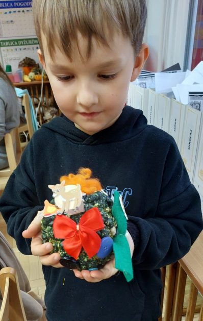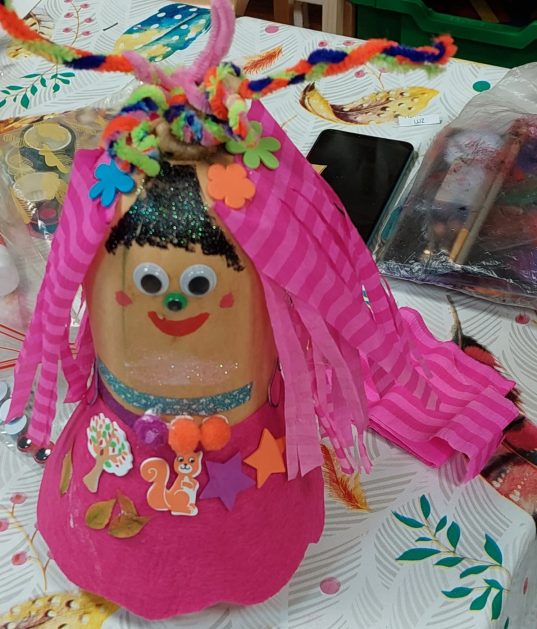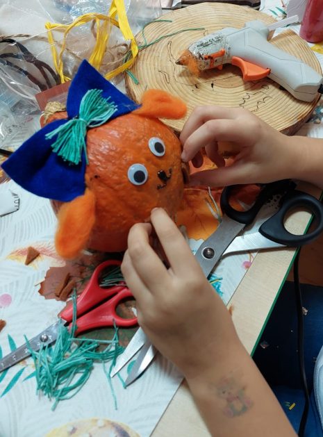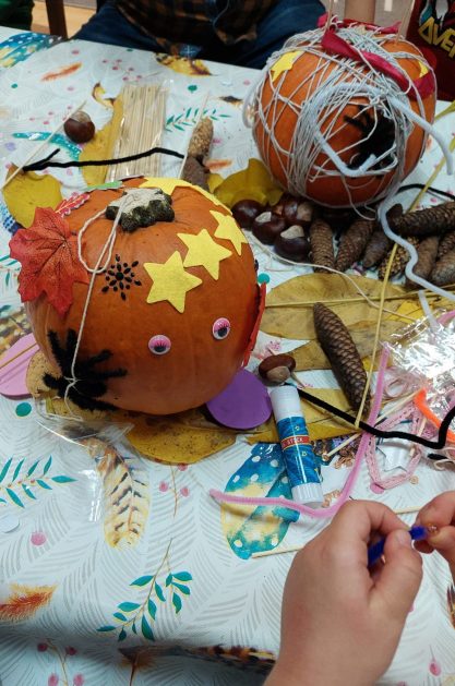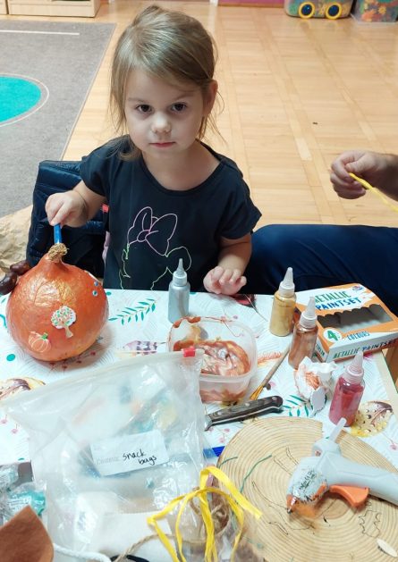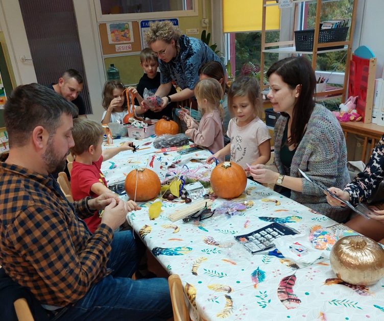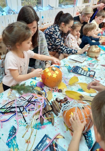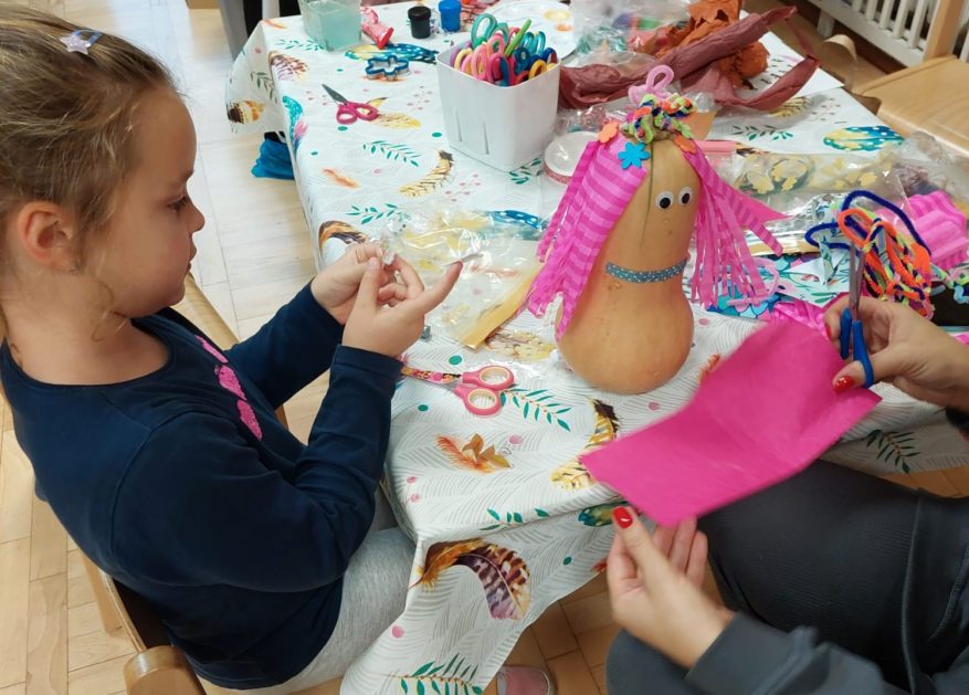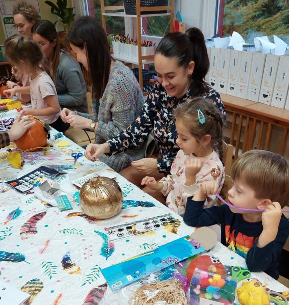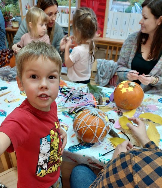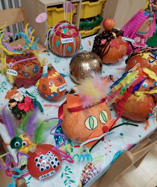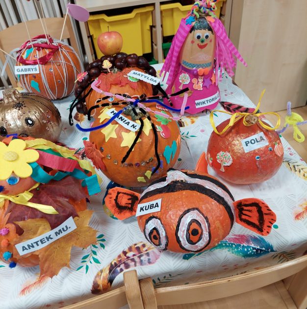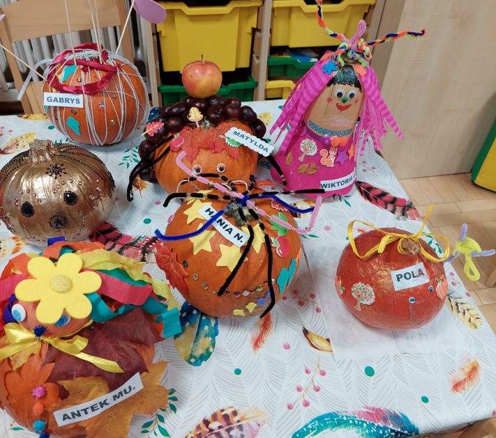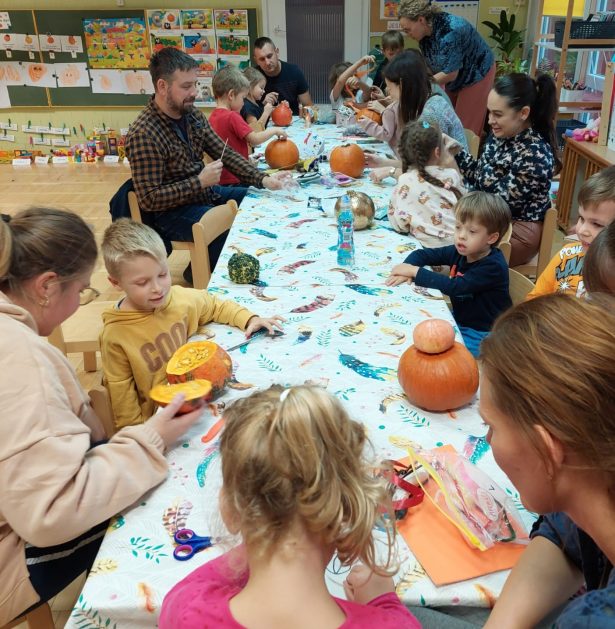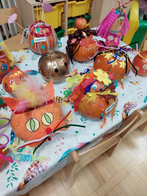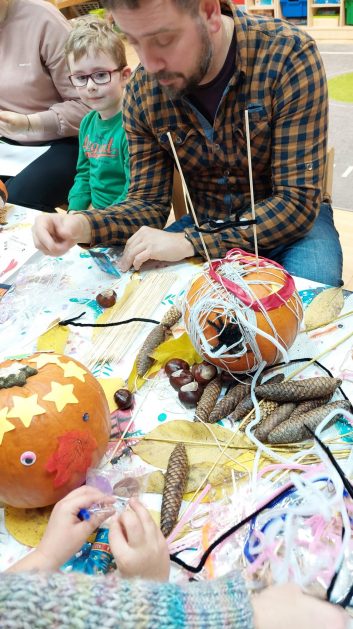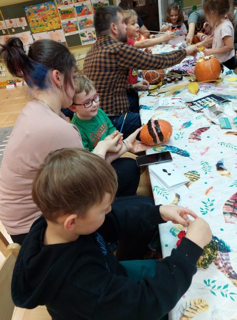 U 5 latków na warsztatach gościła Pani Dynia. Dzieci wraz z rodzicami tworzyły dyniowe cudaki. Wyobraźnia i kreatywność podczas pracy była nieograniczona. Po woli wyłaniały się różne dziwne stworki. Wspólnej pracy towarzyszyła radość i ogromne zaangażowanie dzieci, że pracują razem z rodzicami. Na spotkaniu panowała ciepła i przyjazna atmosfera podczas, której można było wymienić się pomysłami oraz materiałami. Ekspozycję dyniowych cudaków można oglądać w naszej szatni.