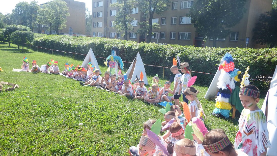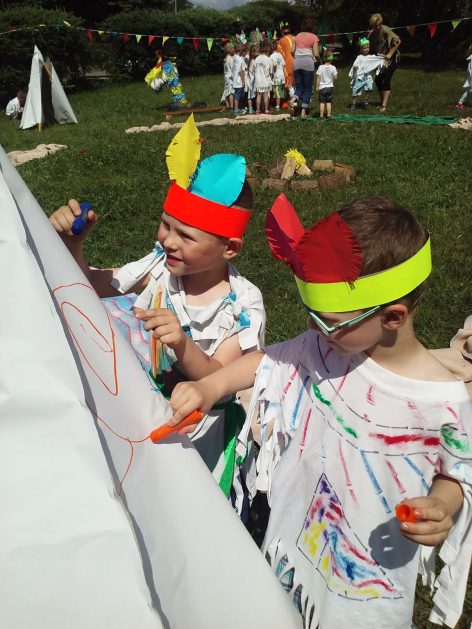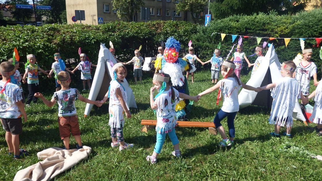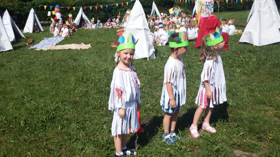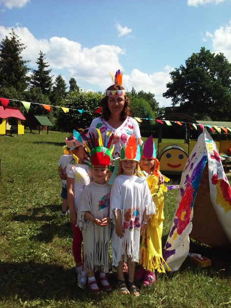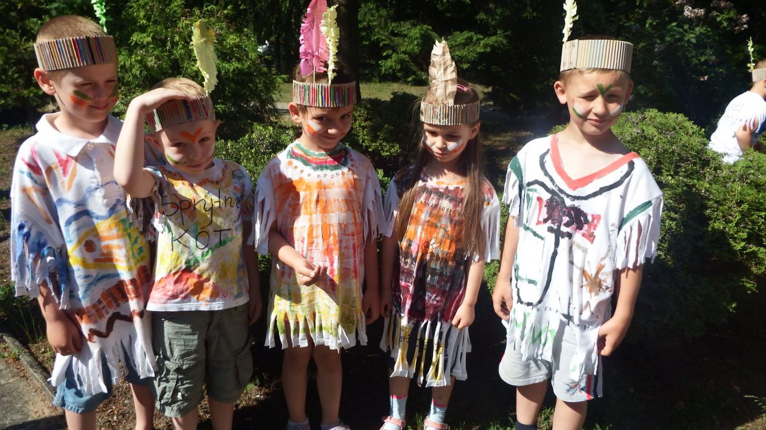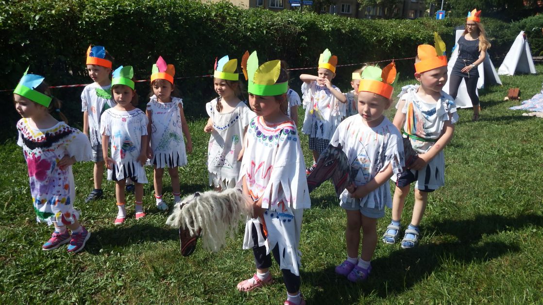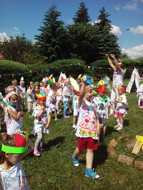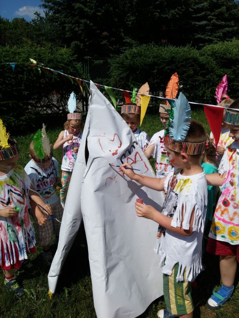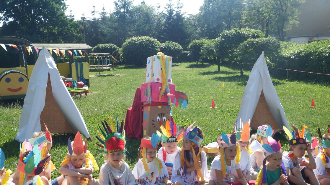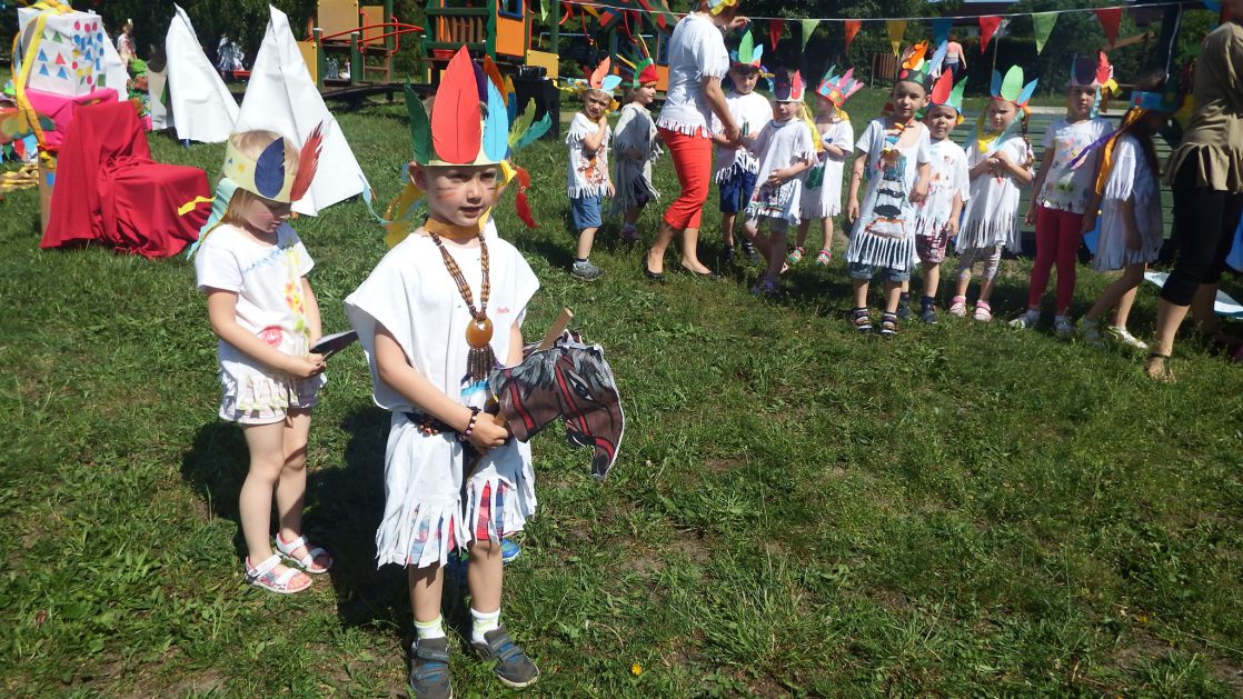 Święto wszystkich dzieci jest najbardziej wyczekiwanym przez przedszkolaków dniem w roku. W tym roku zaskoczyliśmy dzieci, bo ich święto trwało cały tydzień. Tematem przewodnim naszych działań była „Wioska Indiańska”. Każdego dnia były jakieś atrakcje, rozpoczęło się od szaleństwa na dmuchańcach, później były prezenty dla każdej grupy. Wiele radości sprawiło dzieciom szykowanie strojów Indiańskich, opasek i totemów grupowych. Dzieci bardzo angażowały się podczas malowania swoich koszulek, wymyślały indiańskie imiona. W piątek wesołą paradą i głośnymi okrzykami indiańskimi, dzieci z pomalowanymi buziami w barwach radości, udały się do ogrodu przedszkolnego, gdzie czekała na nich Wioska Indiańska. Przedszkolaki brały udział w tańcach, konkursach, malowaniu tipi dla swojej grupy.