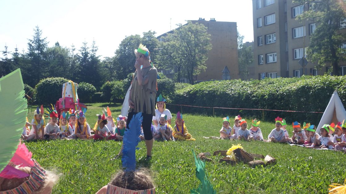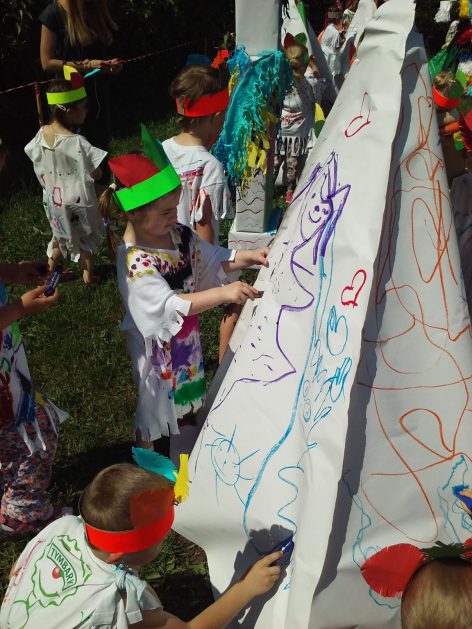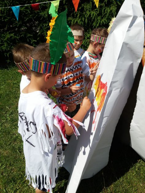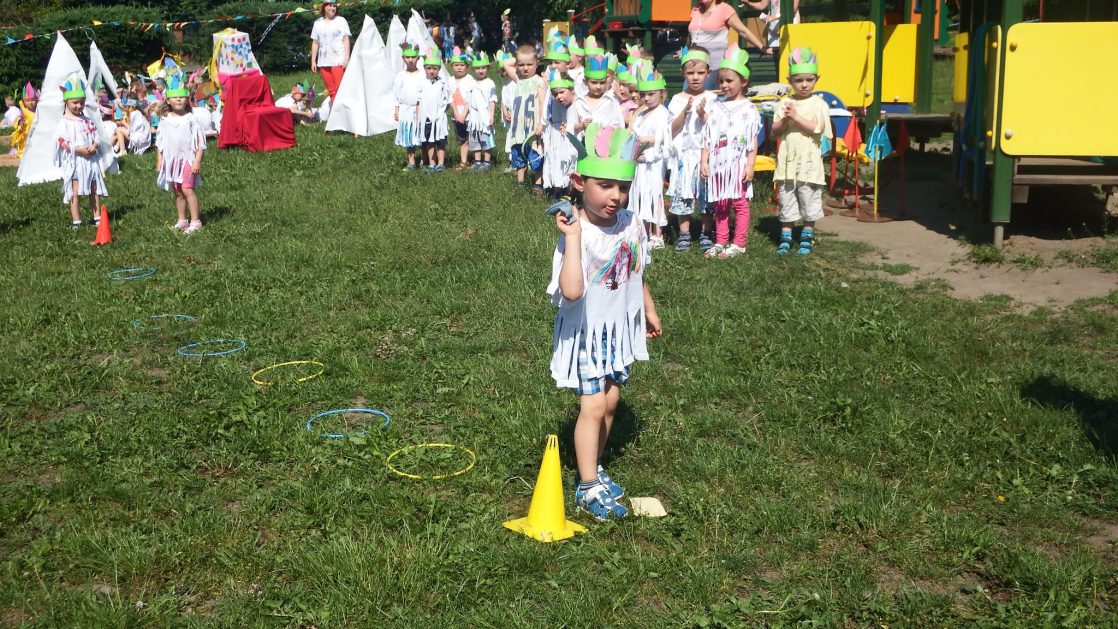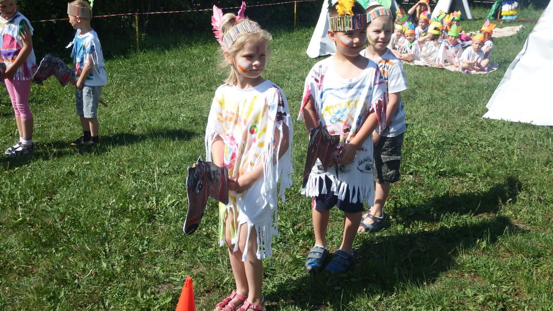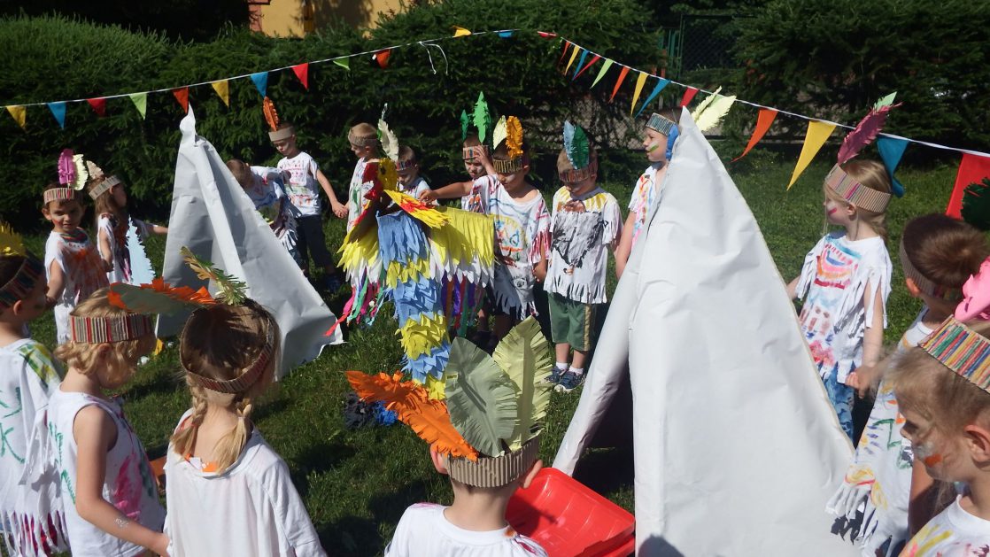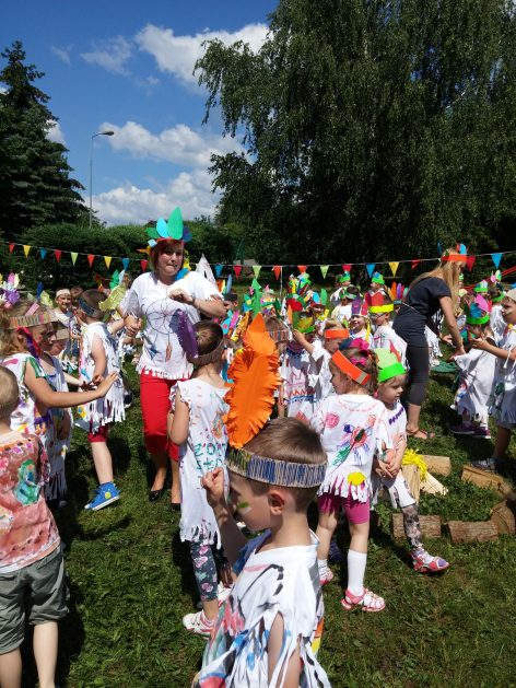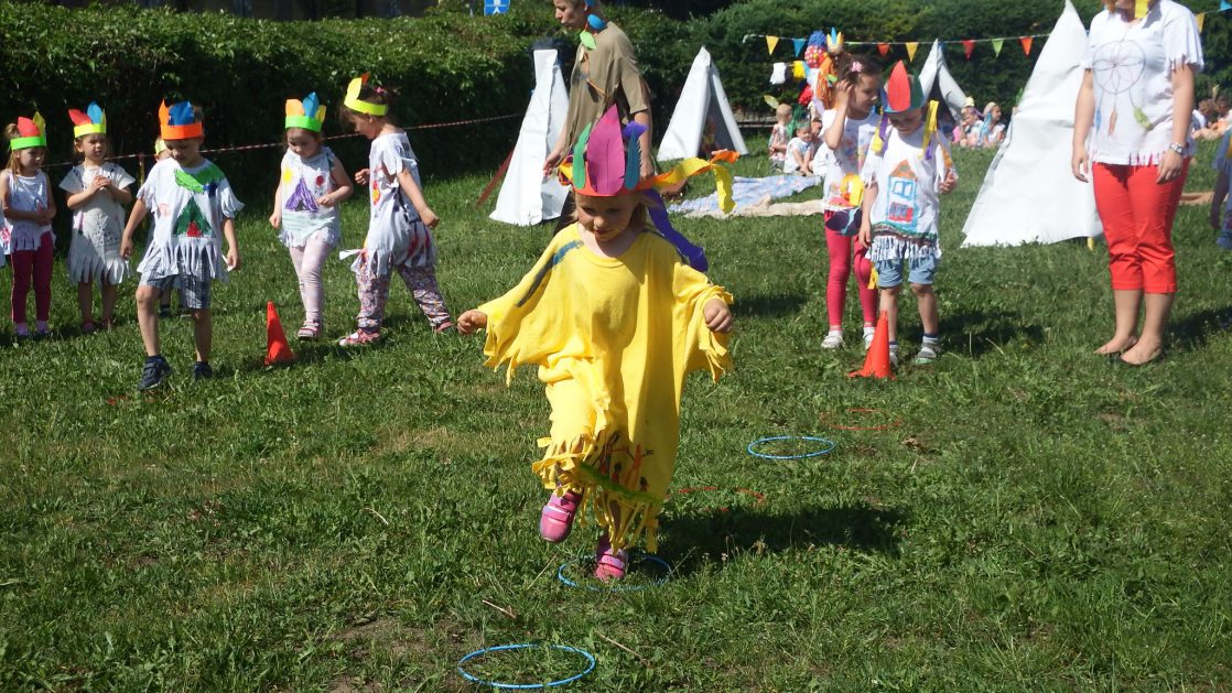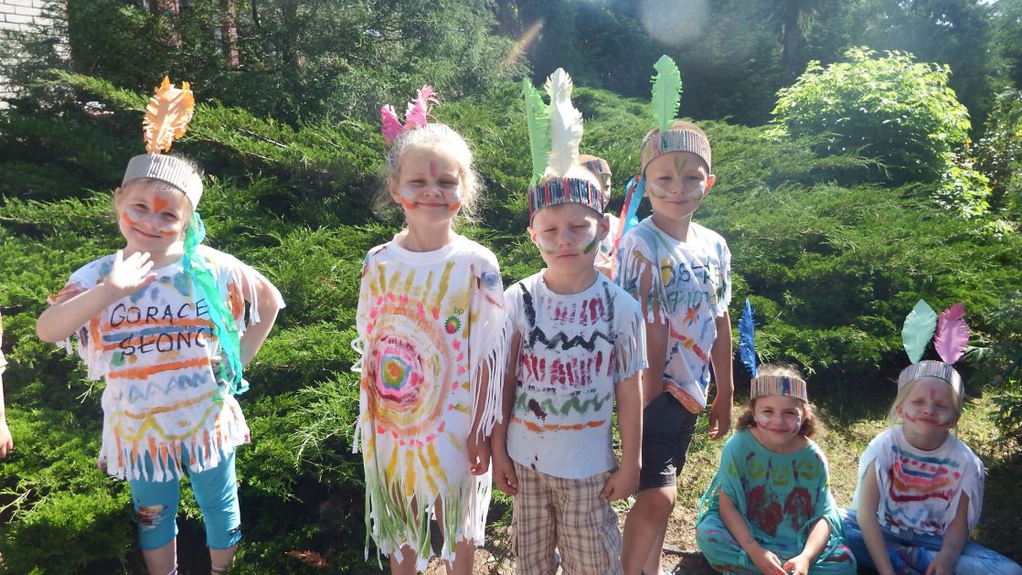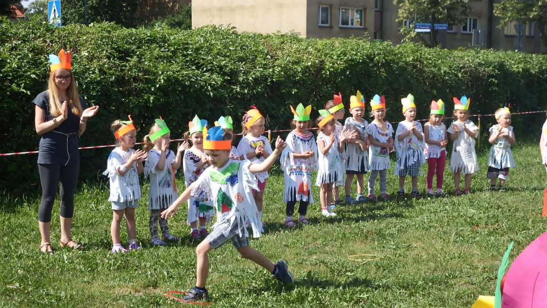 Święto wszystkich dzieci jest najbardziej wyczekiwanym przez przedszkolaków dniem w roku. W tym roku zaskoczyliśmy dzieci, bo ich święto trwało cały tydzień. Tematem przewodnim naszych działań była „Wioska Indiańska”. Każdego dnia były jakieś atrakcje, rozpoczęło się od szaleństwa na dmuchańcach, później były prezenty dla każdej grupy. Wiele radości sprawiło dzieciom szykowanie strojów Indiańskich, opasek i totemów grupowych. Dzieci bardzo angażowały się podczas malowania swoich koszulek, wymyślały indiańskie imiona. W piątek wesołą paradą i głośnymi okrzykami indiańskimi, dzieci z pomalowanymi buziami w barwach radości, udały się do ogrodu przedszkolnego, gdzie czekała na nich Wioska Indiańska. Przedszkolaki brały udział w tańcach, konkursach, malowaniu tipi dla swojej grupy.