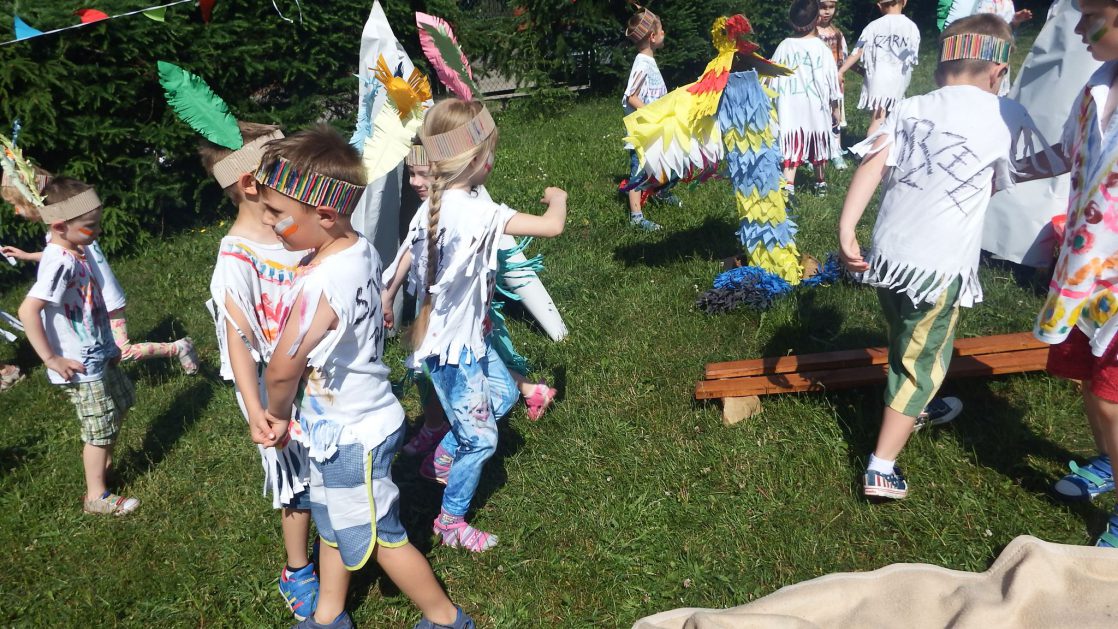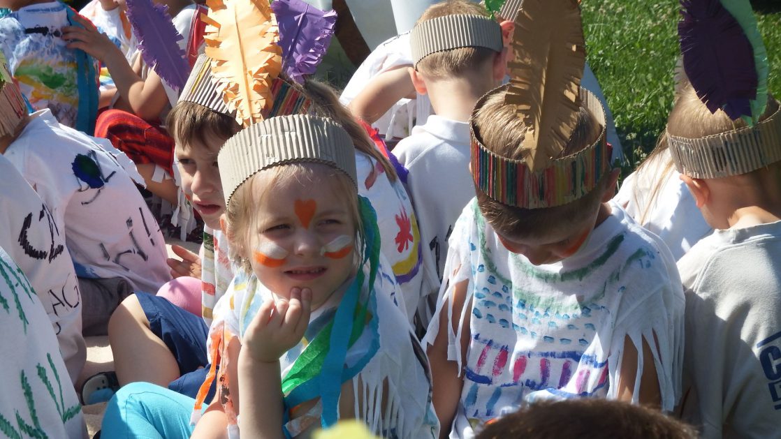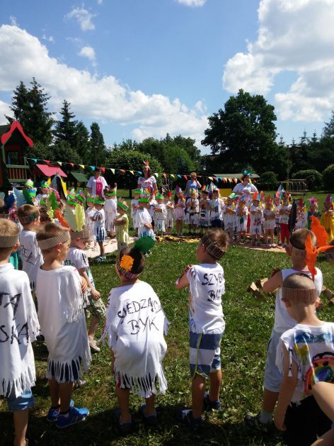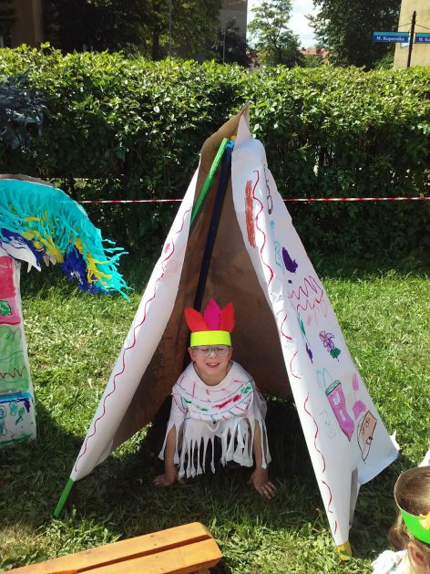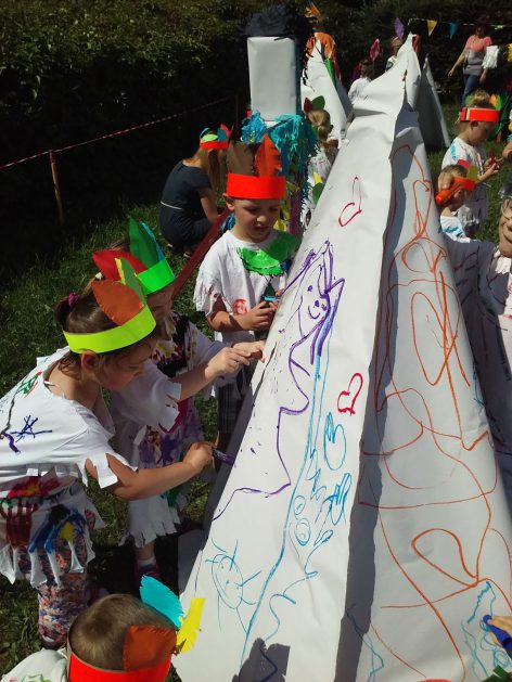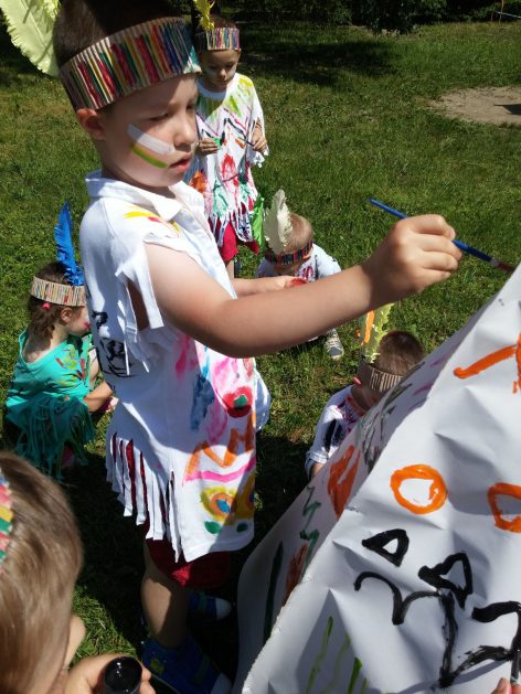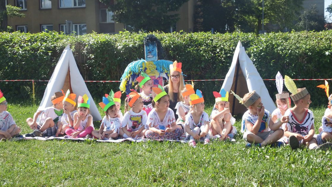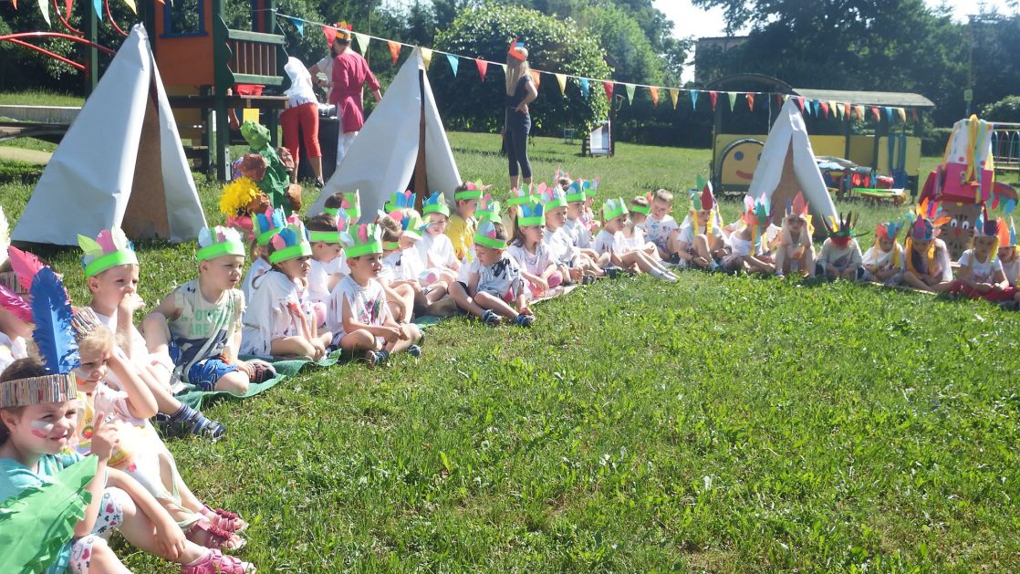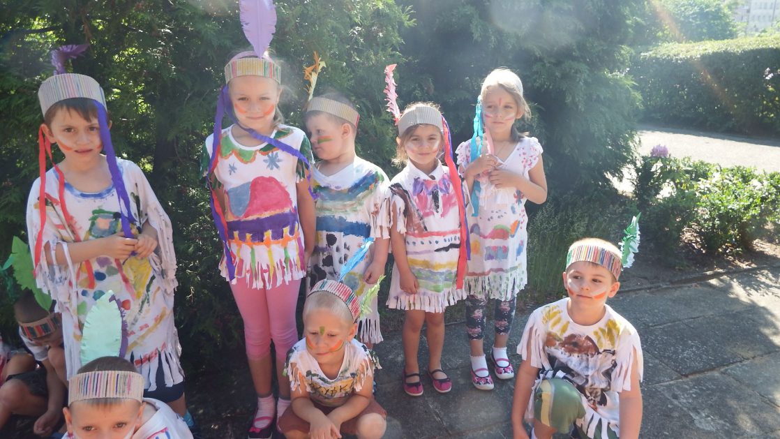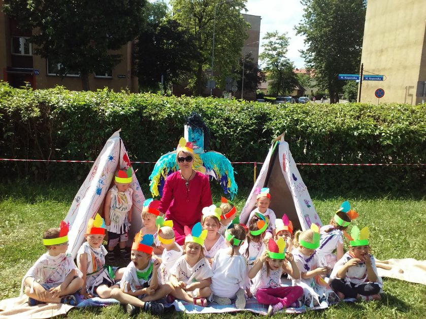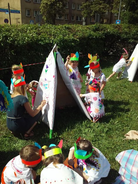 Święto wszystkich dzieci jest najbardziej wyczekiwanym przez przedszkolaków dniem w roku. W tym roku zaskoczyliśmy dzieci, bo ich święto trwało cały tydzień. Tematem przewodnim naszych działań była „Wioska Indiańska”. Każdego dnia były jakieś atrakcje, rozpoczęło się od szaleństwa na dmuchańcach, później były prezenty dla każdej grupy. Wiele radości sprawiło dzieciom szykowanie strojów Indiańskich, opasek i totemów grupowych. Dzieci bardzo angażowały się podczas malowania swoich koszulek, wymyślały indiańskie imiona. W piątek wesołą paradą i głośnymi okrzykami indiańskimi, dzieci z pomalowanymi buziami w barwach radości, udały się do ogrodu przedszkolnego, gdzie czekała na nich Wioska Indiańska. Przedszkolaki brały udział w tańcach, konkursach, malowaniu tipi dla swojej grupy.