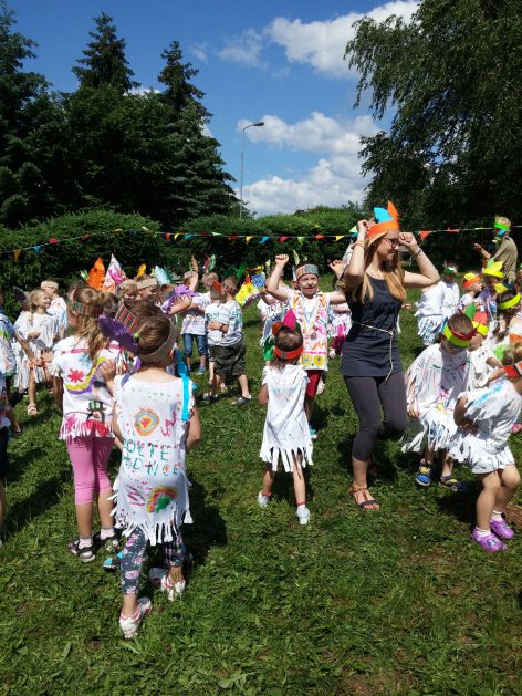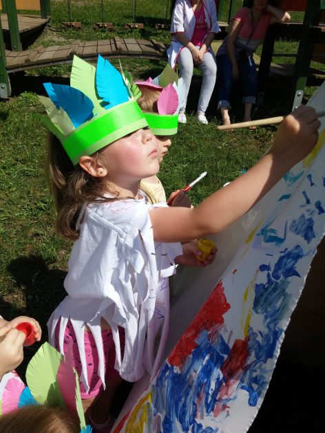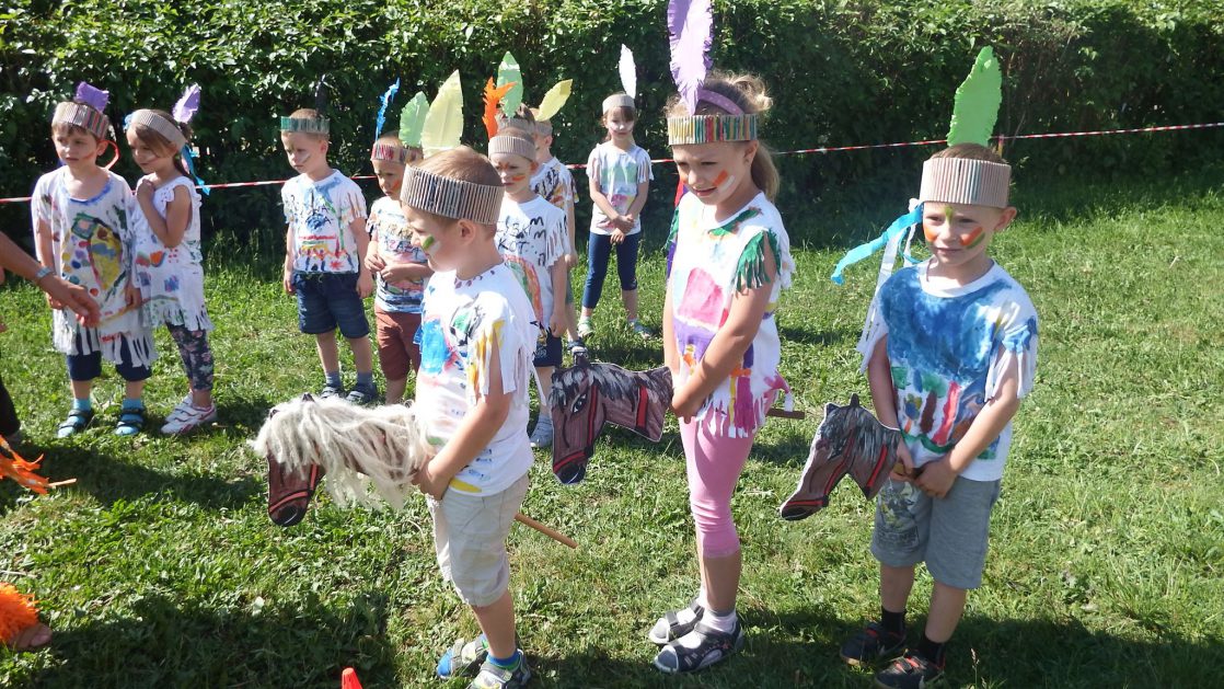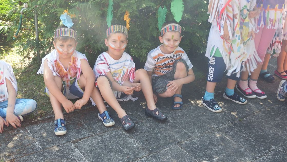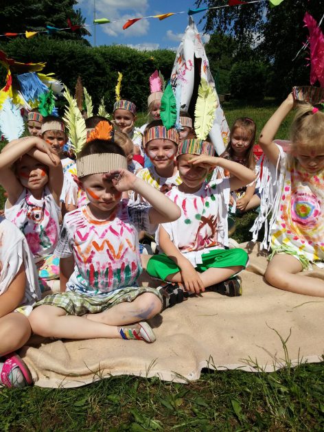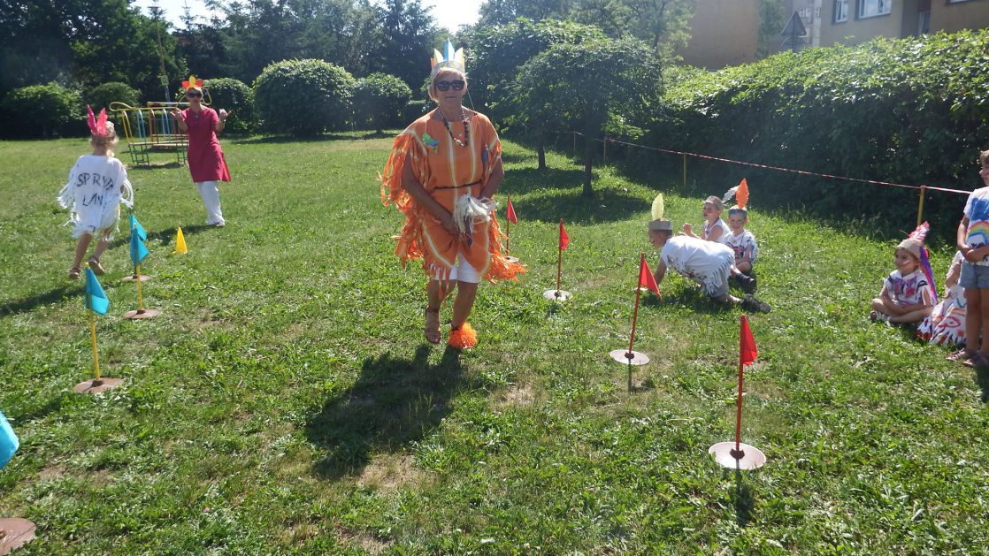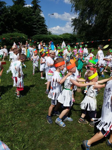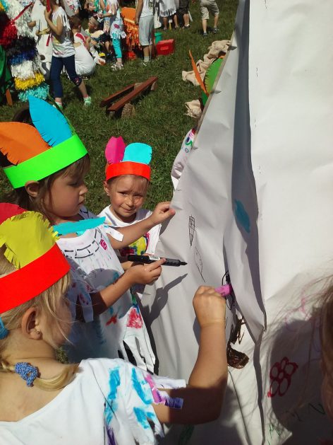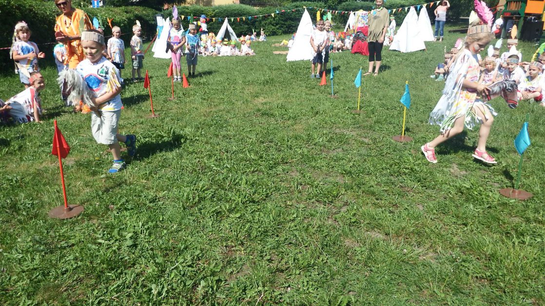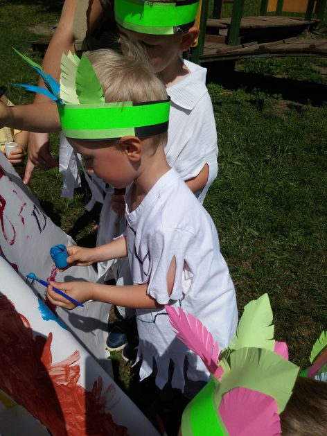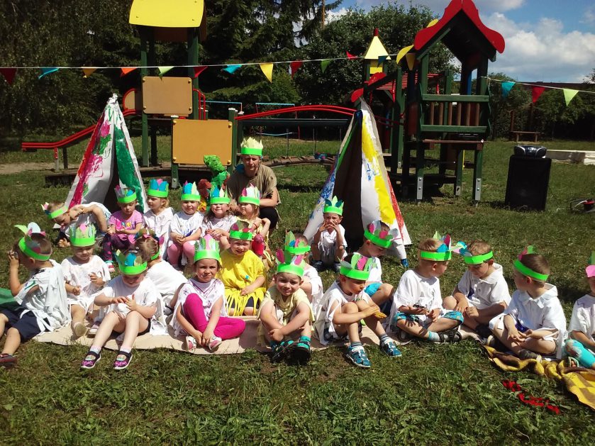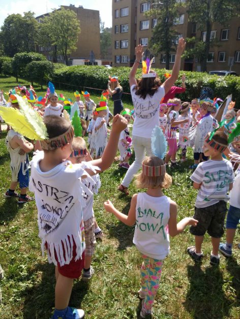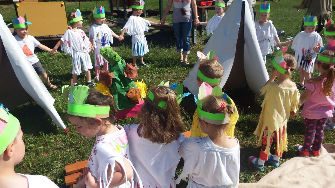 Święto wszystkich dzieci jest najbardziej wyczekiwanym przez przedszkolaków dniem w roku. W tym roku zaskoczyliśmy dzieci, bo ich święto trwało cały tydzień. Tematem przewodnim naszych działań była „Wioska Indiańska”. Każdego dnia były jakieś atrakcje, rozpoczęło się od szaleństwa na dmuchańcach, później były prezenty dla każdej grupy. Wiele radości sprawiło dzieciom szykowanie strojów Indiańskich, opasek i totemów grupowych. Dzieci bardzo angażowały się podczas malowania swoich koszulek, wymyślały indiańskie imiona. W piątek wesołą paradą i głośnymi okrzykami indiańskimi, dzieci z pomalowanymi buziami w barwach radości, udały się do ogrodu przedszkolnego, gdzie czekała na nich Wioska Indiańska. Przedszkolaki brały udział w tańcach, konkursach, malowaniu tipi dla swojej grupy.