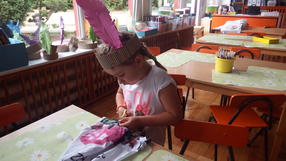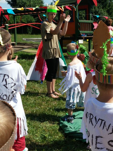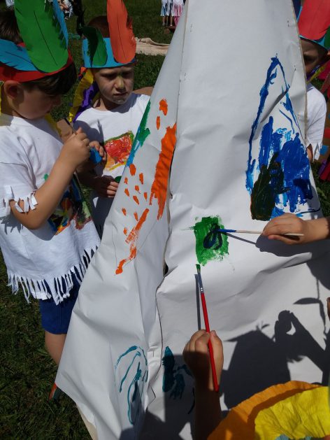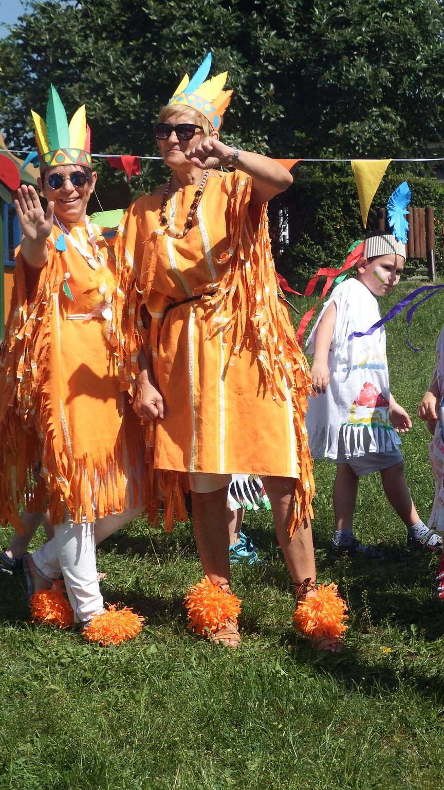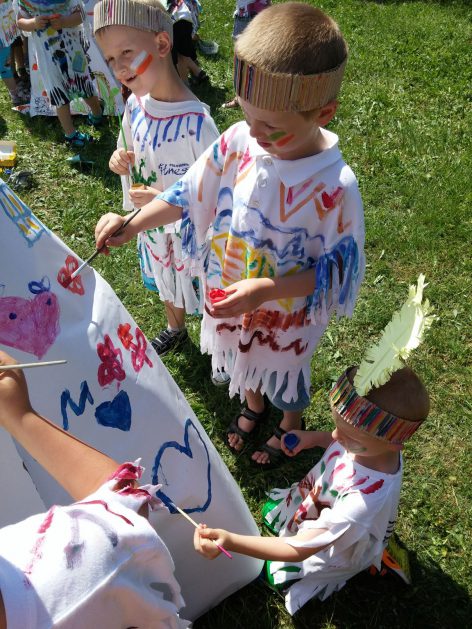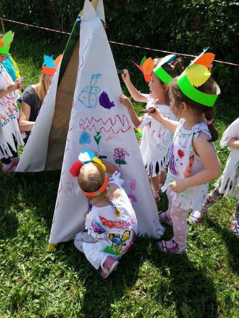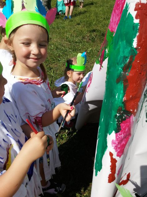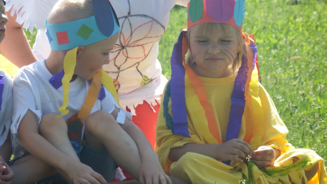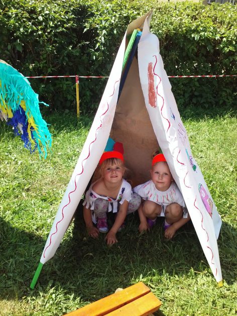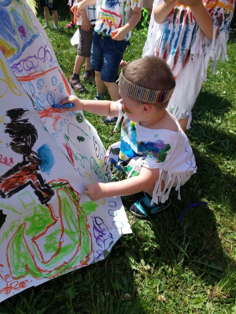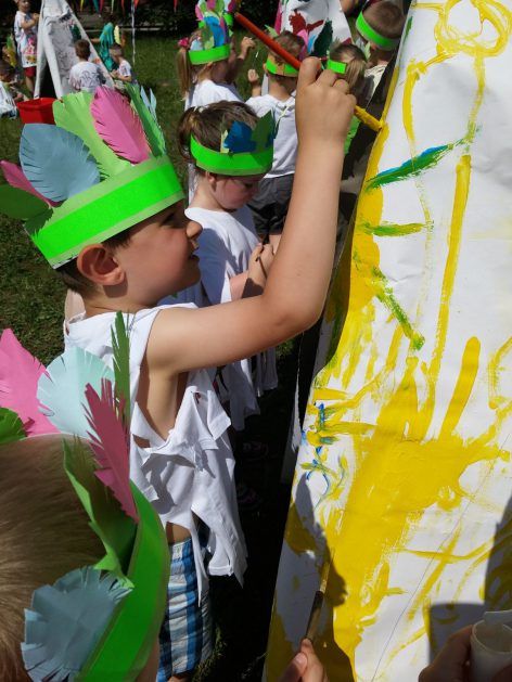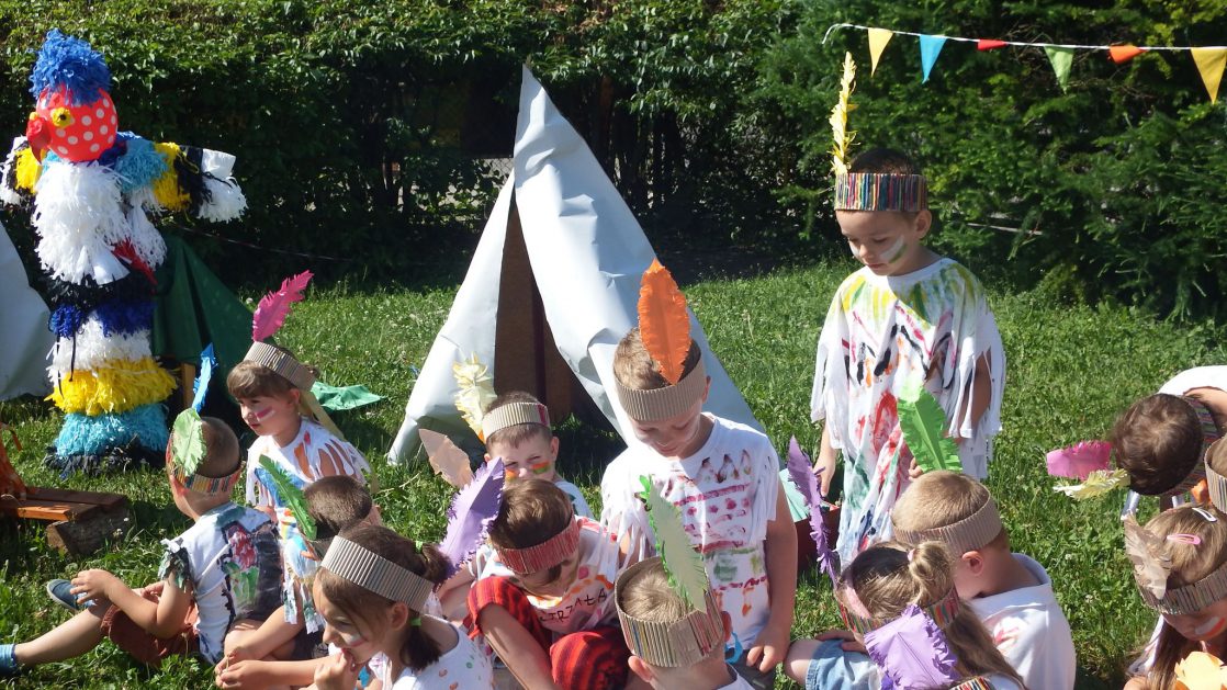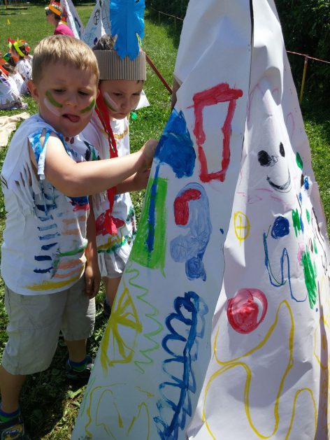 Święto wszystkich dzieci jest najbardziej wyczekiwanym przez przedszkolaków dniem w roku. W tym roku zaskoczyliśmy dzieci, bo ich święto trwało cały tydzień. Tematem przewodnim naszych działań była „Wioska Indiańska”. Każdego dnia były jakieś atrakcje, rozpoczęło się od szaleństwa na dmuchańcach, później były prezenty dla każdej grupy. Wiele radości sprawiło dzieciom szykowanie strojów Indiańskich, opasek i totemów grupowych. Dzieci bardzo angażowały się podczas malowania swoich koszulek, wymyślały indiańskie imiona. W piątek wesołą paradą i głośnymi okrzykami indiańskimi, dzieci z pomalowanymi buziami w barwach radości, udały się do ogrodu przedszkolnego, gdzie czekała na nich Wioska Indiańska. Przedszkolaki brały udział w tańcach, konkursach, malowaniu tipi dla swojej grupy.