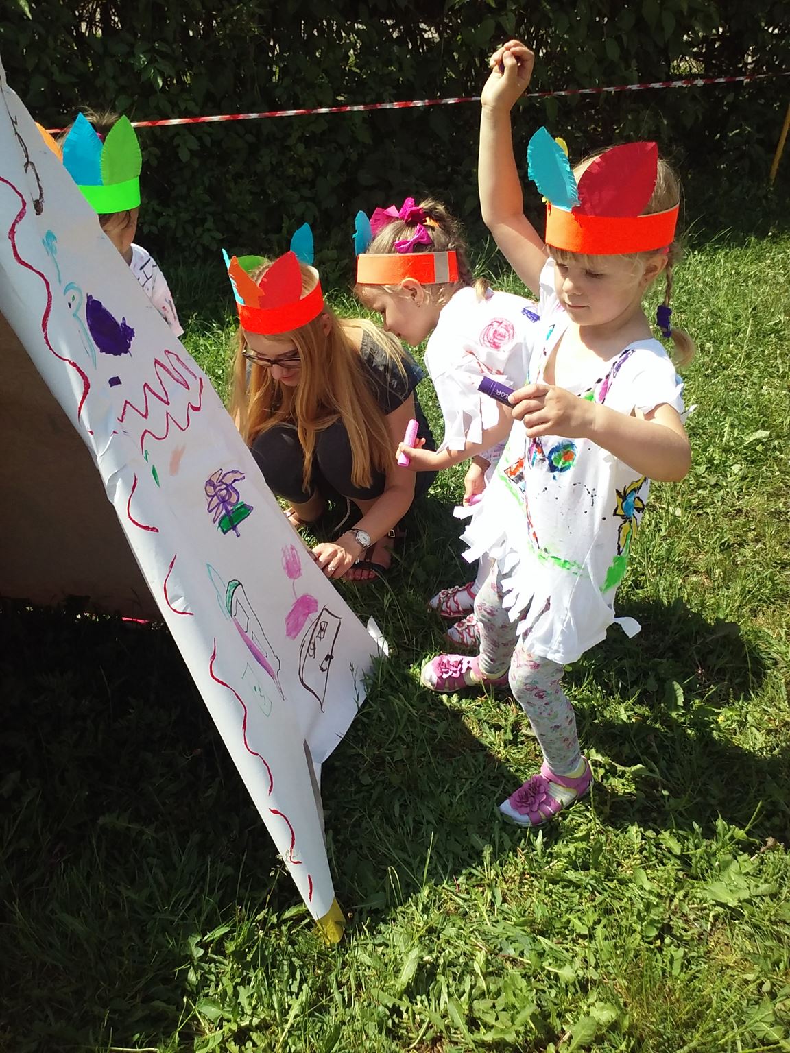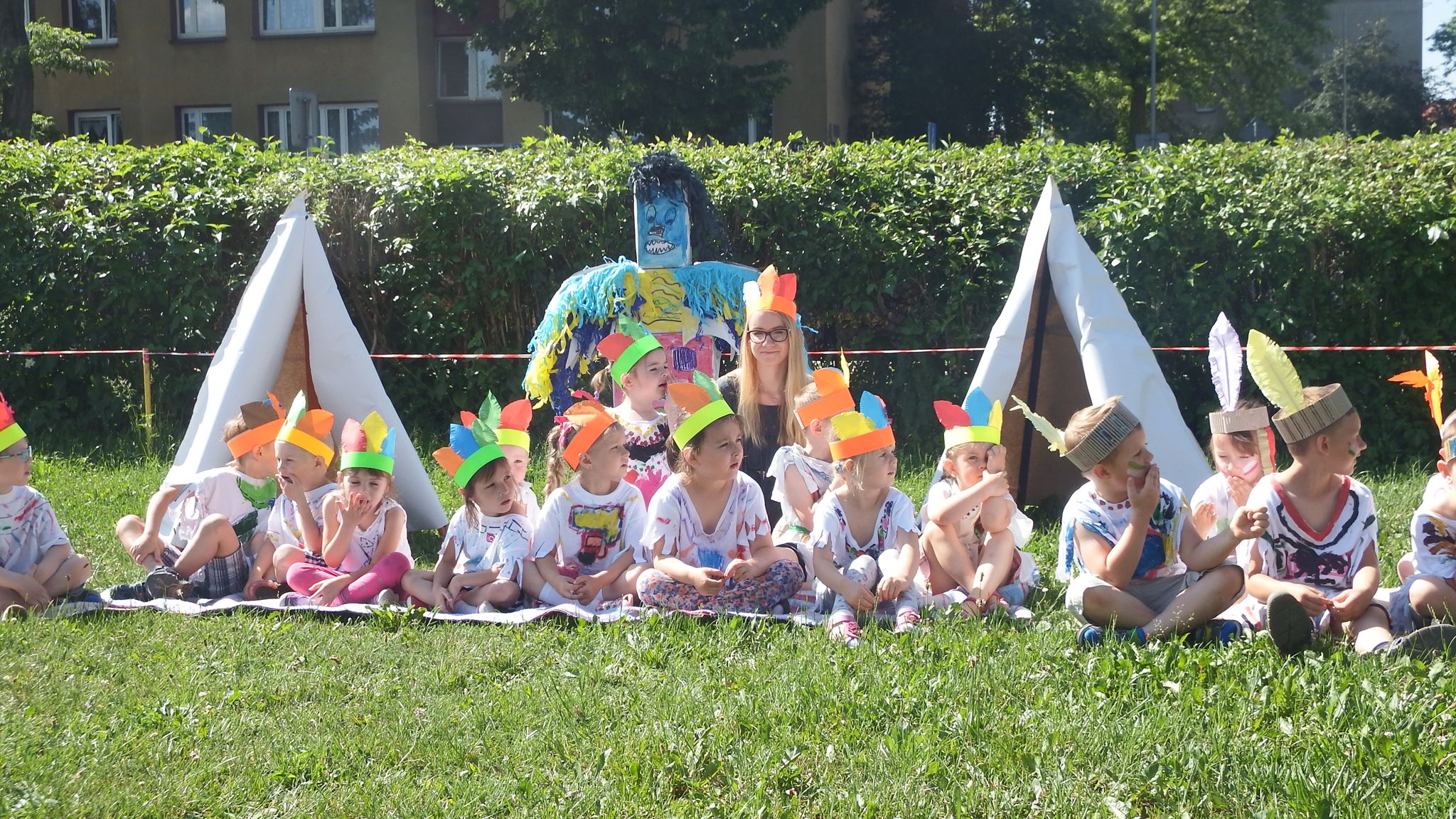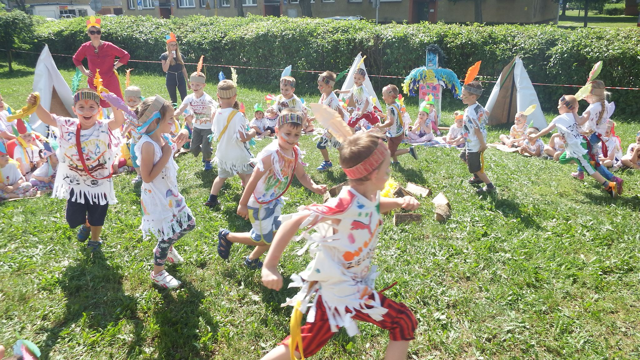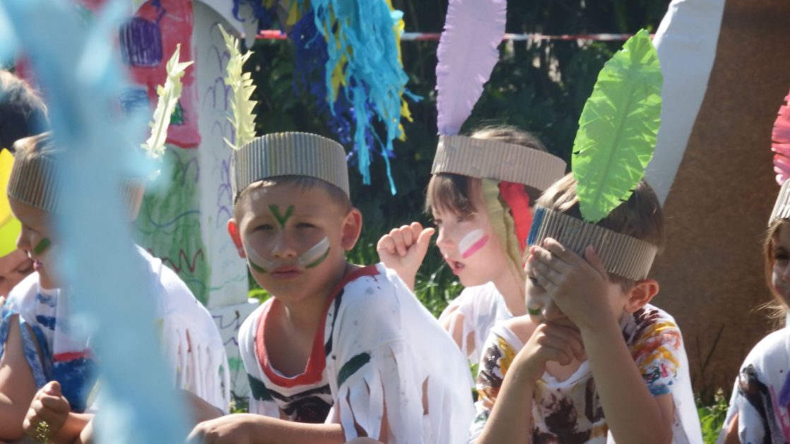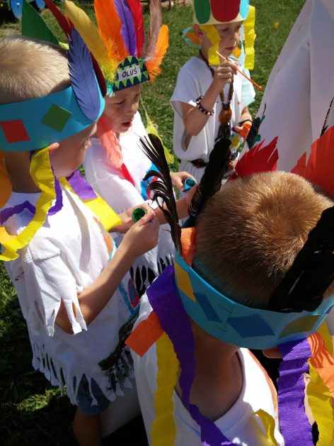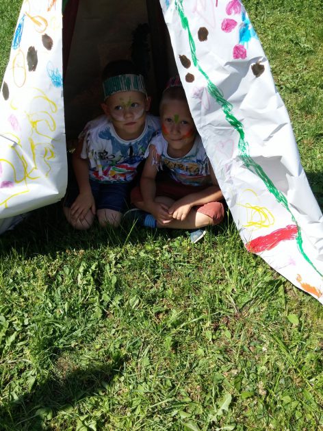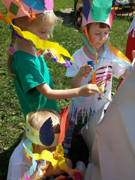 Święto wszystkich dzieci jest najbardziej wyczekiwanym przez przedszkolaków dniem w roku. W tym roku zaskoczyliśmy dzieci, bo ich święto trwało cały tydzień. Tematem przewodnim naszych działań była „Wioska Indiańska”. Każdego dnia były jakieś atrakcje, rozpoczęło się od szaleństwa na dmuchańcach, później były prezenty dla każdej grupy. Wiele radości sprawiło dzieciom szykowanie strojów Indiańskich, opasek i totemów grupowych. Dzieci bardzo angażowały się podczas malowania swoich koszulek, wymyślały indiańskie imiona. W piątek wesołą paradą i głośnymi okrzykami indiańskimi, dzieci z pomalowanymi buziami w barwach radości, udały się do ogrodu przedszkolnego, gdzie czekała na nich Wioska Indiańska. Przedszkolaki brały udział w tańcach, konkursach, malowaniu tipi dla swojej grupy.