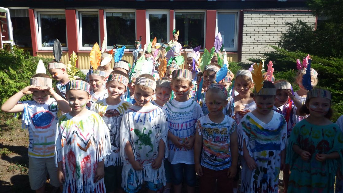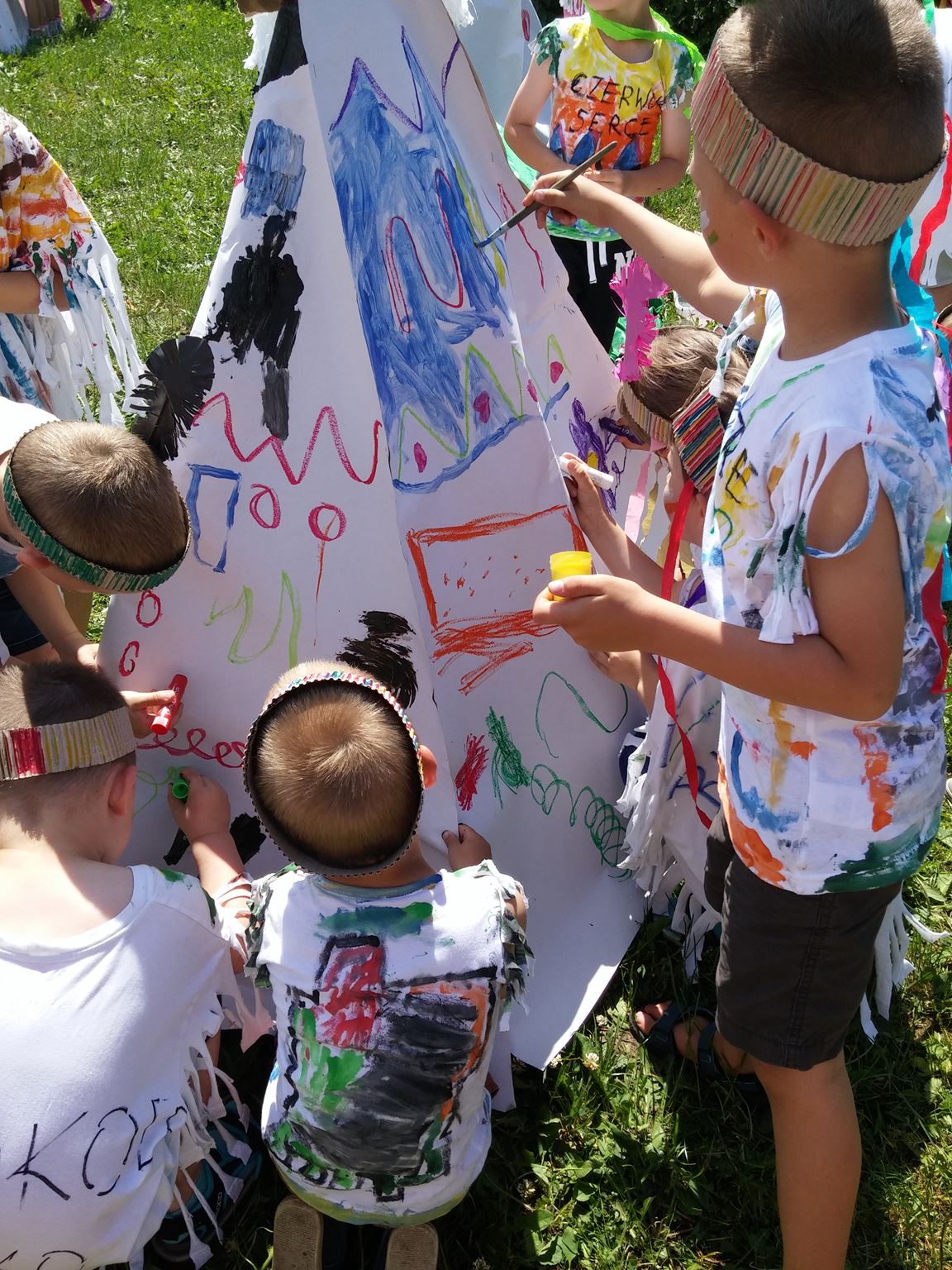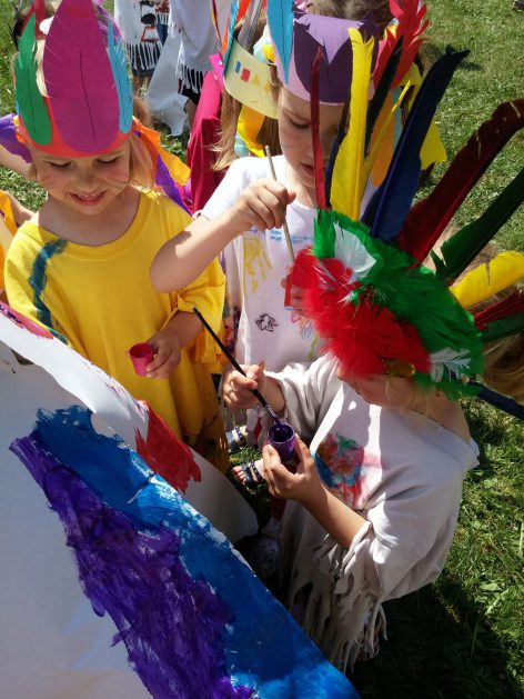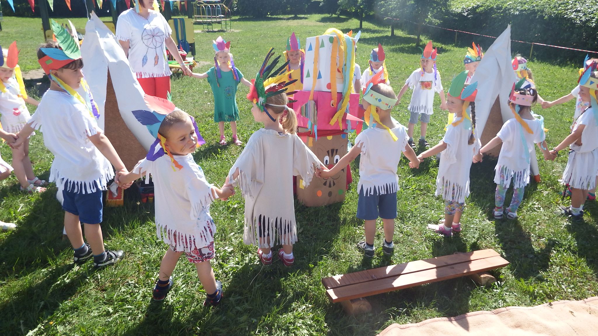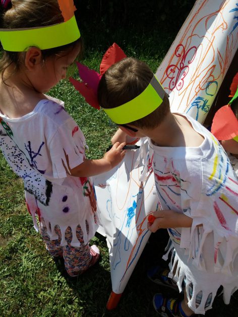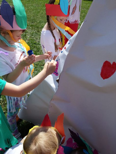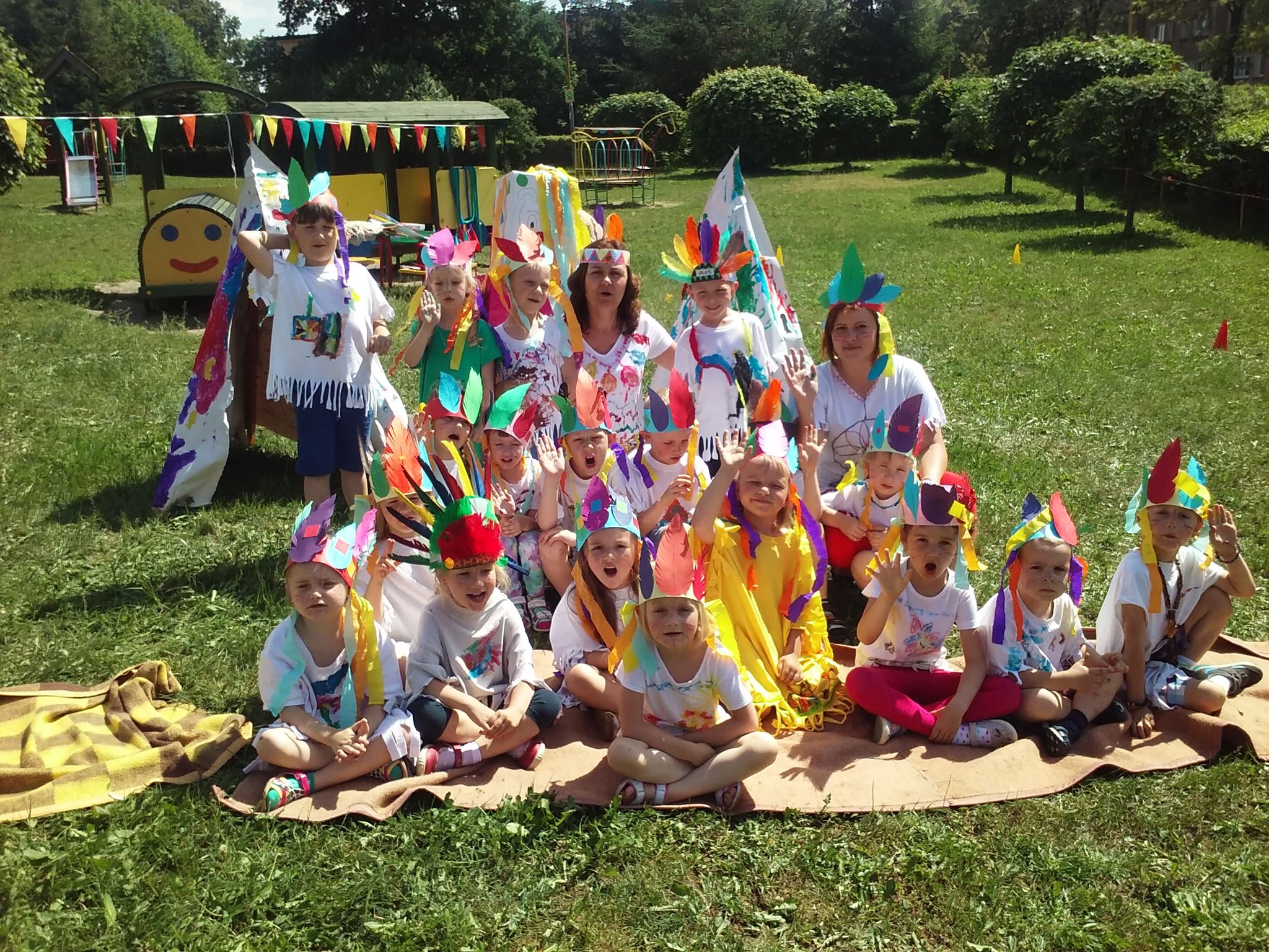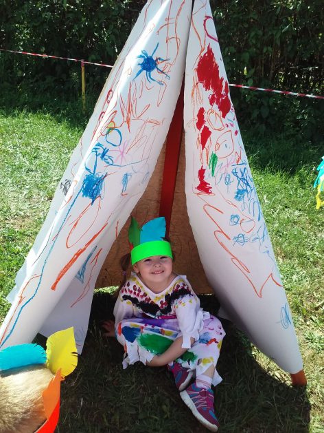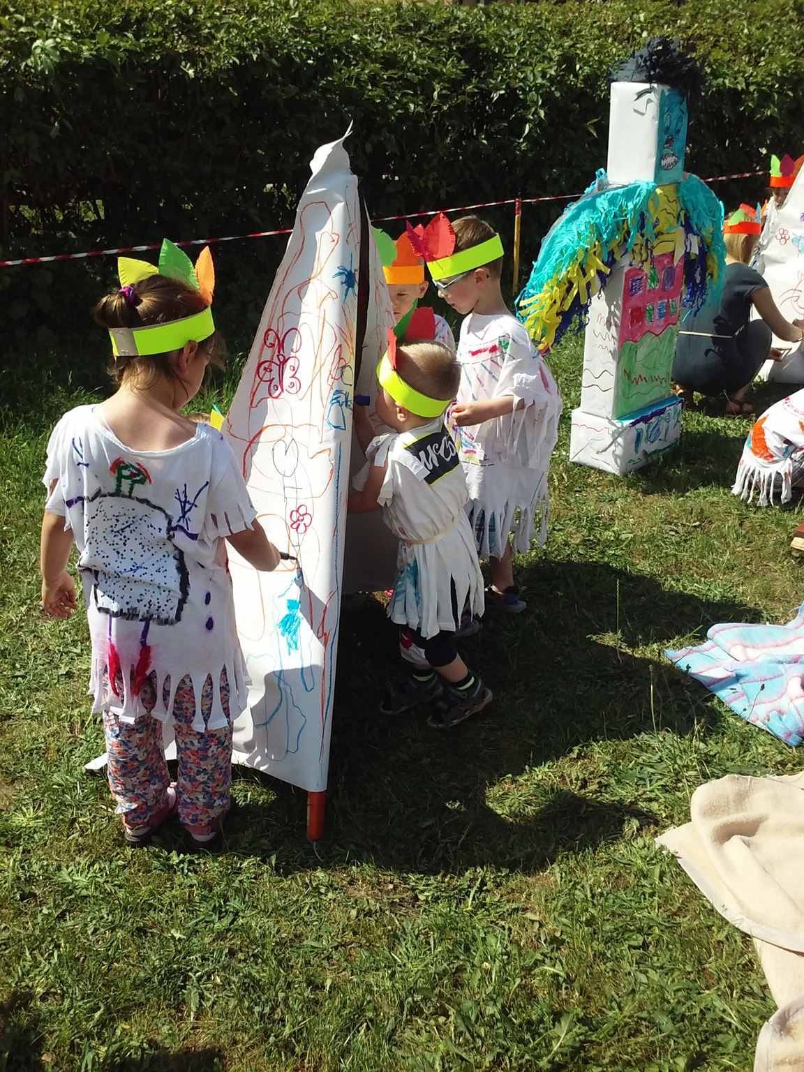 Święto wszystkich dzieci jest najbardziej wyczekiwanym przez przedszkolaków dniem w roku. W tym roku zaskoczyliśmy dzieci, bo ich święto trwało cały tydzień. Tematem przewodnim naszych działań była „Wioska Indiańska”. Każdego dnia były jakieś atrakcje, rozpoczęło się od szaleństwa na dmuchańcach, później były prezenty dla każdej grupy. Wiele radości sprawiło dzieciom szykowanie strojów Indiańskich, opasek i totemów grupowych. Dzieci bardzo angażowały się podczas malowania swoich koszulek, wymyślały indiańskie imiona. W piątek wesołą paradą i głośnymi okrzykami indiańskimi, dzieci z pomalowanymi buziami w barwach radości, udały się do ogrodu przedszkolnego, gdzie czekała na nich Wioska Indiańska. Przedszkolaki brały udział w tańcach, konkursach, malowaniu tipi dla swojej grupy.