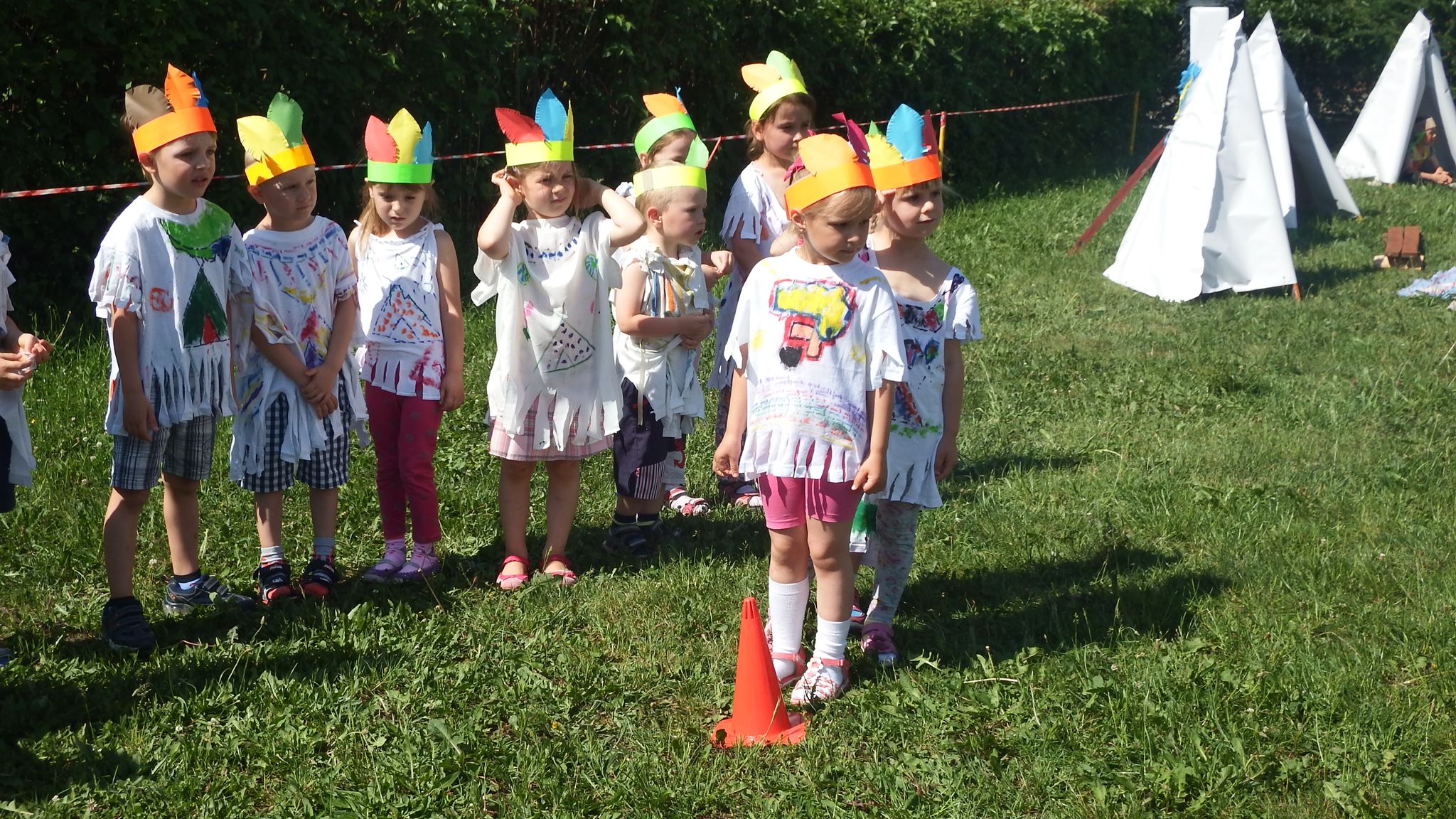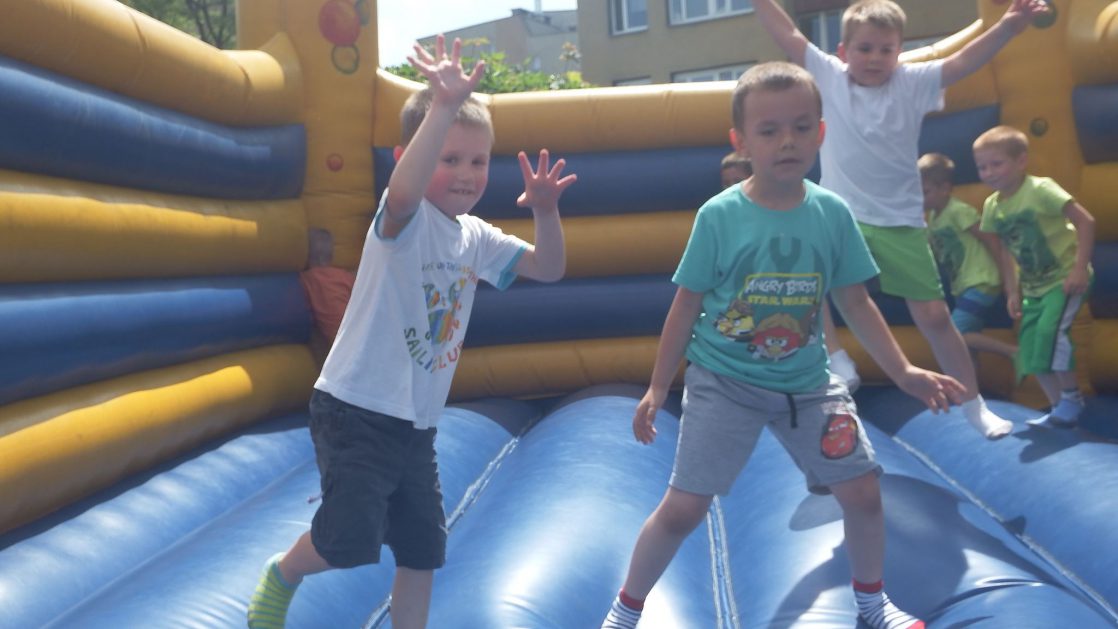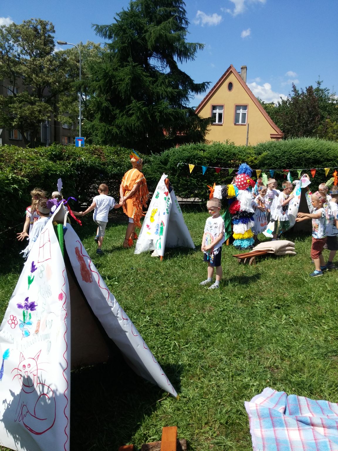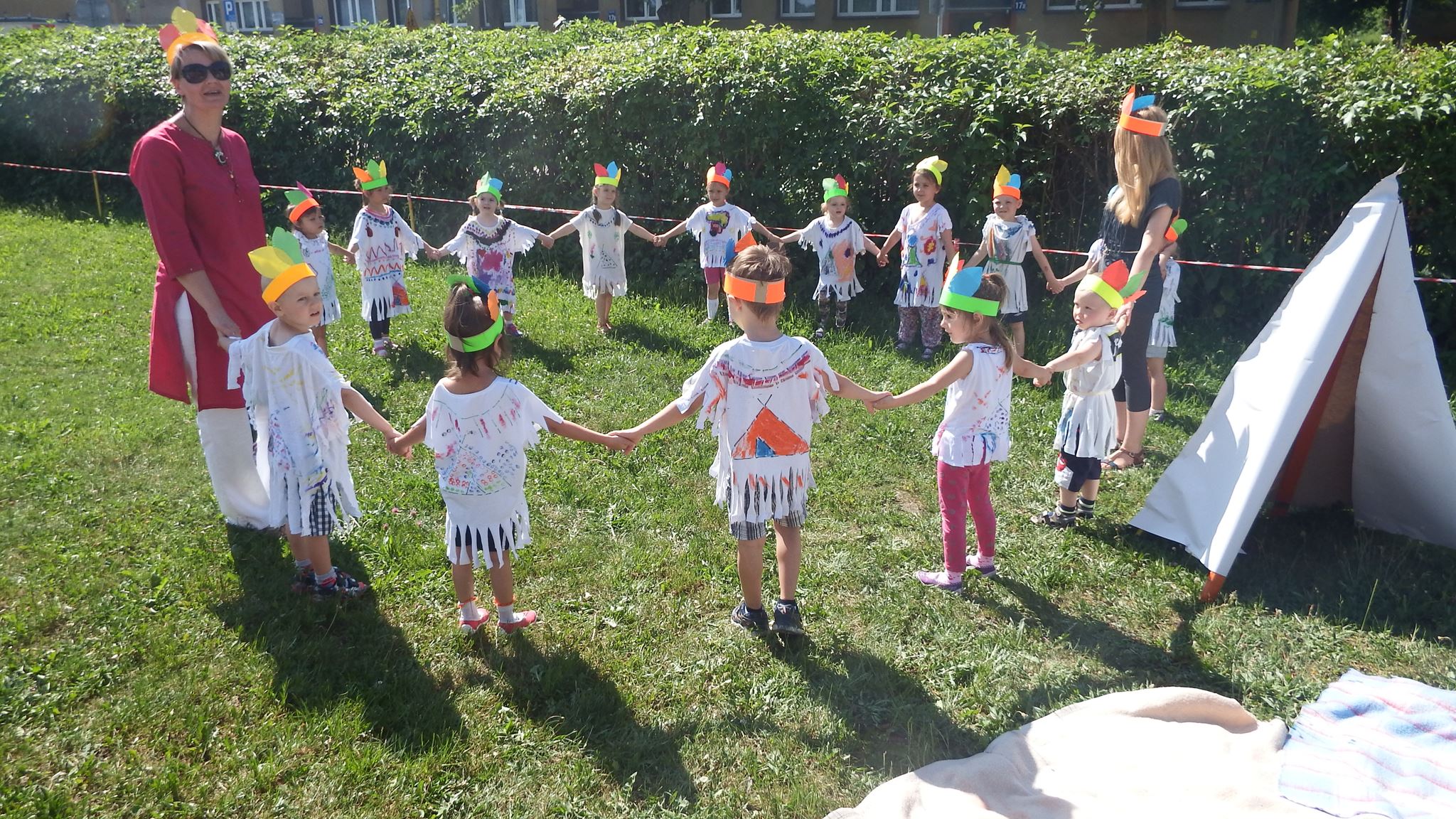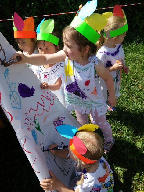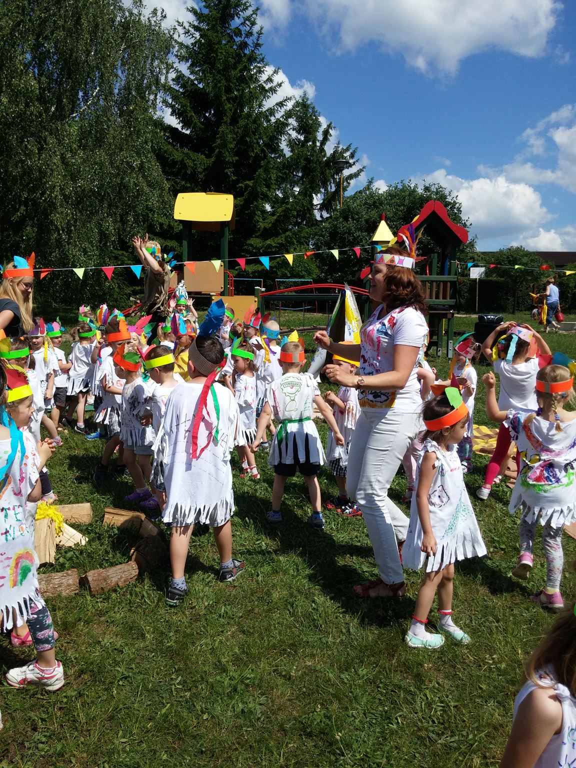 Święto wszystkich dzieci jest najbardziej wyczekiwanym przez przedszkolaków dniem w roku. W tym roku zaskoczyliśmy dzieci, bo ich święto trwało cały tydzień. Tematem przewodnim naszych działań była „Wioska Indiańska”. Każdego dnia były jakieś atrakcje, rozpoczęło się od szaleństwa na dmuchańcach, później były prezenty dla każdej grupy. Wiele radości sprawiło dzieciom szykowanie strojów Indiańskich, opasek i totemów grupowych. Dzieci bardzo angażowały się podczas malowania swoich koszulek, wymyślały indiańskie imiona. W piątek wesołą paradą i głośnymi okrzykami indiańskimi, dzieci z pomalowanymi buziami w barwach radości, udały się do ogrodu przedszkolnego, gdzie czekała na nich Wioska Indiańska. Przedszkolaki brały udział w tańcach, konkursach, malowaniu tipi dla swojej grupy.