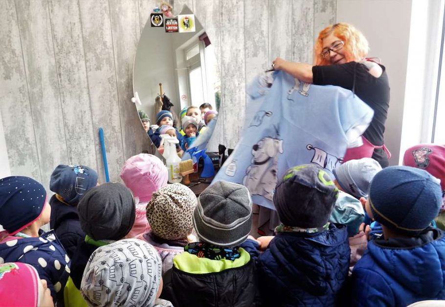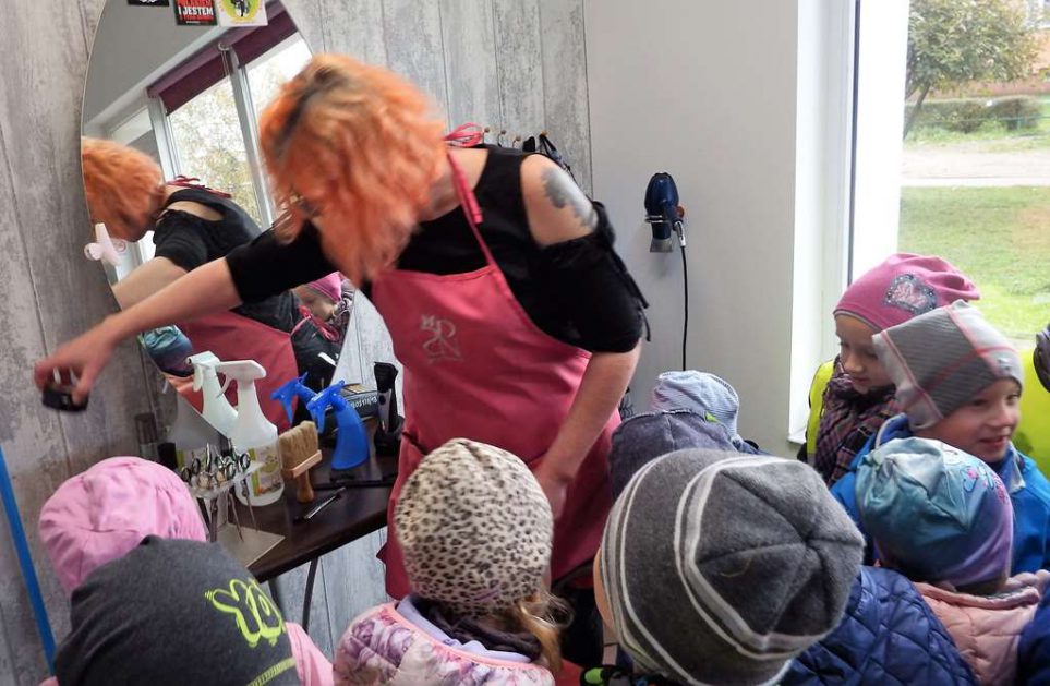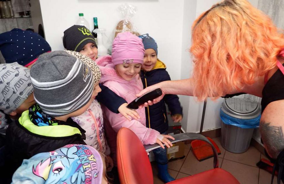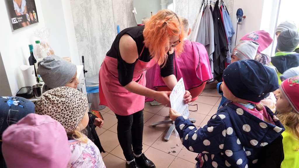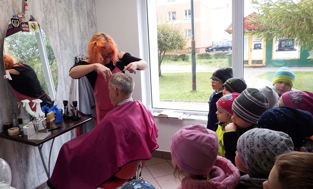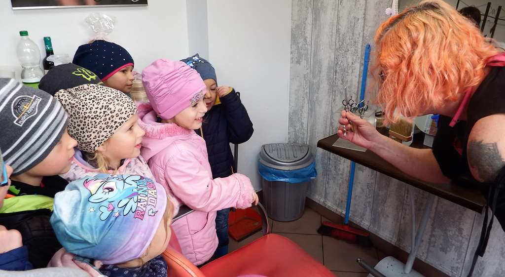 Dzieci z grupy 5-6-latków odwiedziły salon fryzjerski. Przedszkolaki mogły zobaczyć na czym polega praca fryzjerki. Miały możliwość przyjrzeć się z bliska pracy fryzjerki: strzyżenia i modelowania włosów, a także mogły zapoznać się z wyposażeniem zakładu.