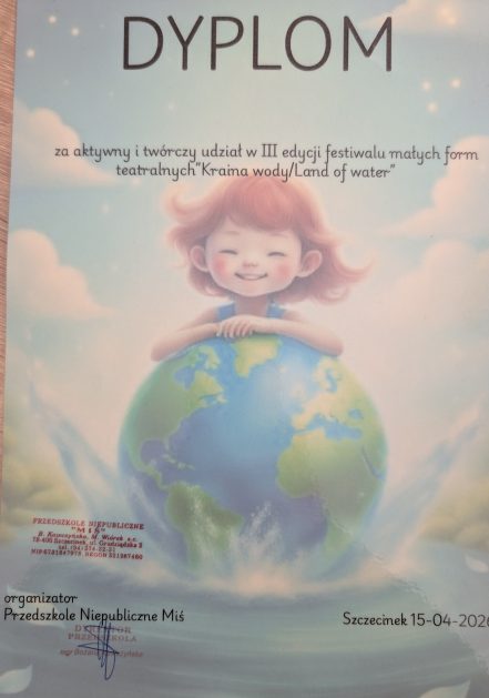 15 marca 6 latki brały udział w III Festiwalu Małych Form Teatralnych pt. „Kraina wody – Land of water” organizowanym przez Przedszkole Niepubliczne „Miś” pod patronatem Kronospan Szczecinek. Sala szczecineckiego Krono Design Center powitała małych aktorów z różnych szczecineckich przedszkoli. Do konkursu zgłosiły się: Przedszkole Niepubliczne „Bajka”, „U Cioci Gosi”, „Słoneczko” i „Miś”, a także Przedszkole Publiczne im. Kornela Makuszyńskiego, Szkoła Podstawowa nr 6 oraz Szkoła Społeczna STO. Mali artyści zaprezentowali na scenie spektakle, które nie tylko bawiły, ale również niosły ważne przesłanie ekologiczne. Festiwal miał charakter nie tylko artystyczny, ale także edukacyjny i społeczny. Udział w takich spotkaniach stanowi doskonałą okazję do integracji lokalnego środowiska – dzieci, nauczycieli, rodziców i tworzy przyjemną atmosferę życzliwości.